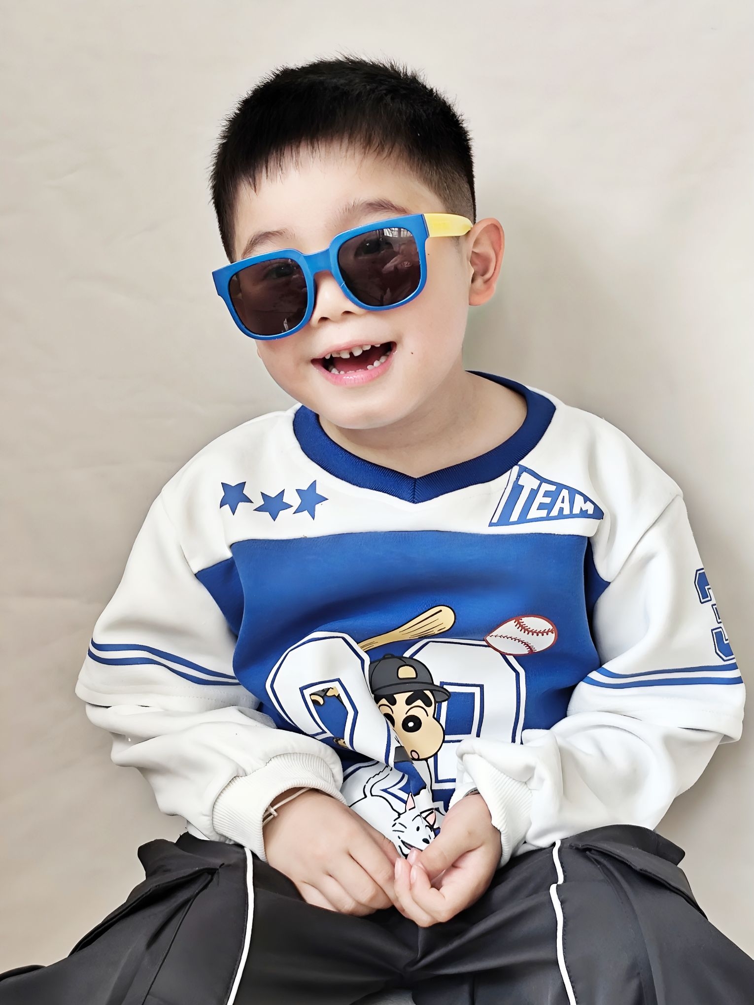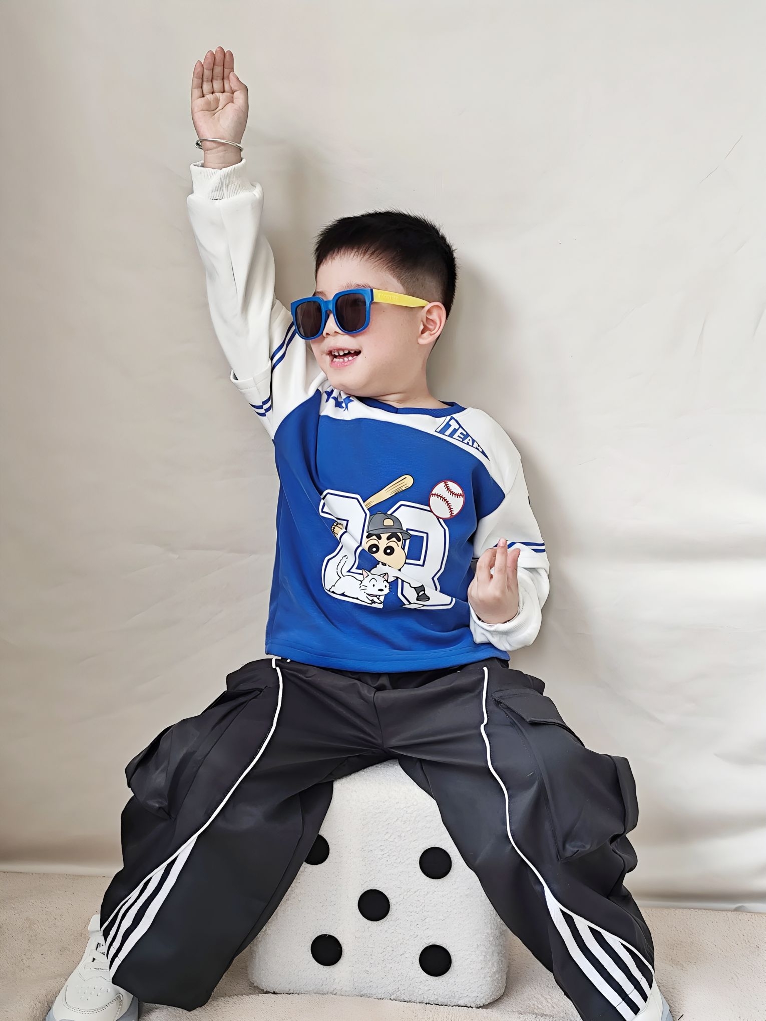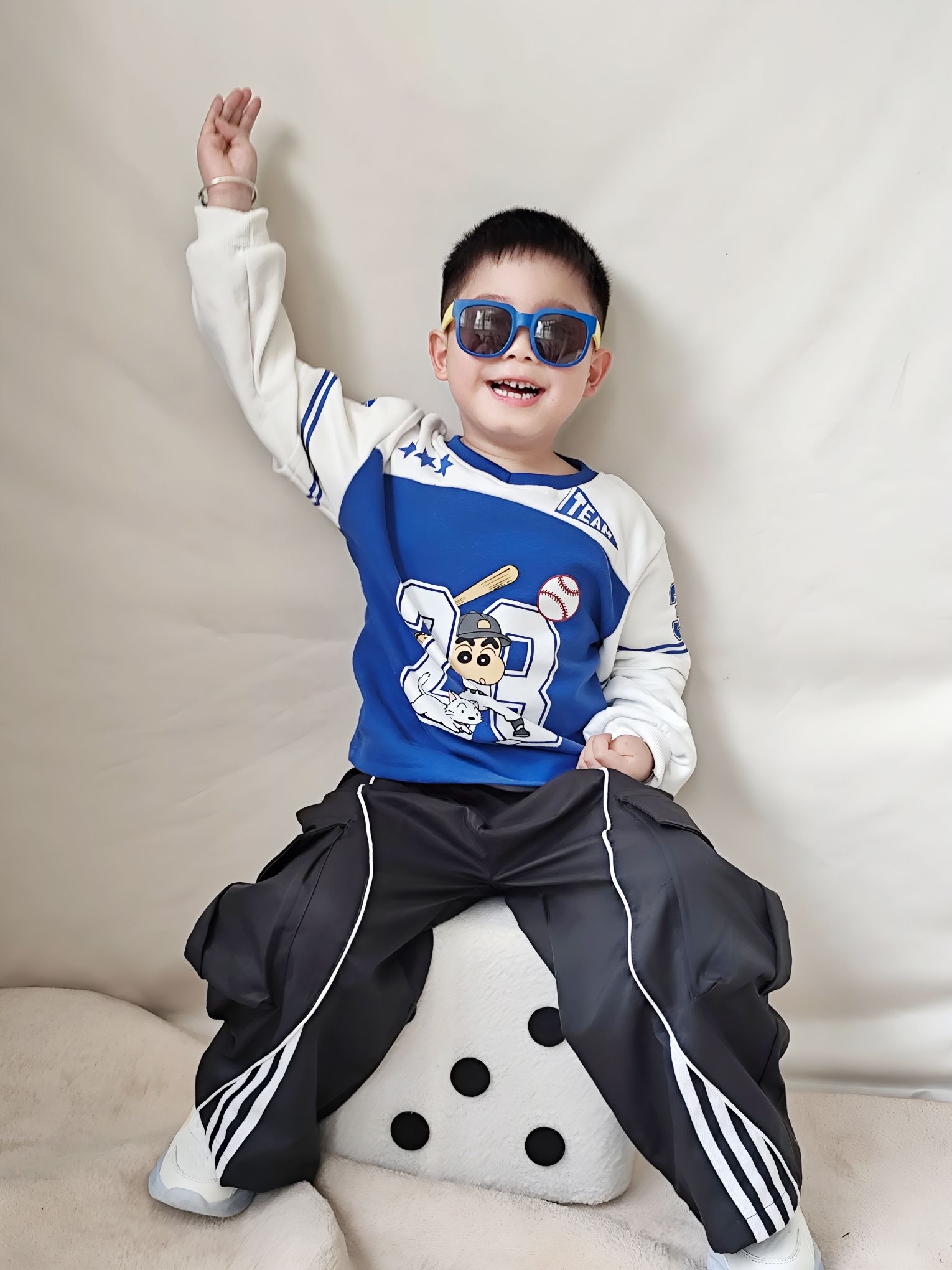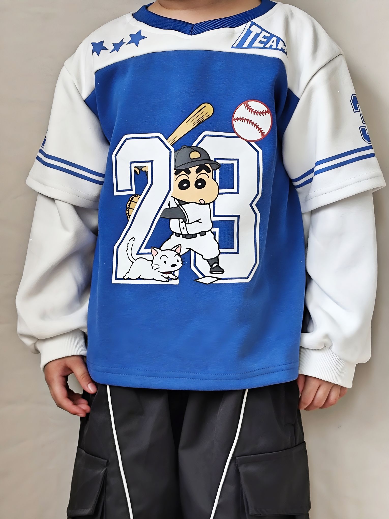 谁懂啊!给我家宸宝买的这套运动风穿搭,直接帅到我心坎里了😊 ✅ 上衣细节&穿着感受 这件蜡笔小新假两件棒球服真的挖到宝了! - 蓝白撞色巨显白,黄皮宝宝也能轻松驾驭,穿上直接白两个度 - 假两件设计太省心了,不用费心搭配,自带层次感,袖口的白边和条纹,氛围感直接拉满 - 面料是软软的棉感,不是那种硬邦邦的印花,宸宝穿了一下午,跑跳出汗也没闷汗,贴肤不扎,完全没有抗拒穿 - 上面的棒球小新印花超清晰...
