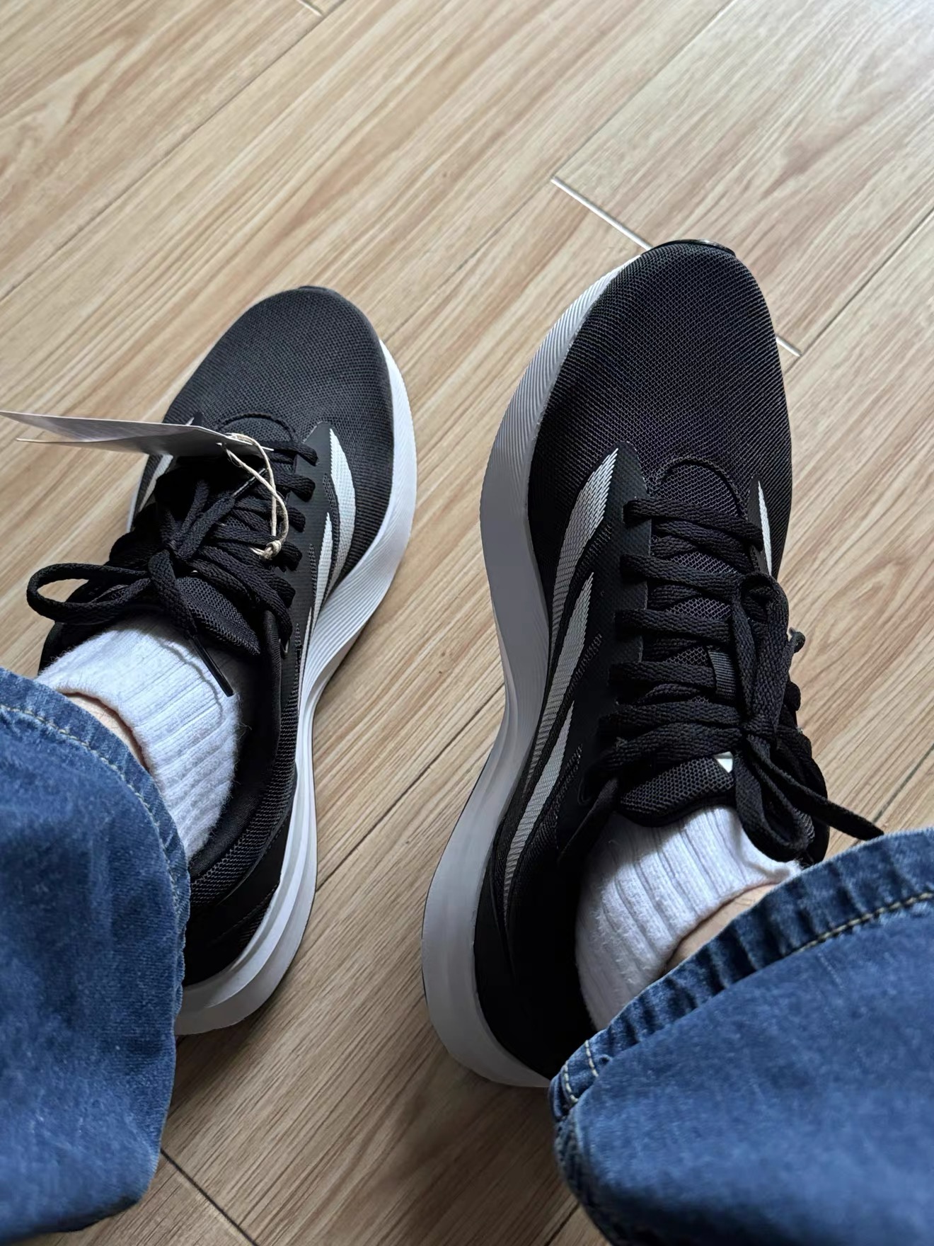 体育中考/日常跑步,这双阿迪Duramo RC跑鞋闭眼冲! 轻量化网面设计,跑起来不压脚,鞋底缓震够稳,跑800/1000米脚感超舒服。 防滑耐磨大底,操场跑道、日常路面都能hold住,经典黑白配色,运动穿搭也不违和。 关键是价格真的友好,学生党也能轻松拿下,性价比直接拉满,运动和日常穿都合适!