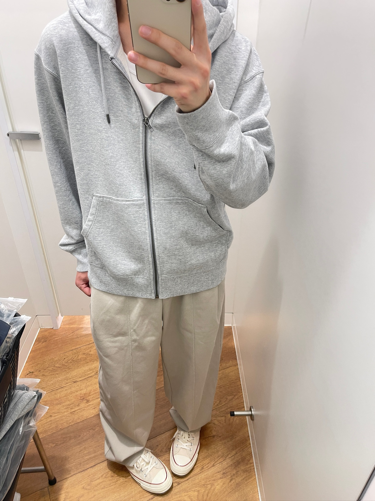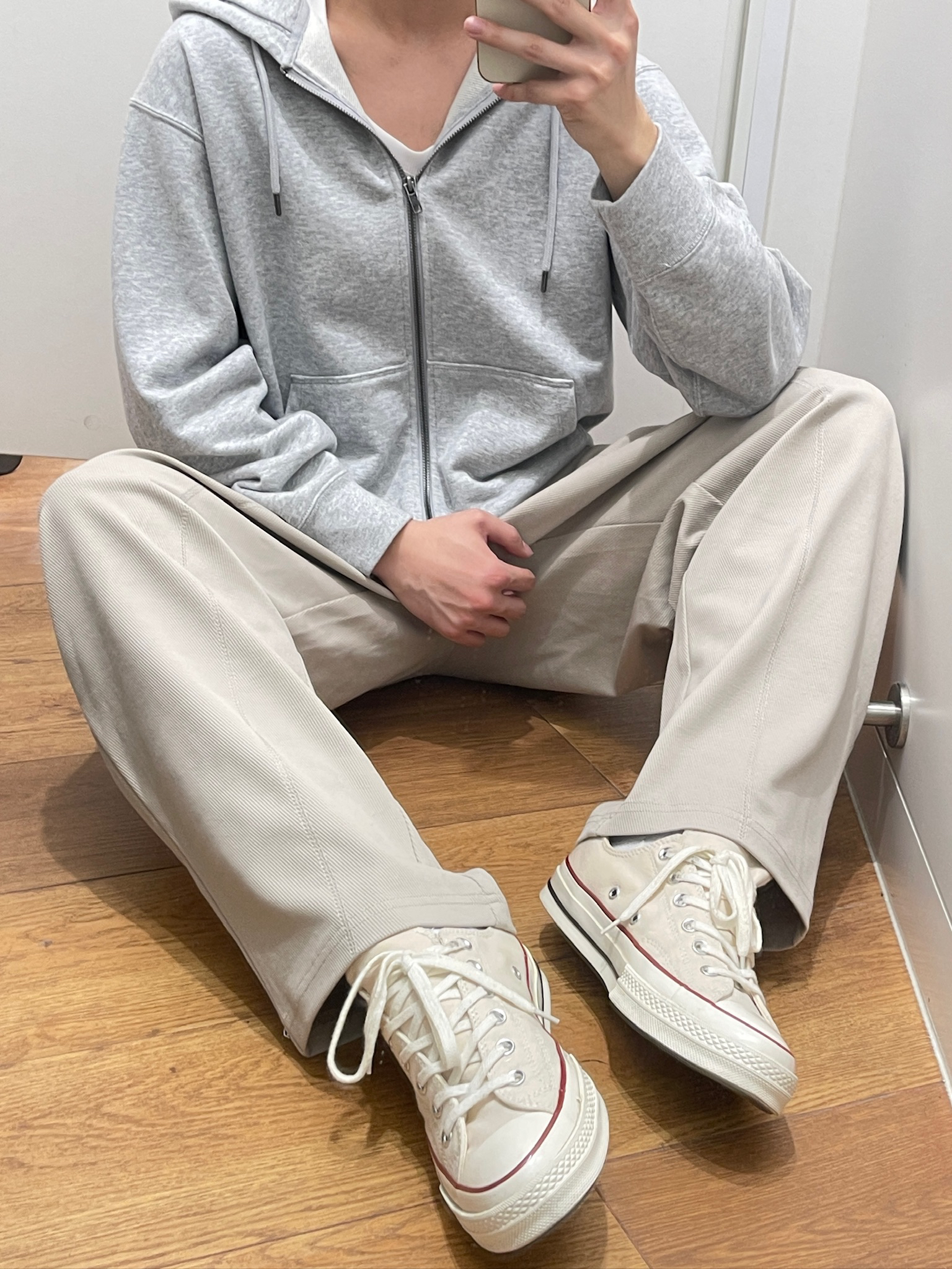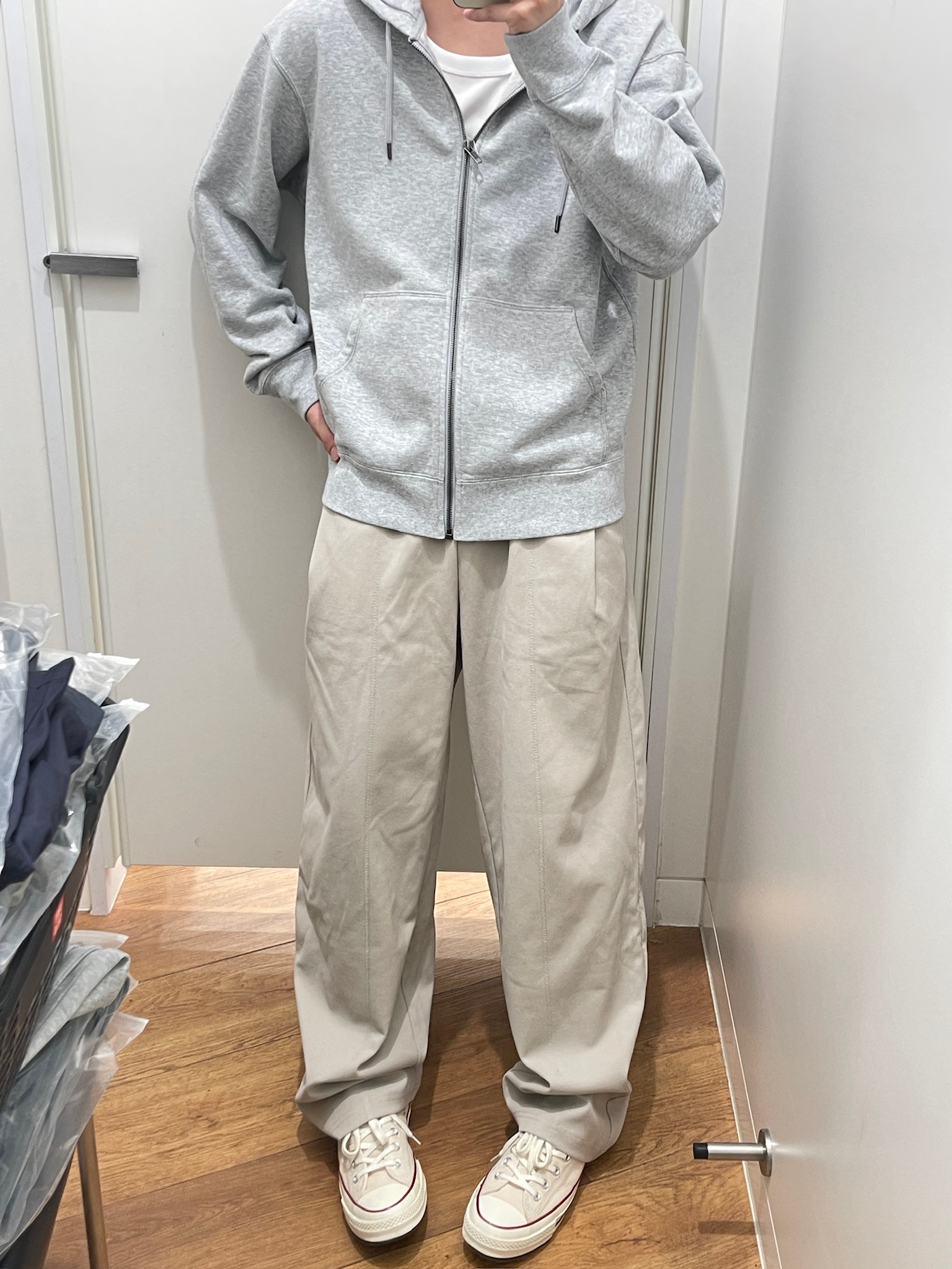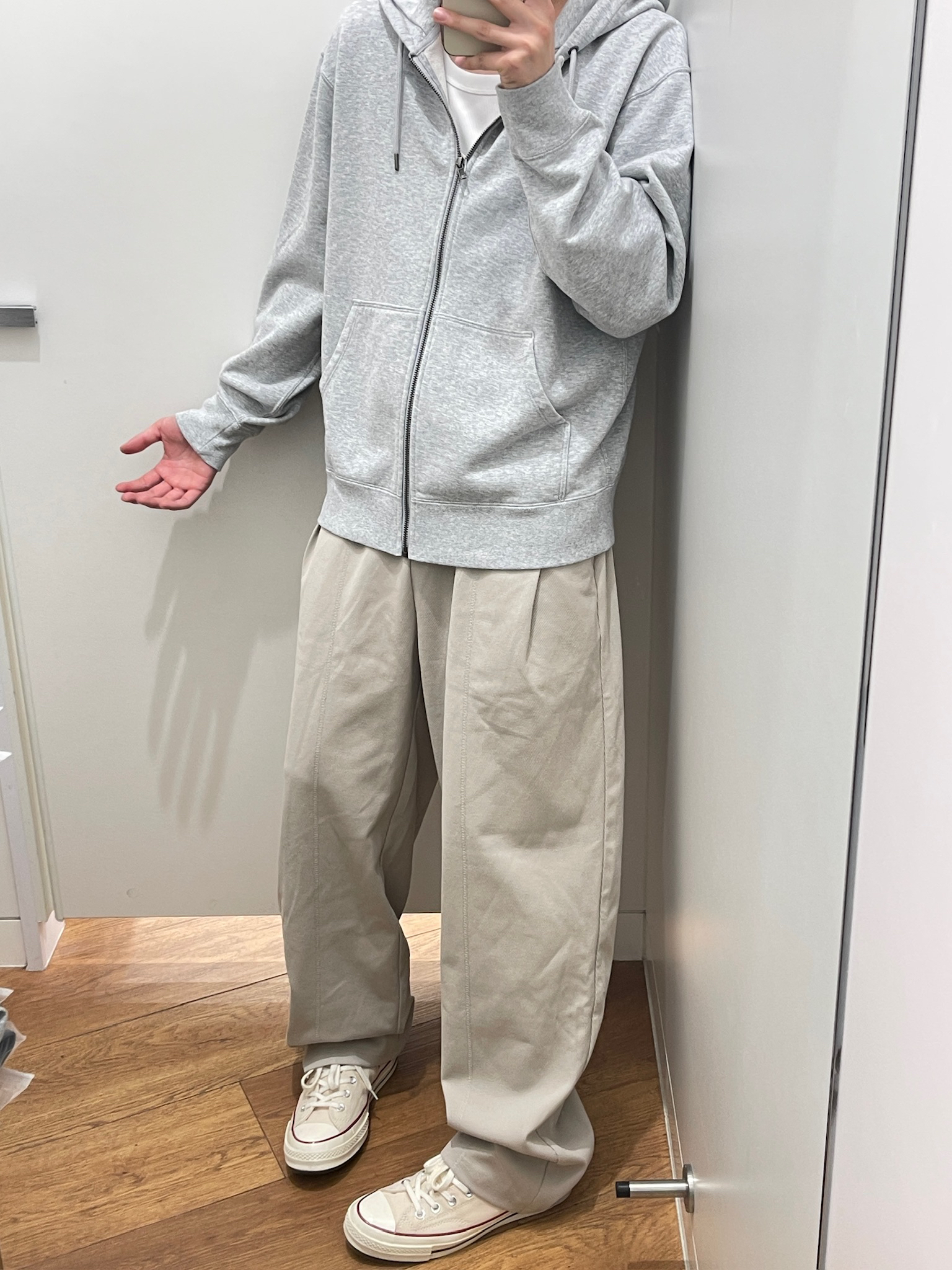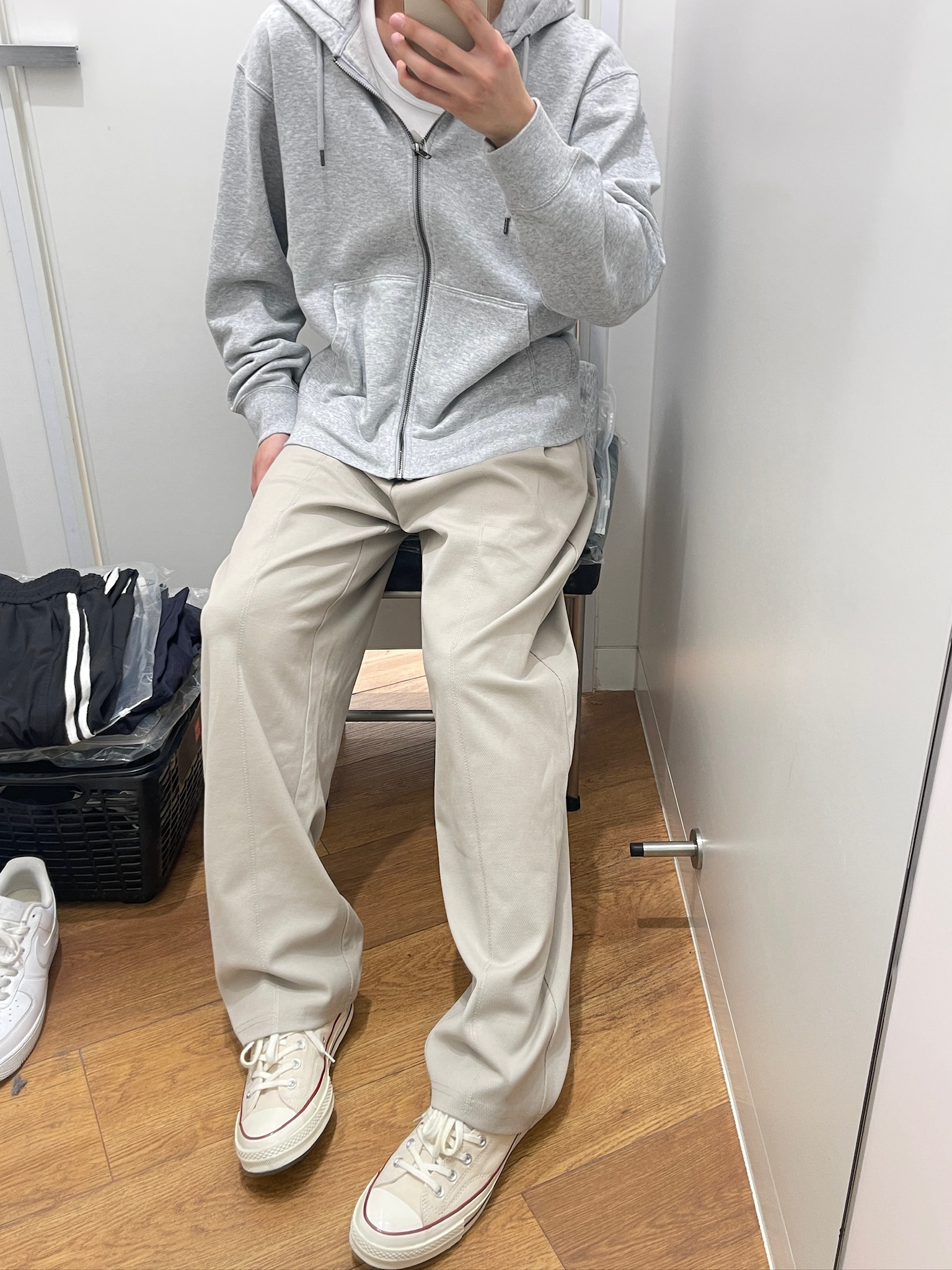这条米白色裤子真的绝了!🥹 面料摸着软乎乎的,穿上完全不闷。版型是那种宽松的直筒,不会垮也不会显腿粗,搭我的灰色连帽卫衣和帆布鞋超合适。日常出门穿,走路、坐地铁都很舒服,完全不勒裆,懒人穿搭直接一套出门,不用费脑子搭配。