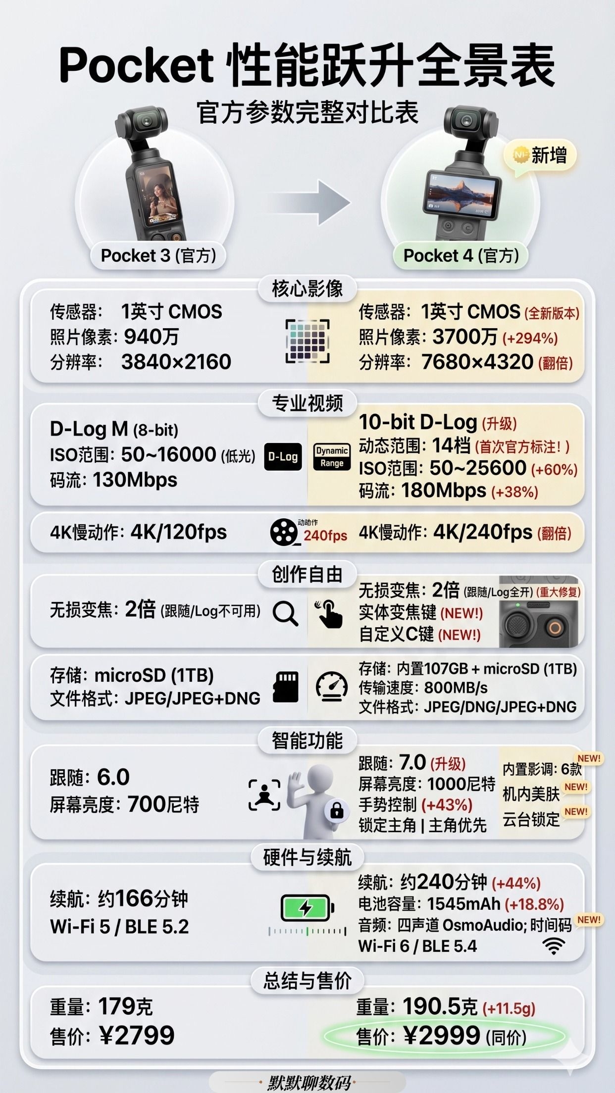 Pocket 4 发布了。 说实话,等了两年半我是有点失望的 ——失望的是,大疆这次又偷偷"卷"了 1️⃣940万像素→3700万 2️⃣4K慢动作从120fps翻到240fps 3️⃣续航涨了44% 4️⃣智能跟随7.0,手势就能控制跟拍 5️⃣同价 ¥2999,和 Pocket 3 首发一样。 如果你也在用 Pocket 3,这六个升级里只要你用得上三个以上,换新就值。