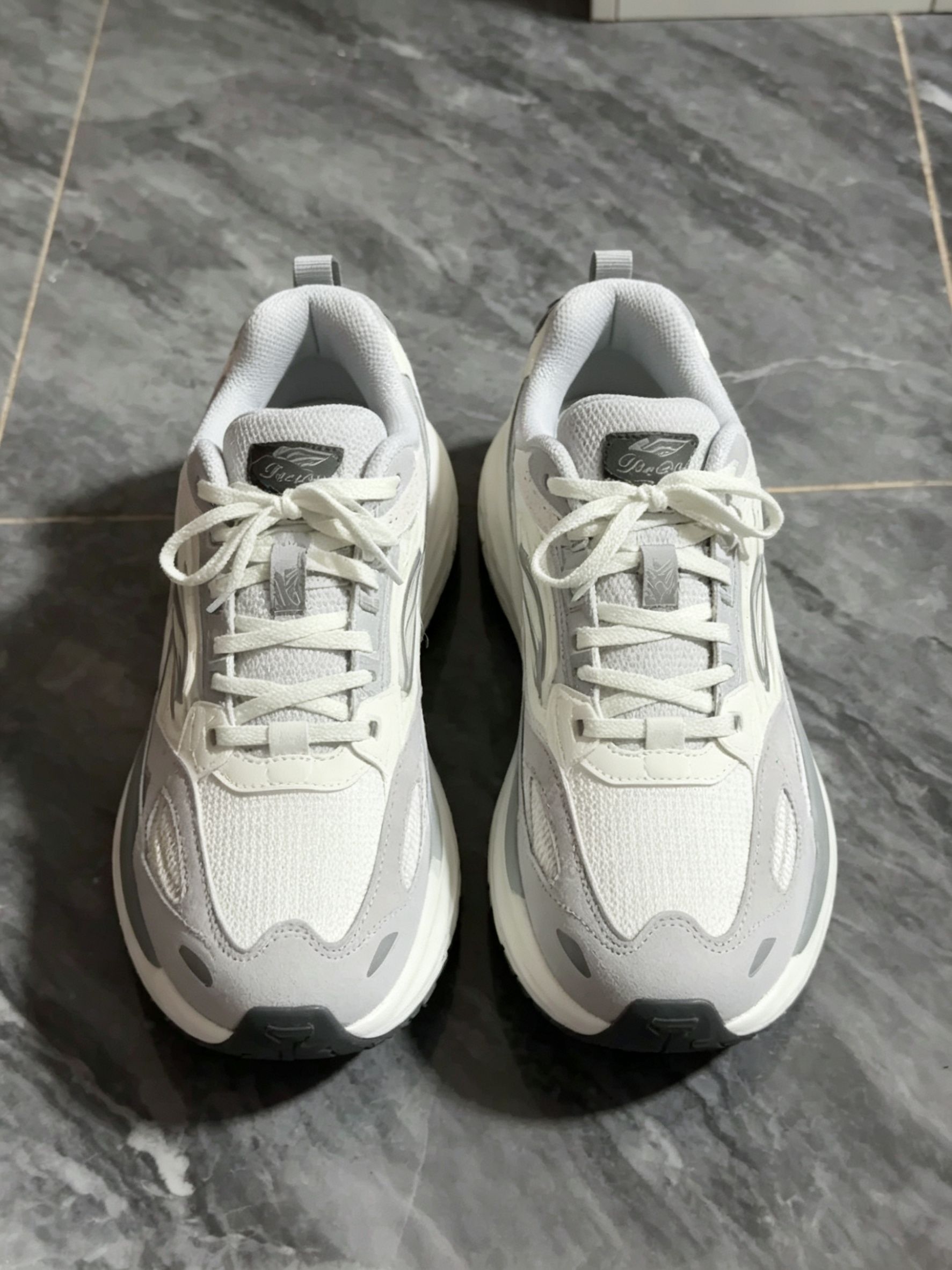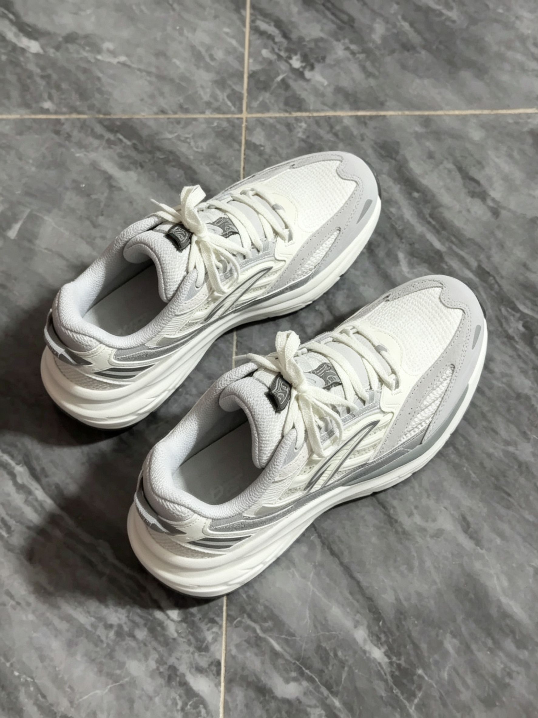 这双安踏AT957,上脚第一秒就被它的“复古松弛感”拿捏了——米白与灰的拼接,像一杯加了奶的燕麦拿铁,温柔又耐看。鞋身的革网拼接设计,既有千禧年的怀旧味,又带着山系穿搭的随性,随便配条工装裤或牛仔裤,都能穿出“不费力的时髦”,通勤、逛街、甚至周末去公园野餐,它都是我的“万能搭子”。