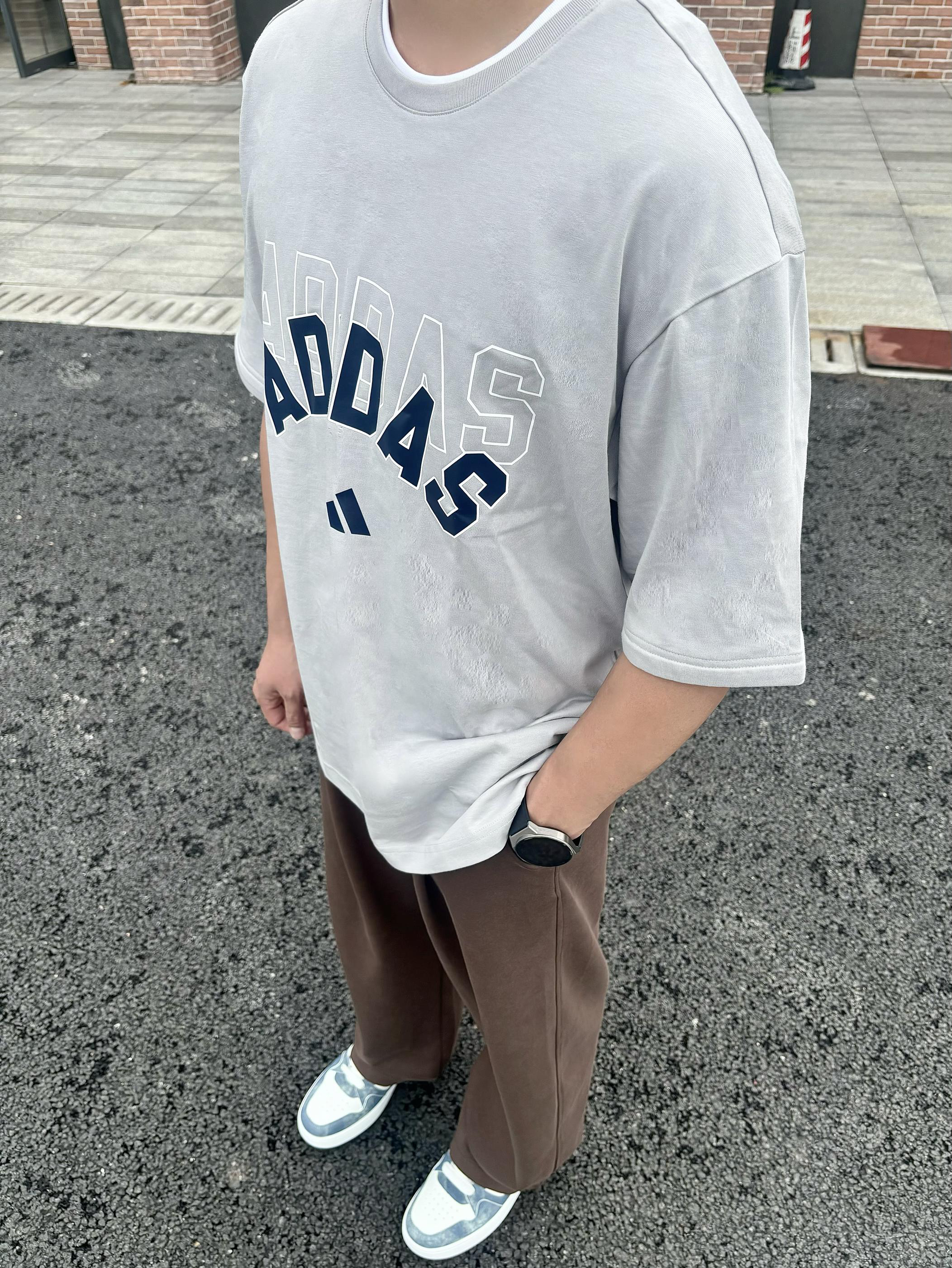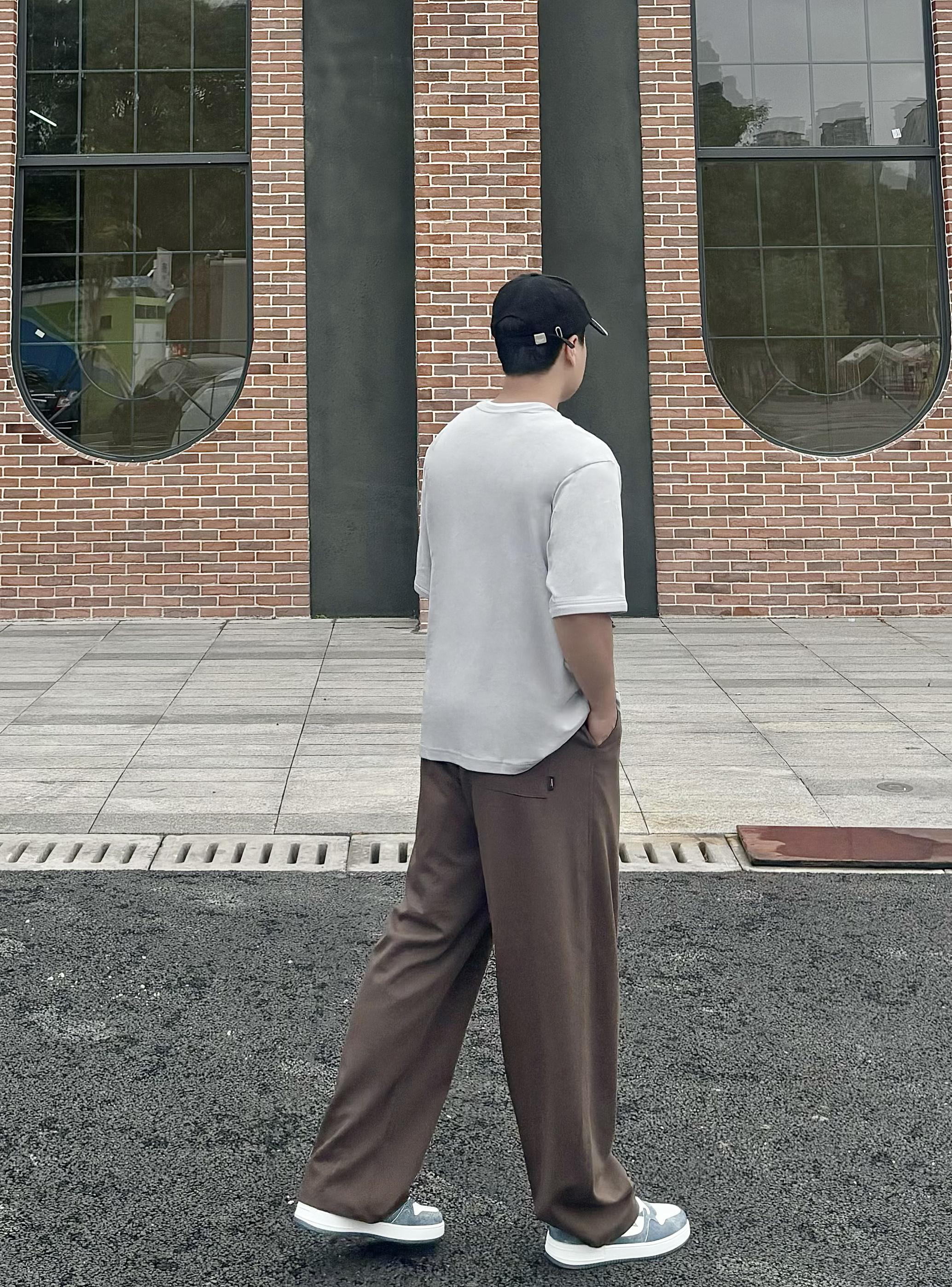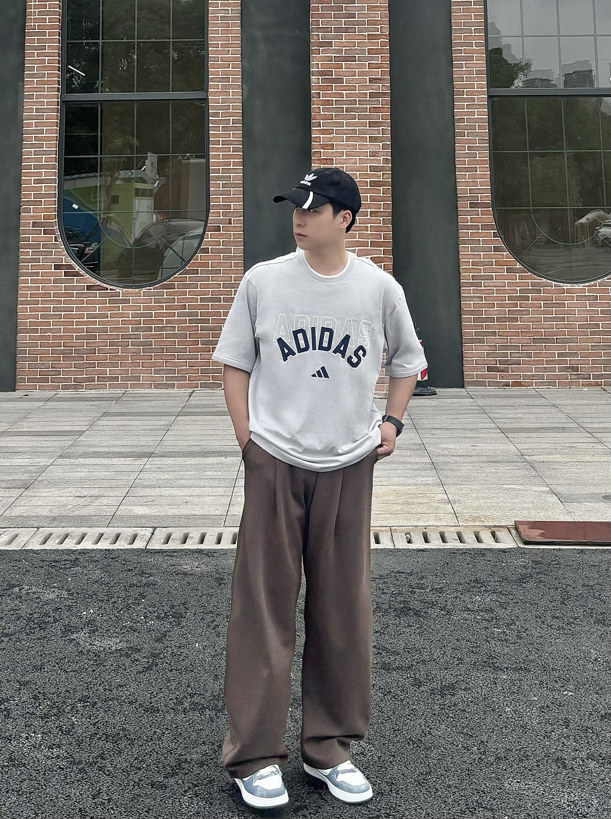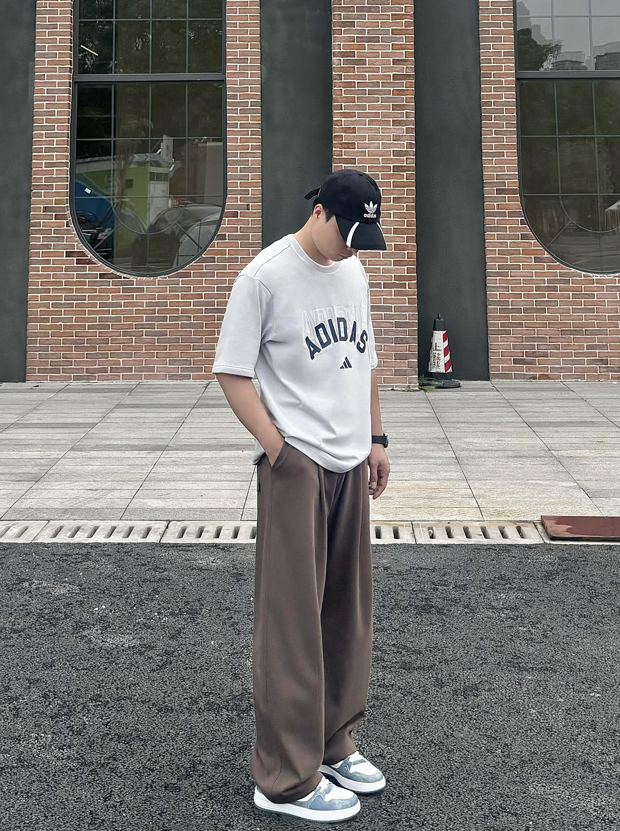 低饱和配色真的是男生穿搭的流量密码! 浅灰字母T恤搭配深棕色阔腿裤,温柔又不挑皮,完全不用担心搭配翻车😎 T恤的做旧印花自带复古滤镜,垂坠感面料上身巨舒服,夏天穿也不闷汗💦 阔腿裤的宽松版型对腿型超友好,不管是O型腿还是粗腿都能轻松修饰✨ 搭配蓝白板鞋和黑色棒球帽🧢整套look简约又有细节,自带韩系男主的慵懒氛围,日常出街回头率直接拉满!
