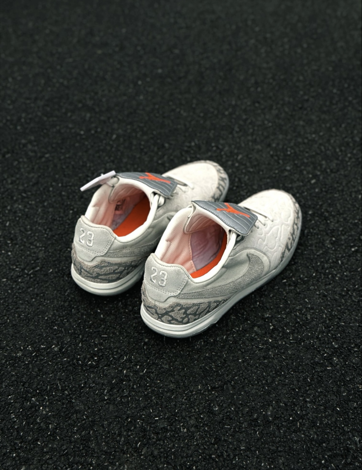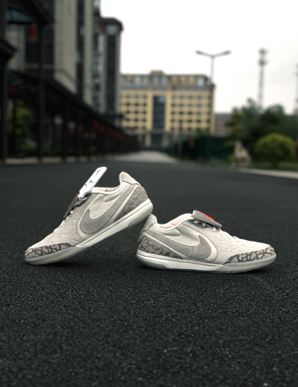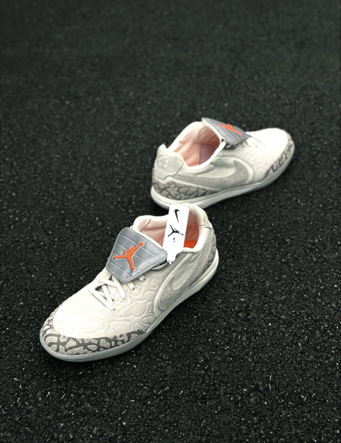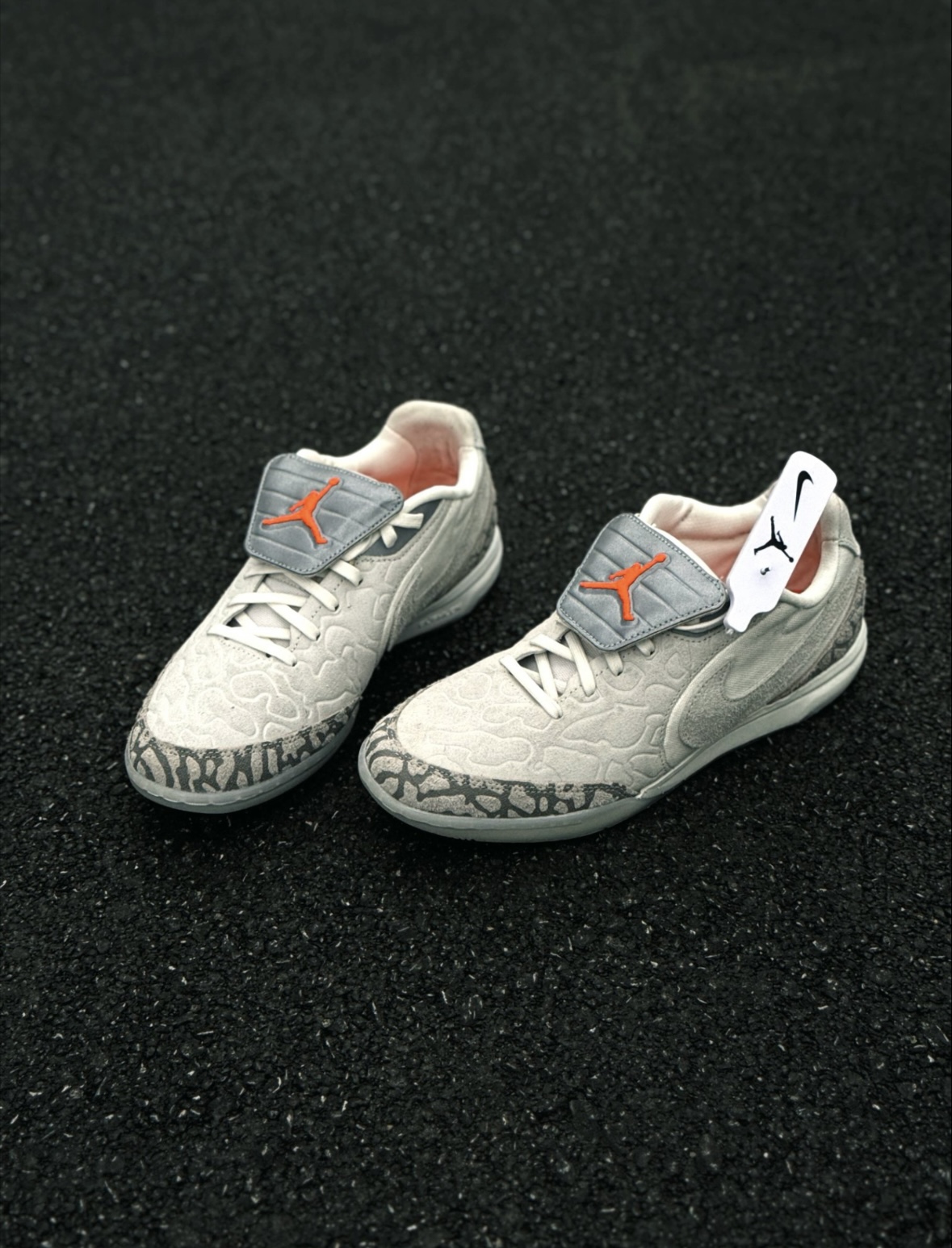 挑春鞋的时候一眼被这双Jordan Tiempo Streetgato SE的浅灰爆裂纹拿捏住了🤏 复古感+麂皮拼接,搭阔腿牛仔裤真的很有松弛感,鞋舌的小飞人标也算个小惊喜✨ 🔍 基本信息 · 货号:117579-016 · 适用:室内、春秋、日常通勤 · 鞋型偏修长,正常脚型包裹刚好,宽脚/高脚背会明显挤 · 麂皮+帆布摸起来舒服,但麂皮超级沾灰,风大一点就显脏 · 魔术贴鞋舌能固定不跑...