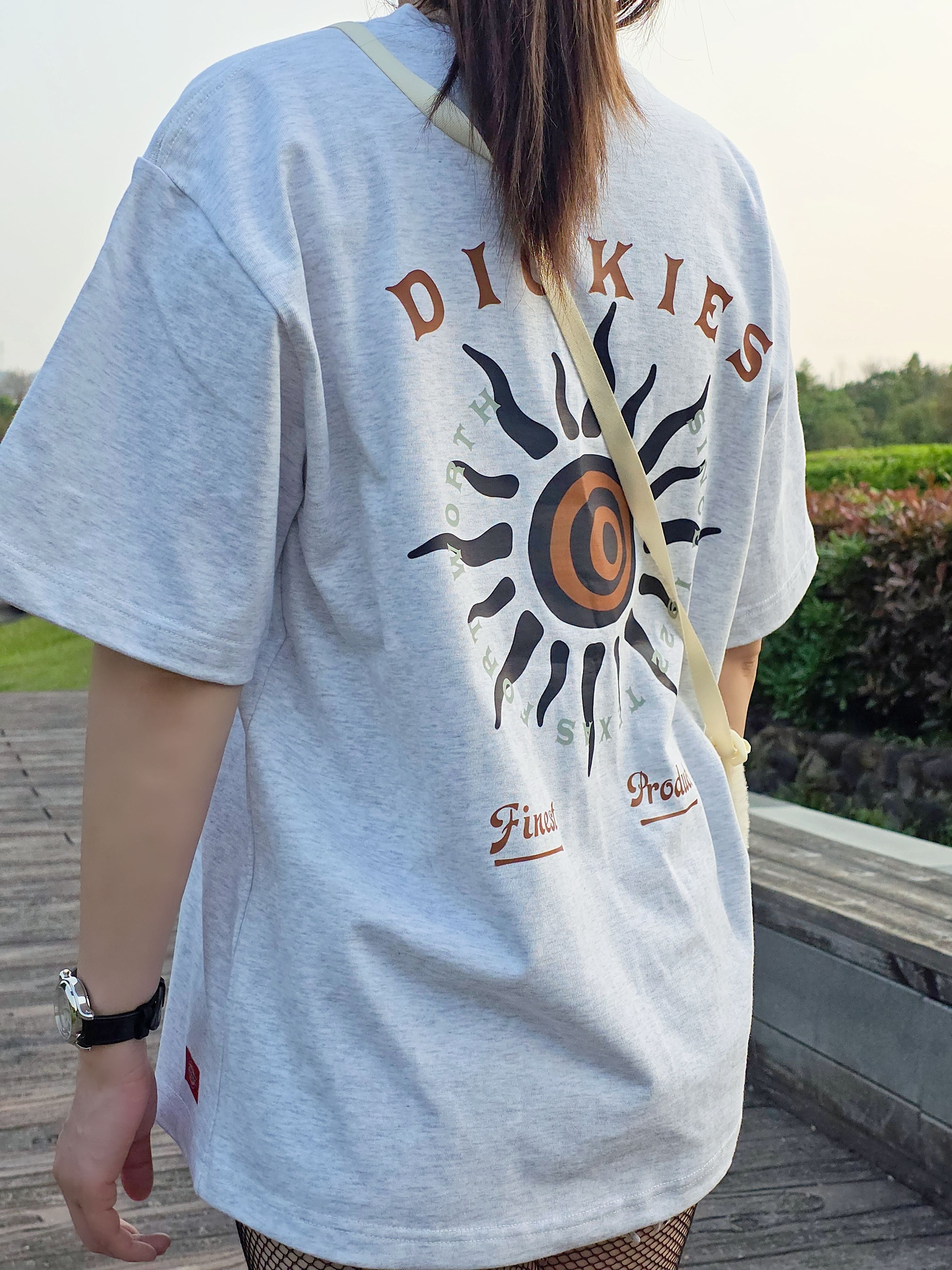 怎么穿显高显瘦,可以学我呀!这件Dickies的短袖T恤,宽松版型轻松遮肉不贴身,长度刚好玩个下衣消失法,一下就拉长腿部线条啦!什么身材穿上都显瘦哦!趣味太阳印花带来满满复古街头范儿,怎么搭都好看哎!