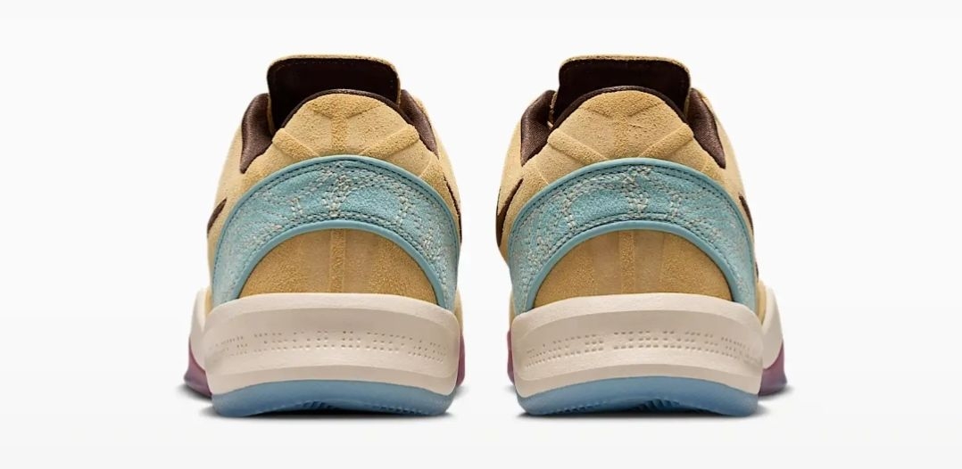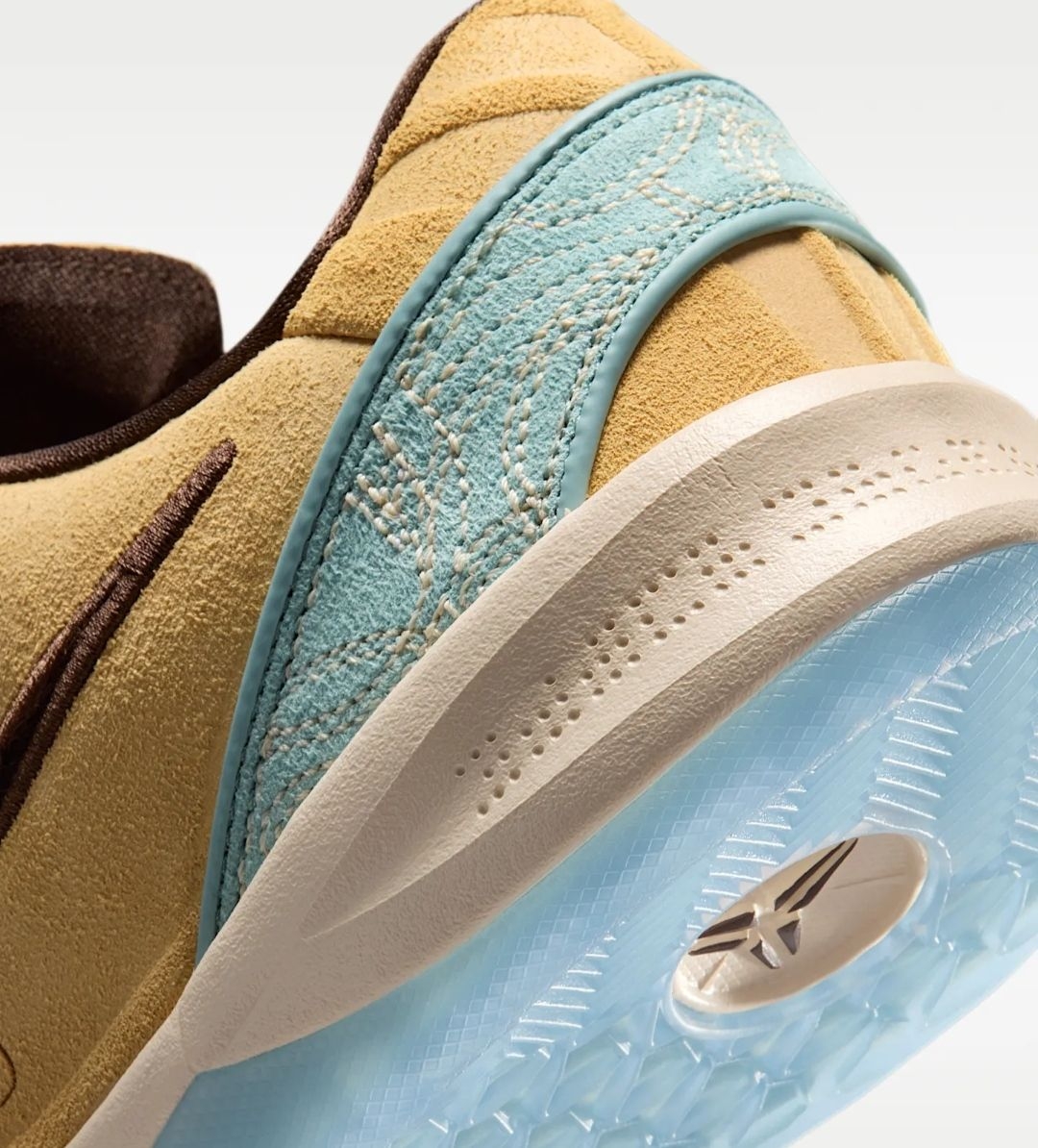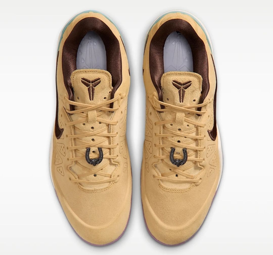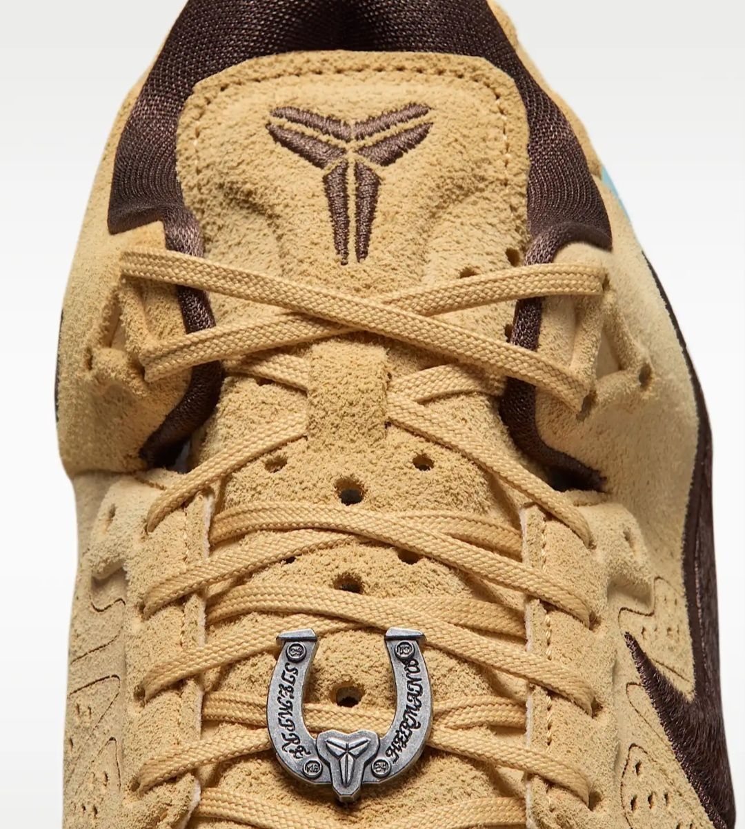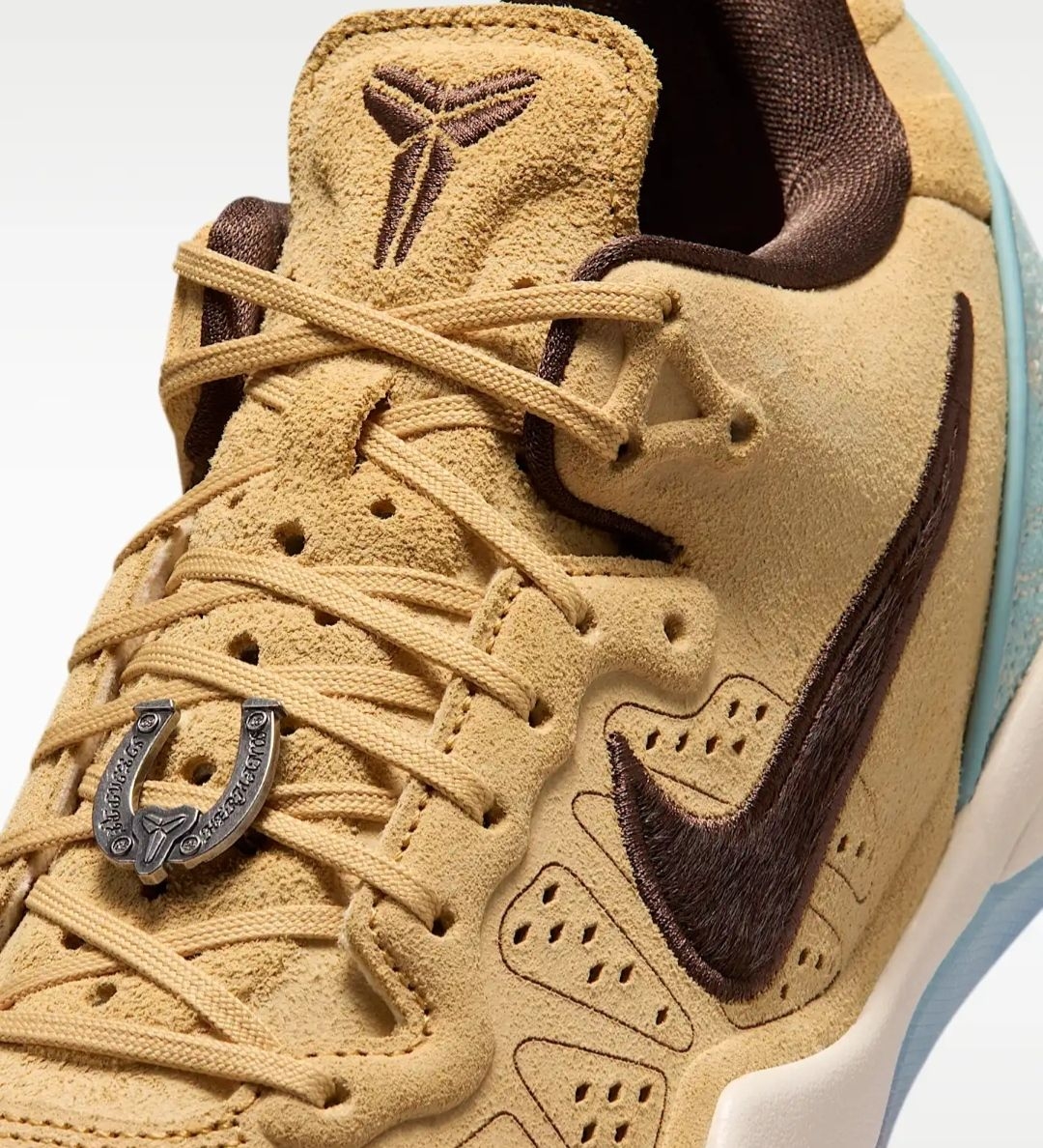 细节处的巧思更是令人惊叹:后跟的浅蓝色区域,以米白色线迹绣出了传统的编织纹理,仿佛马具上的图腾装饰,增添了几分东方韵味;鞋舌与鞋帮边缘的深棕色包边,如同马鞍的皮革镶边,勾勒出流畅的鞋型轮廓;鞋带扣上的金属装饰,更是暗藏玄机,将科比的个人元素与马的意象巧妙融合,低调又充满仪式感。