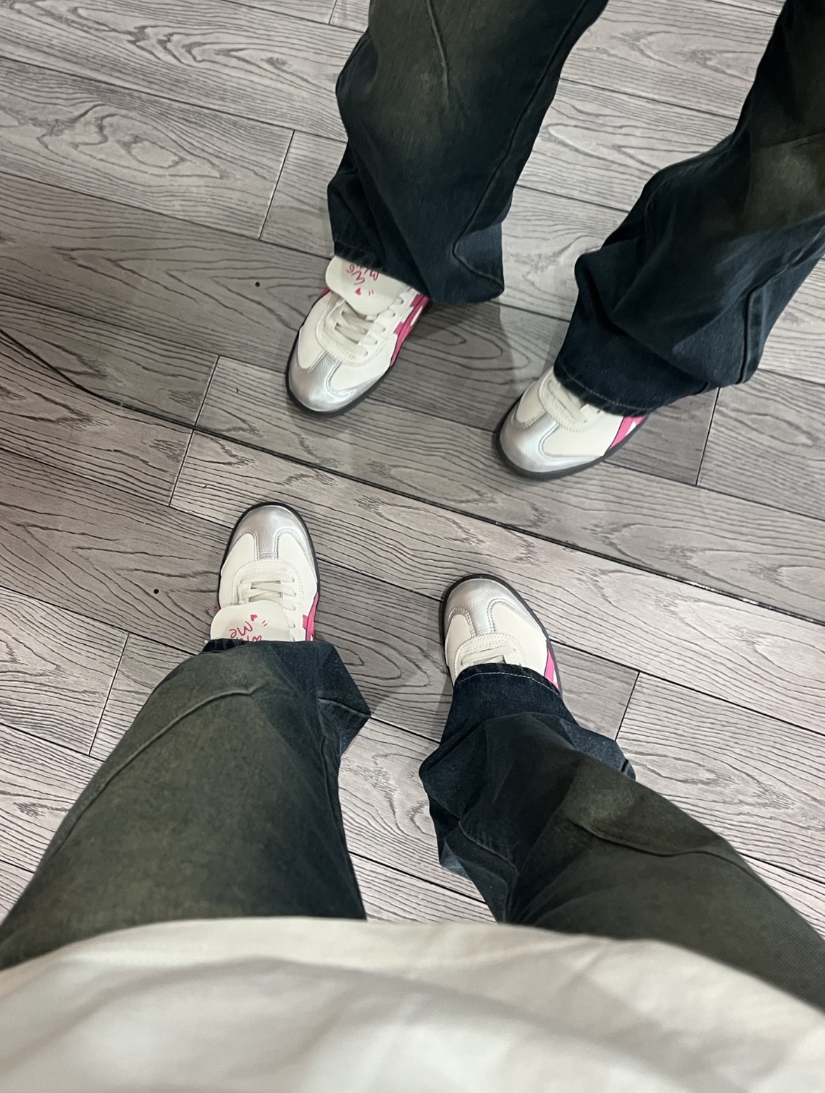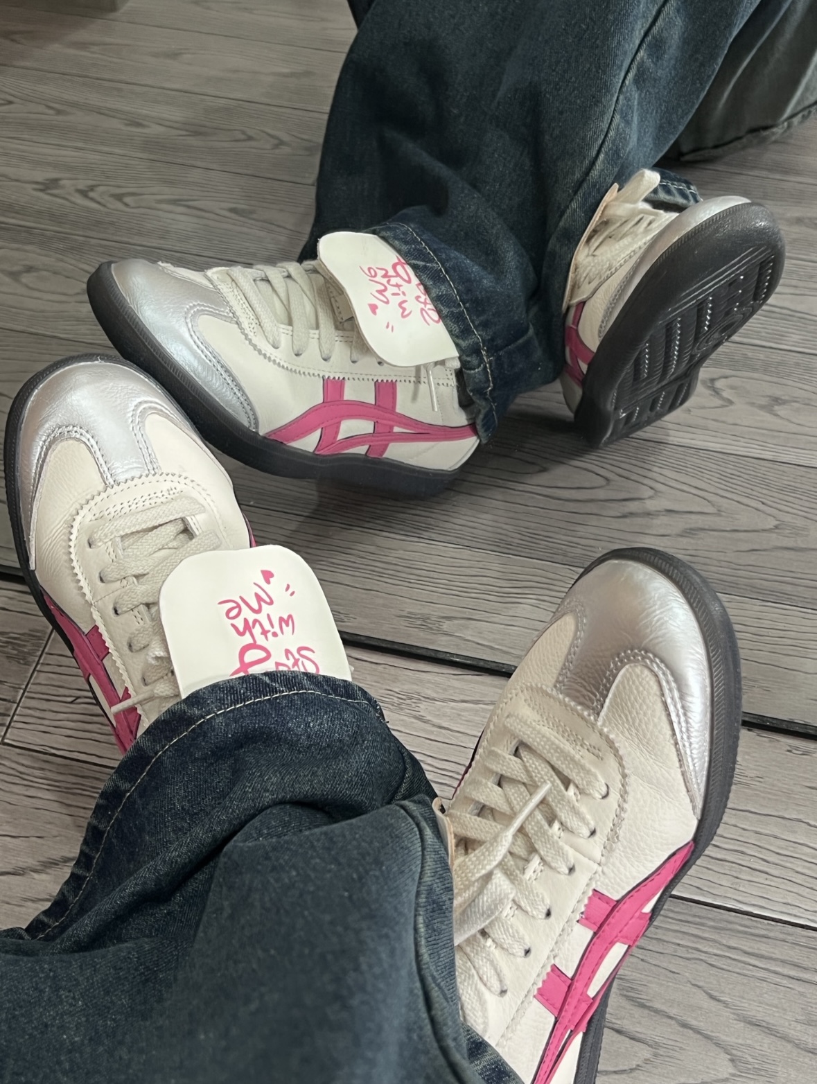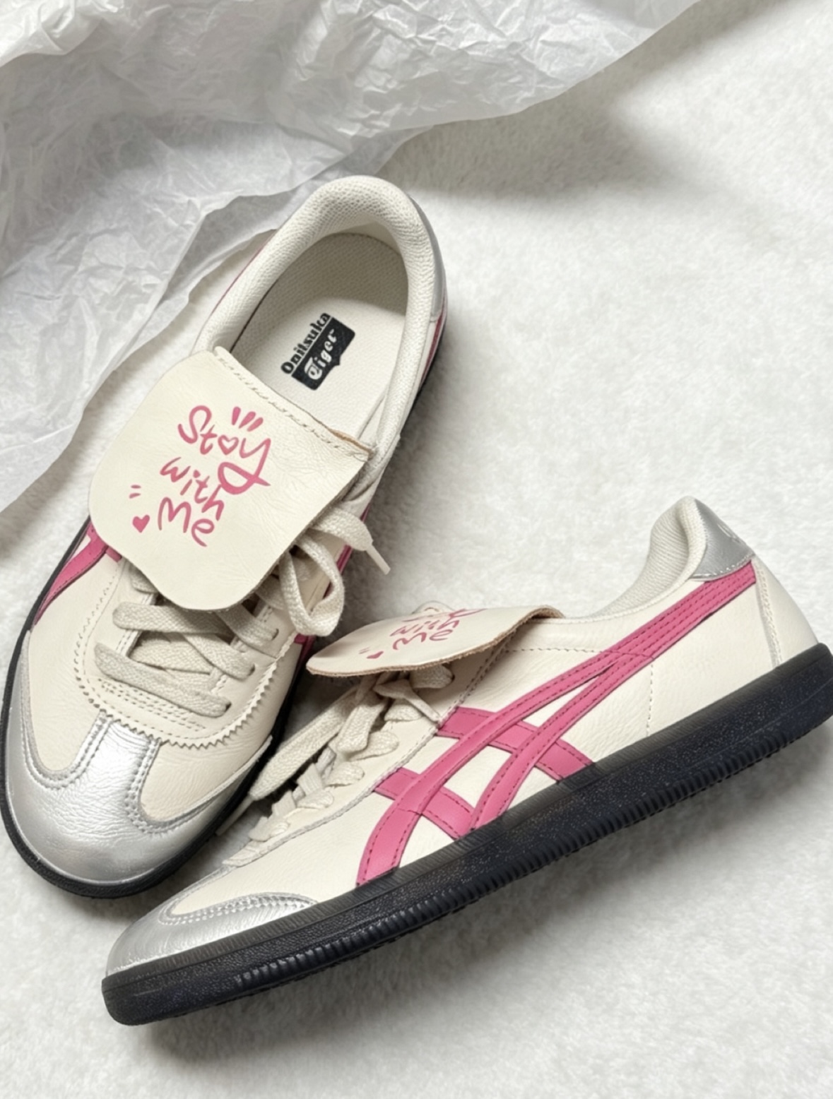 被这双鬼冢虎「虚拟恋人」甜到心巴上了💘 米白+芭比粉+银灰的配色,又甜又酷,少女感直接拉满 可翻折的鞋舌是点睛之笔!印着“Stay with me”的手写风字母,浪漫又有小心机 复古德训鞋版型超百搭,搭牛仔裤、运动裤、百褶裙都绝了,上脚显脚小又显腿直 软乎乎的皮质上脚巨舒服,日常出街、上学、探店穿都合适,甜酷女孩必备款! #鬼冢虎 #鬼冢虎德训鞋 #银粉德训鞋 #甜酷女孩必备 #少女心鞋子