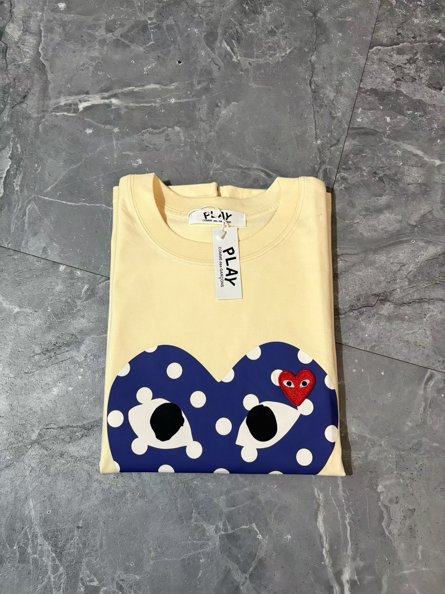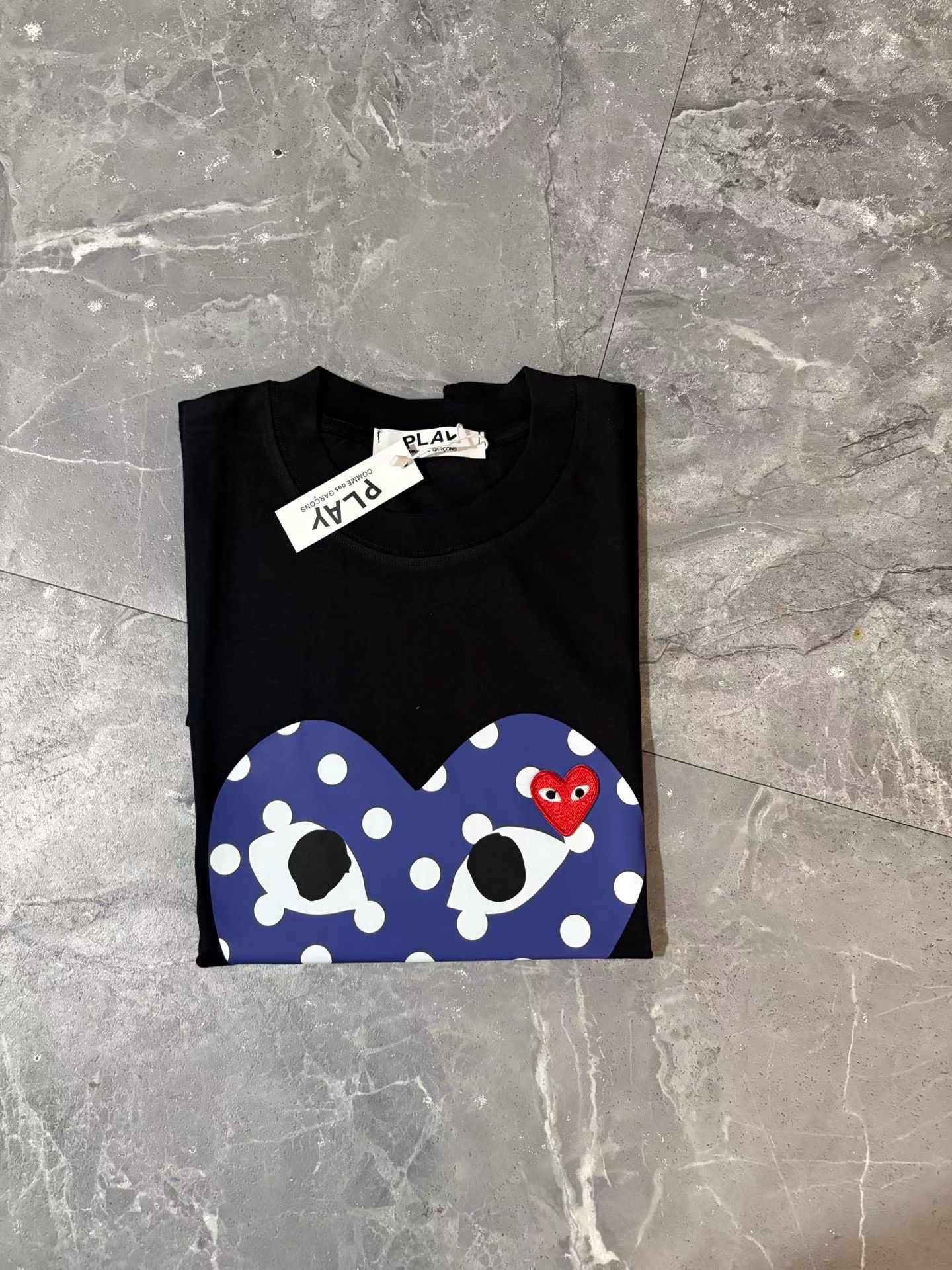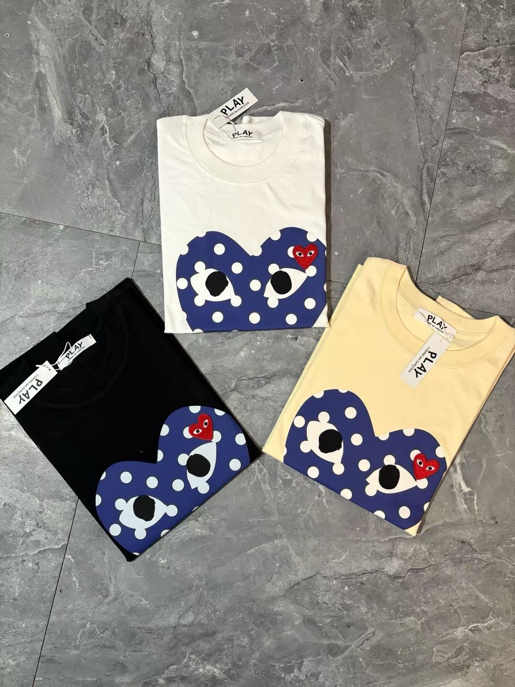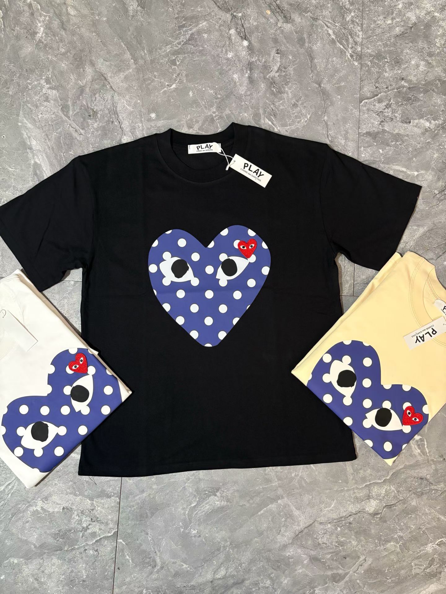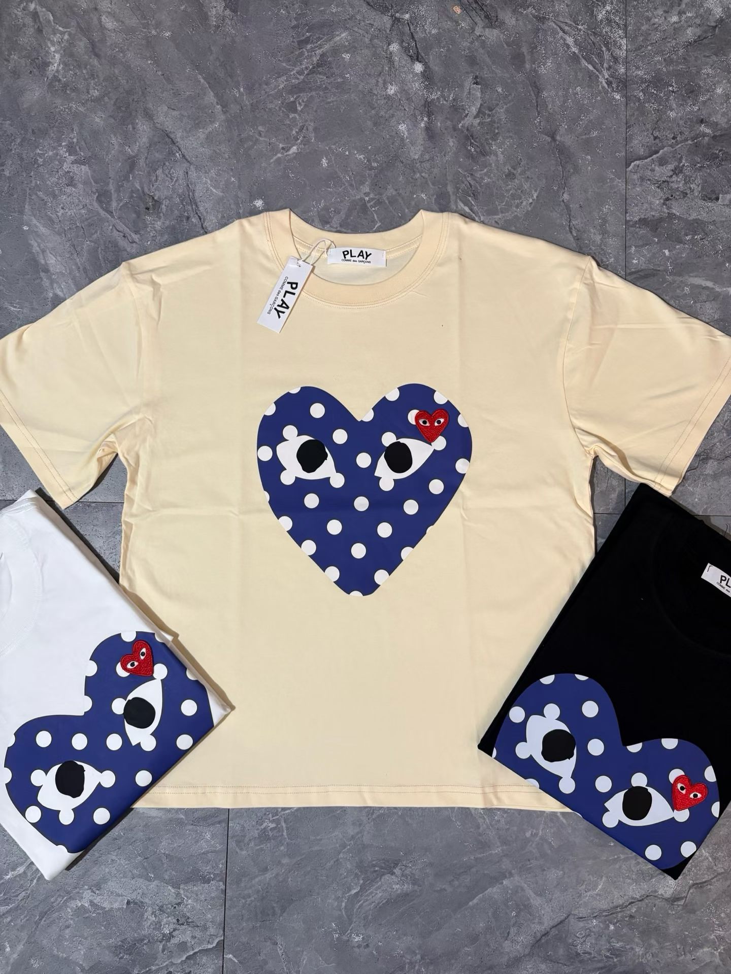 CDG波点短袖分享,米色黑色白色三个配色,波点加爱心的图案非常适合夏天,日常搭配各种裤子绝对不会出错