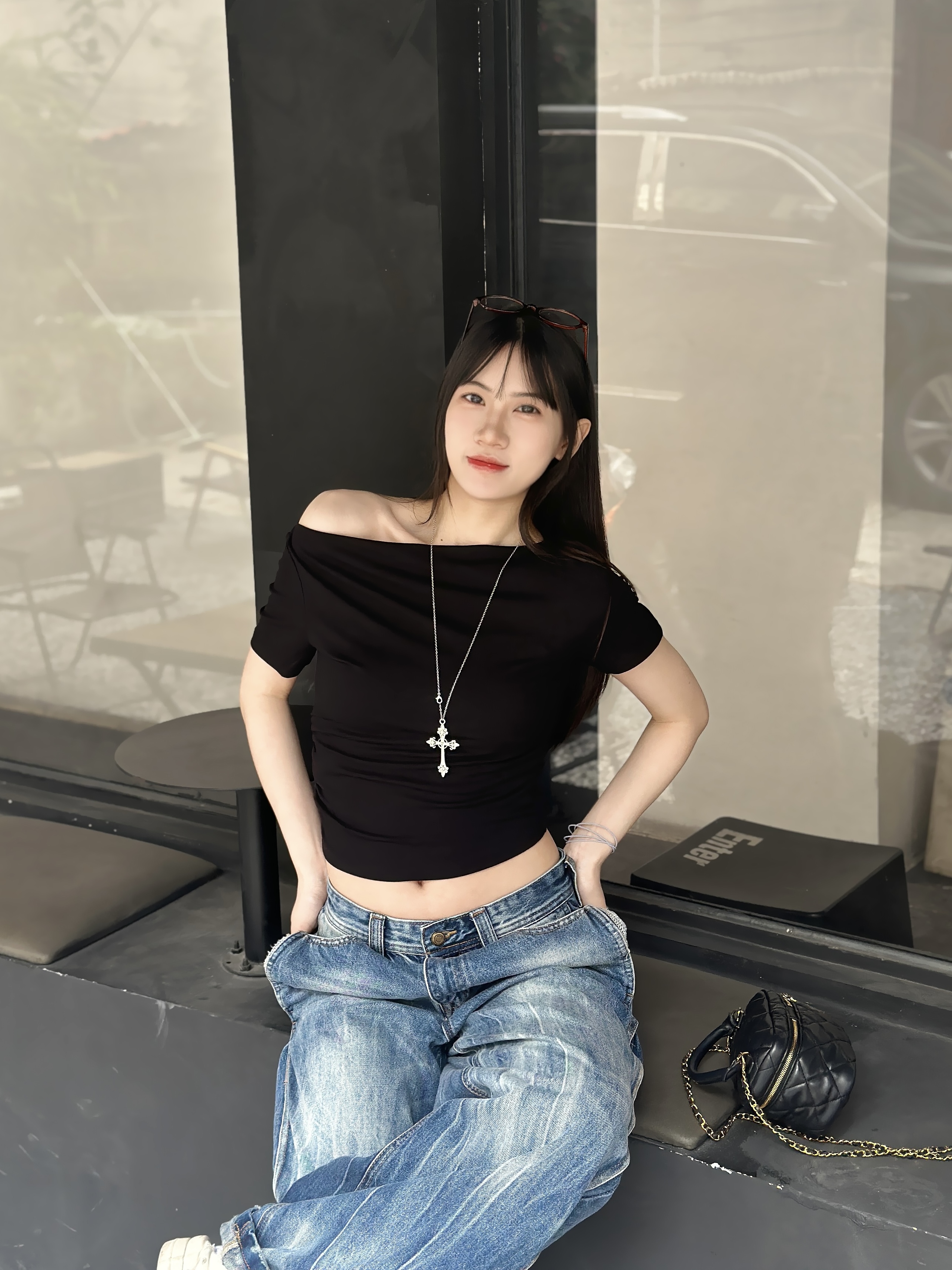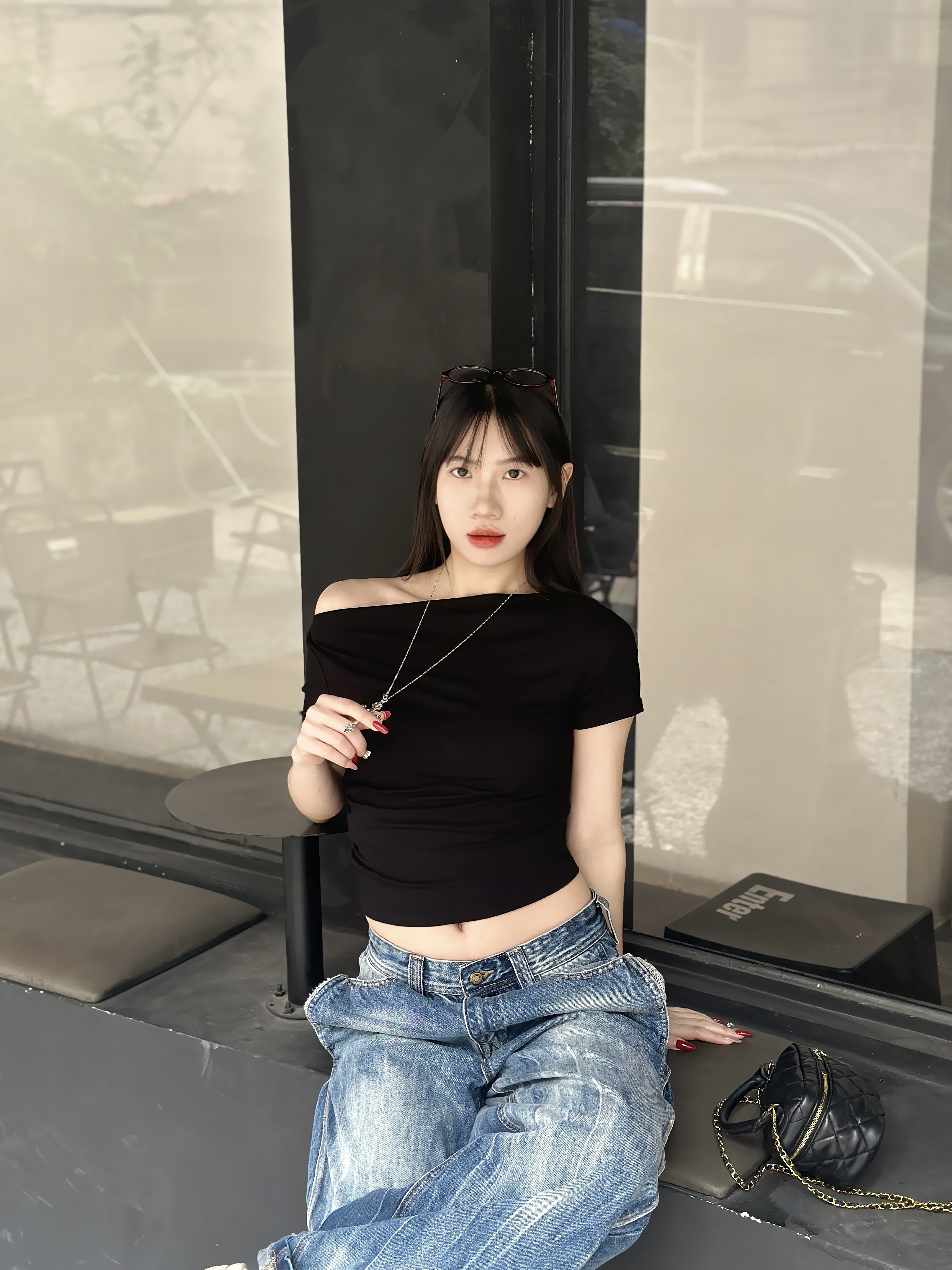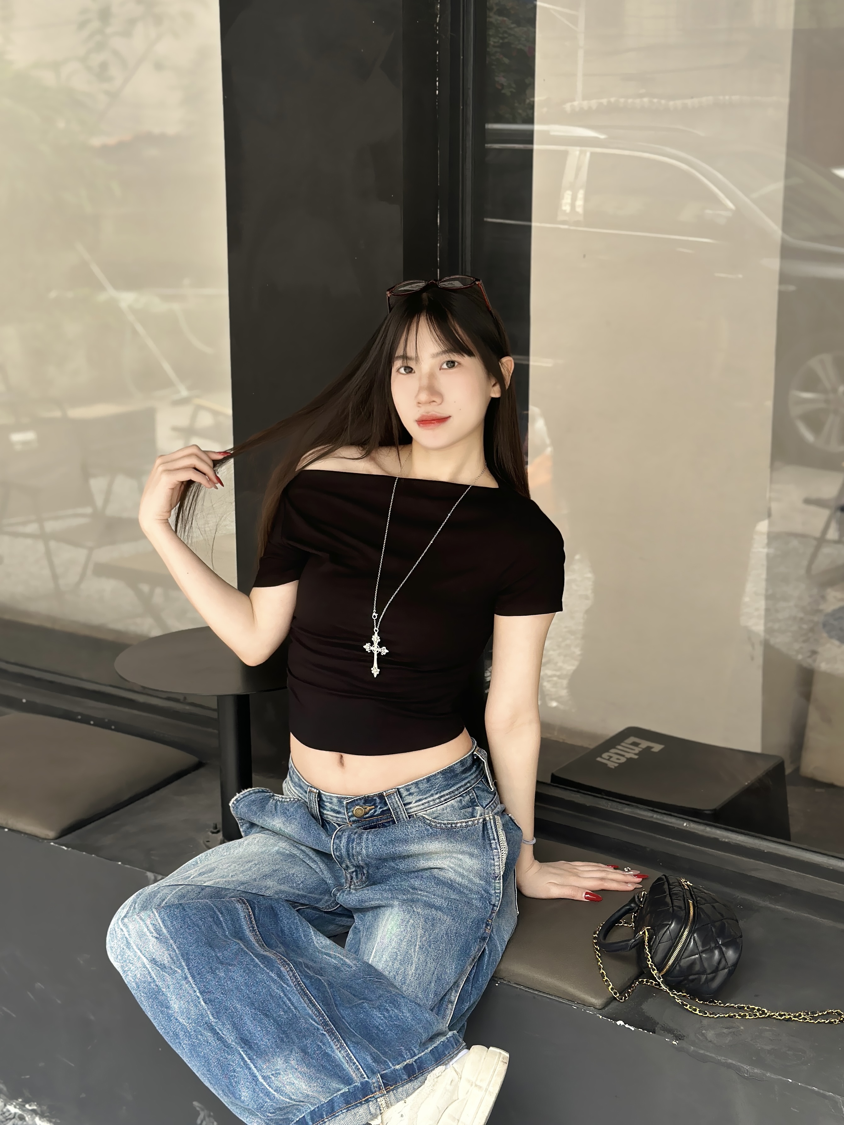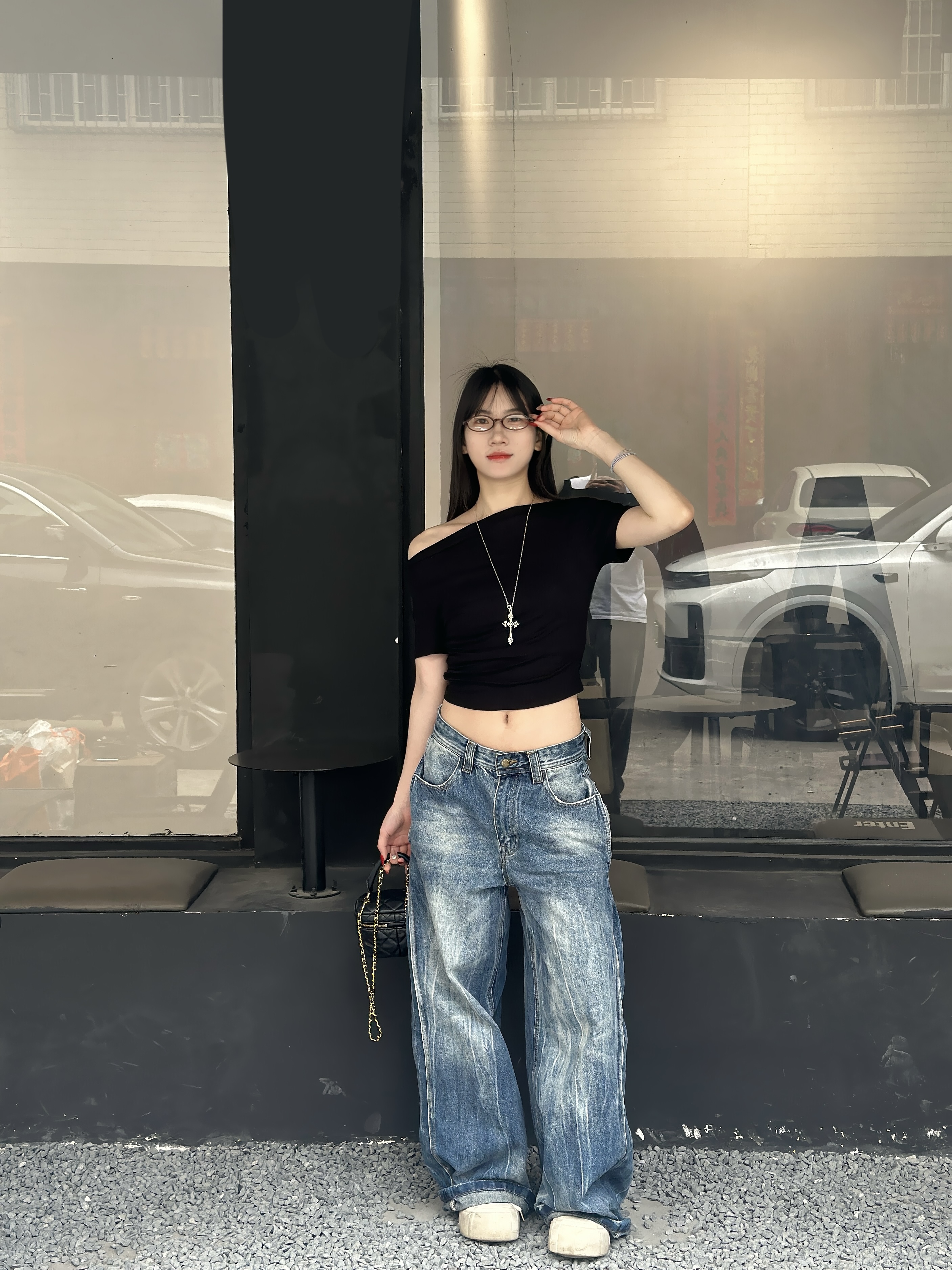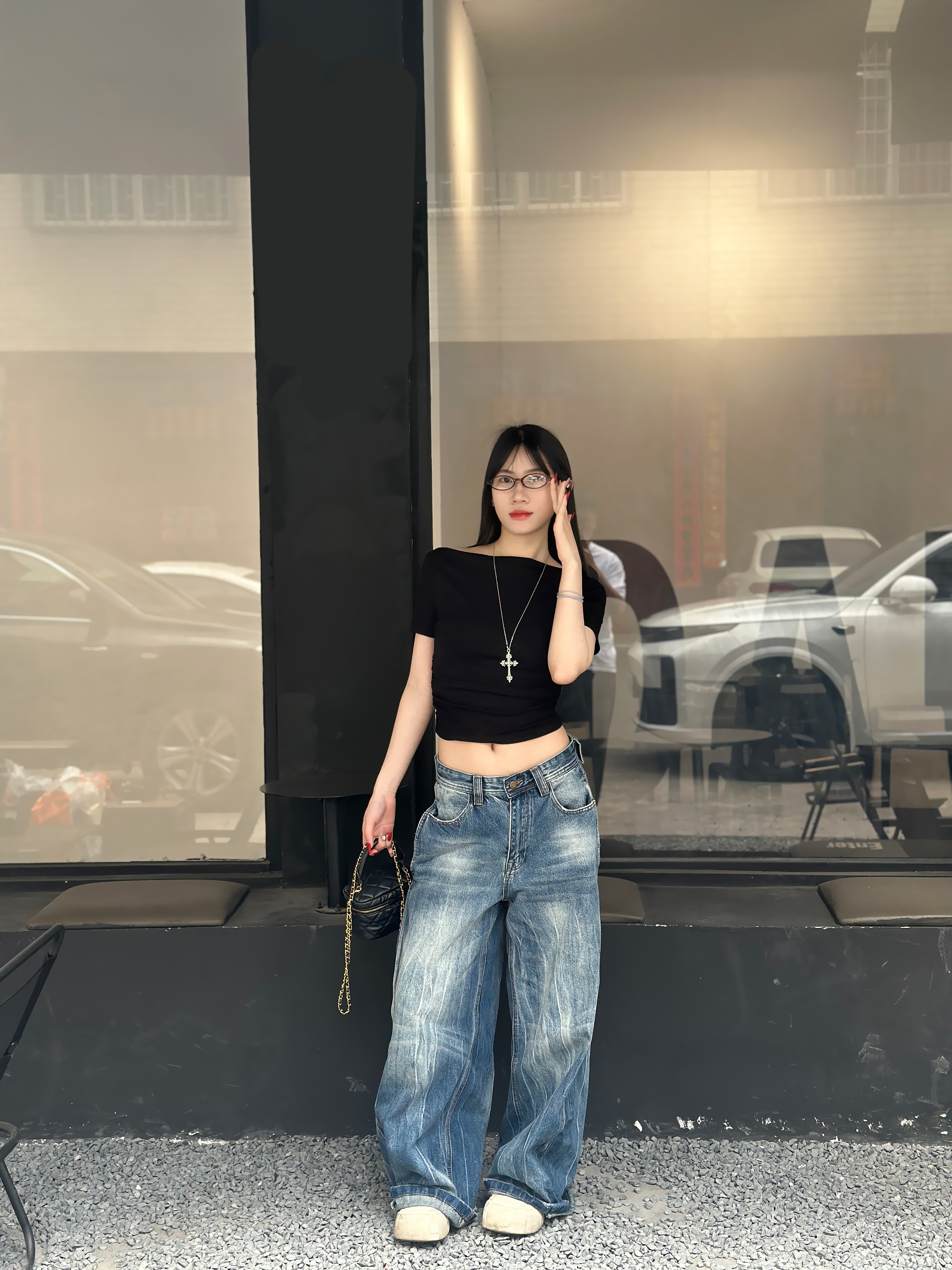 基础黑一字肩短上衣 搭配水洗做旧阔腿牛仔裤 简简单单的黑白牛仔组合 轻轻松松穿出九头身比例 又酷又慵懒的街头氛围感 日常出门随手一套就很出片 显瘦藏肉 不费力的时髦感✨
