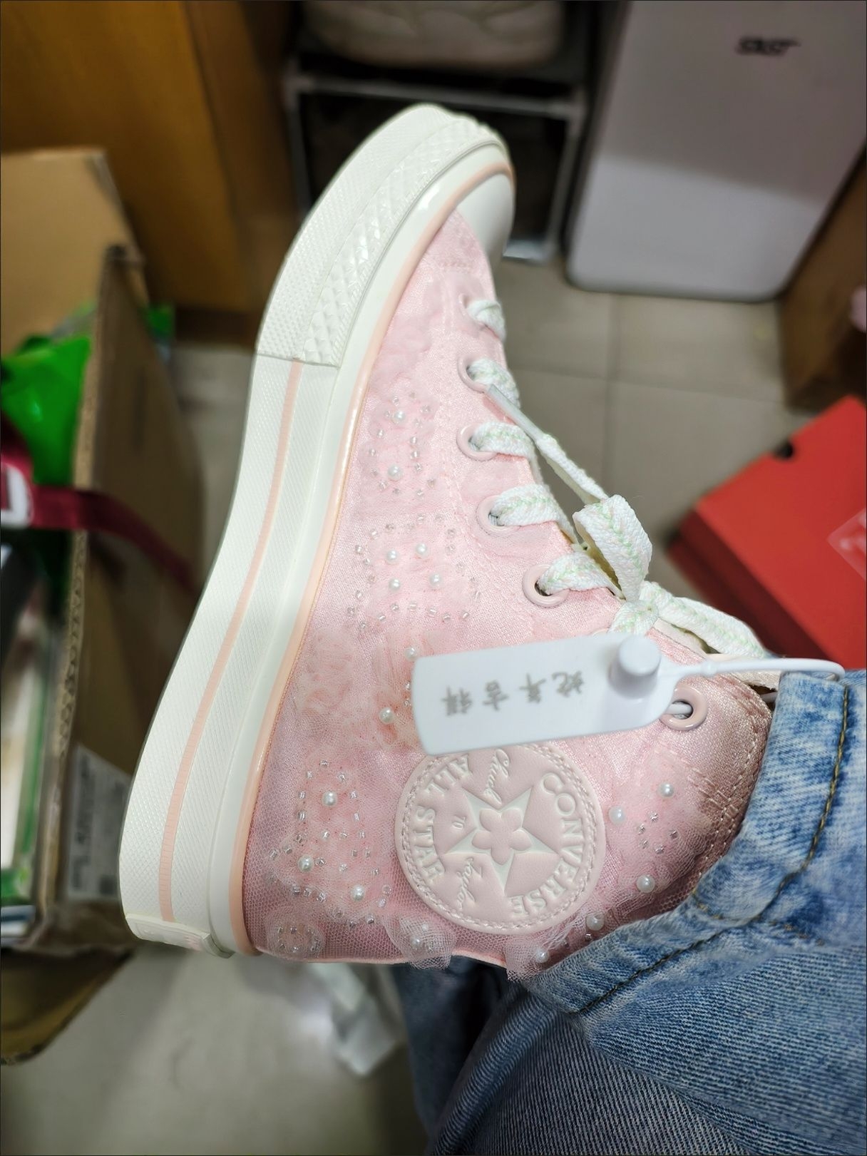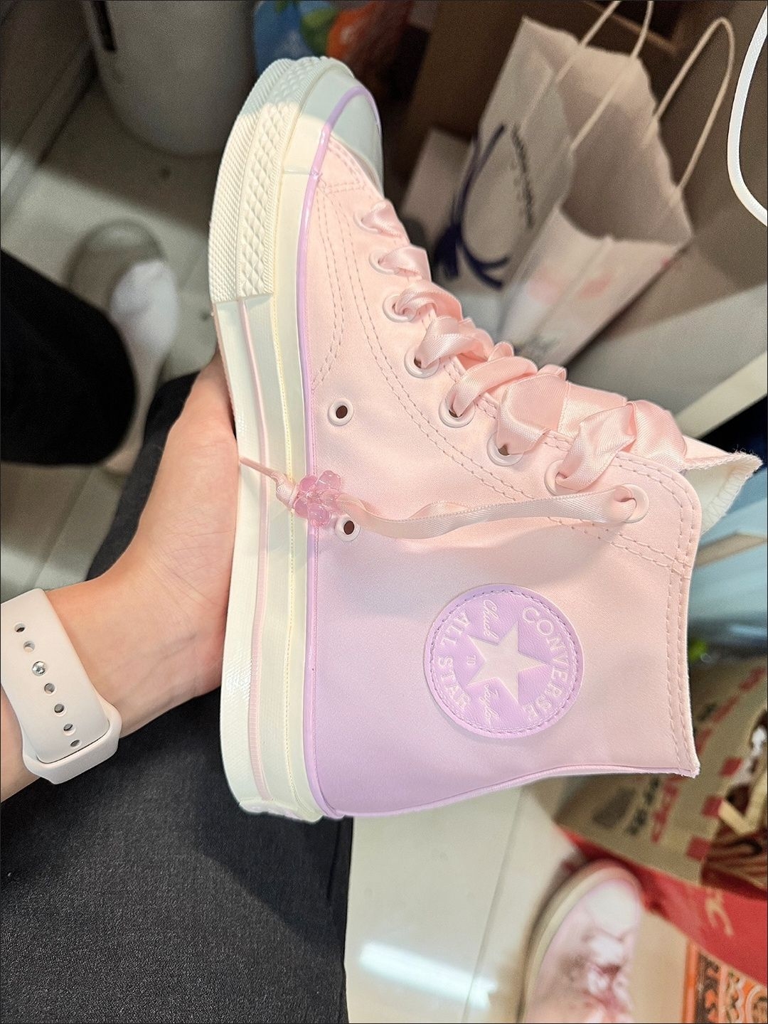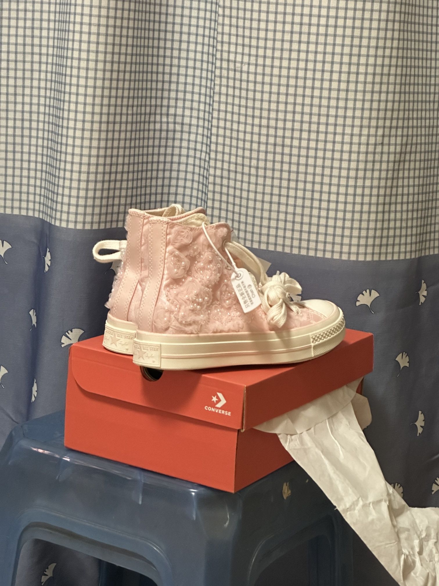 救命!这双匡威桃花粉真的美到我失语百鞋面的立体桃花和珍珠细节也太精致了吧,雪纺材质软乎乎的,搭配可拆卸的流苏福袋,甜妹感直接拉满! 奶fufu的浅粉色完全不挑皮,搭配牛仔裤、小裙子都超合适,穿上秒变春日氛围感美女,回头率直接爆表! 谁能拒绝一双自带仙气的粉色匡威啊!