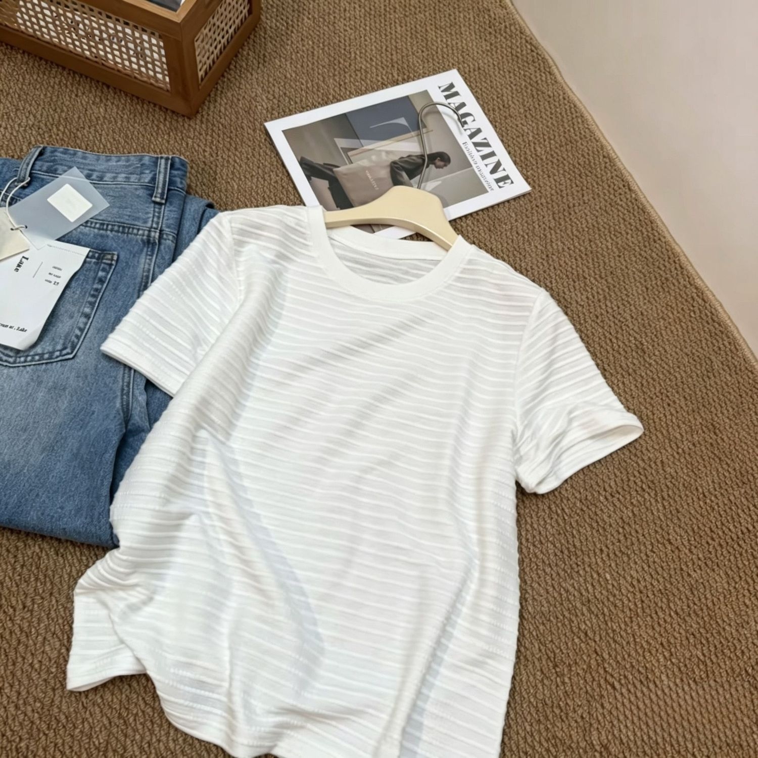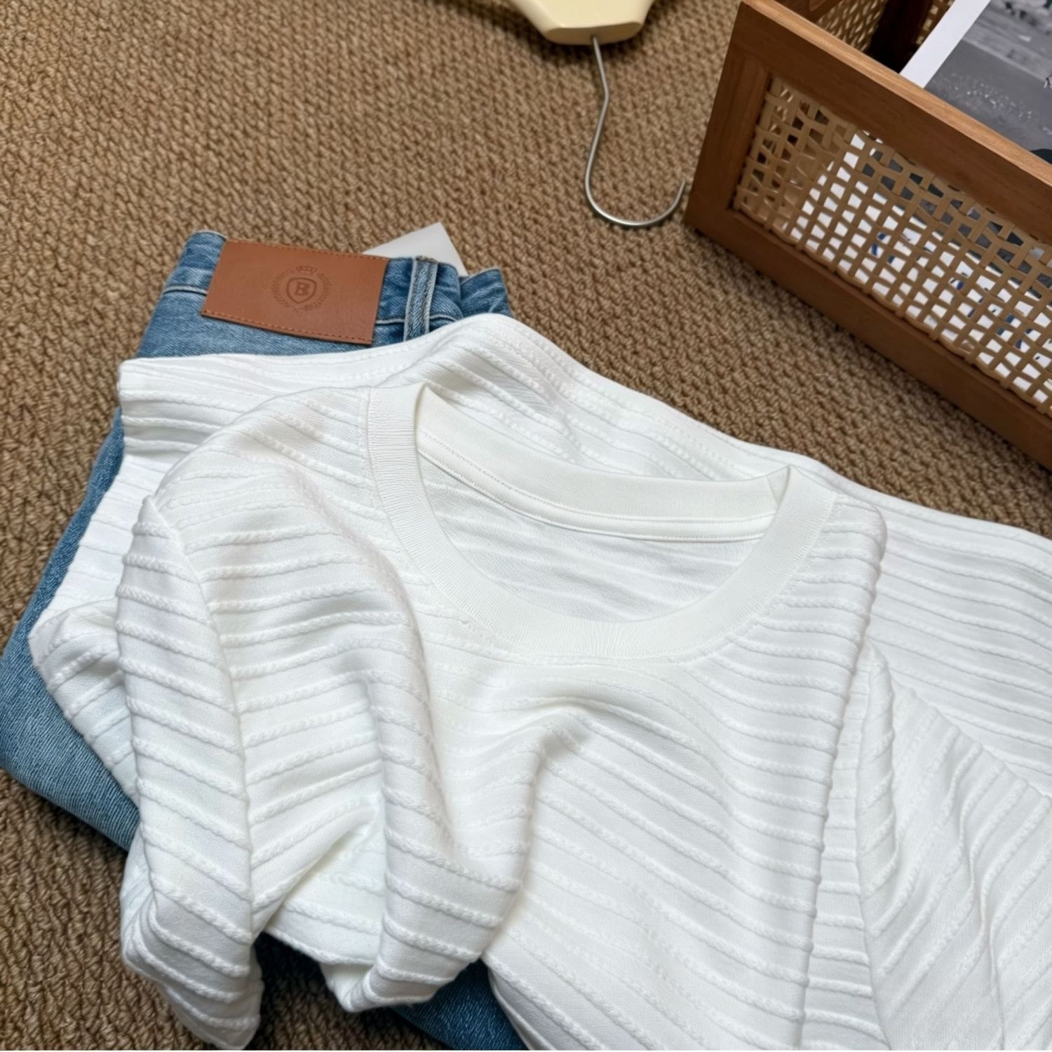 这一套搭配真的太清爽耐看了!简约的白色纹理T恤自带温柔质感,立体的条纹肌理感比普通纯色T恤更有层次,上身轻盈透气。搭配经典的蓝色牛仔裤,是怎么穿都不会出错的休闲随性风,日常通勤或逛街都很合适。
