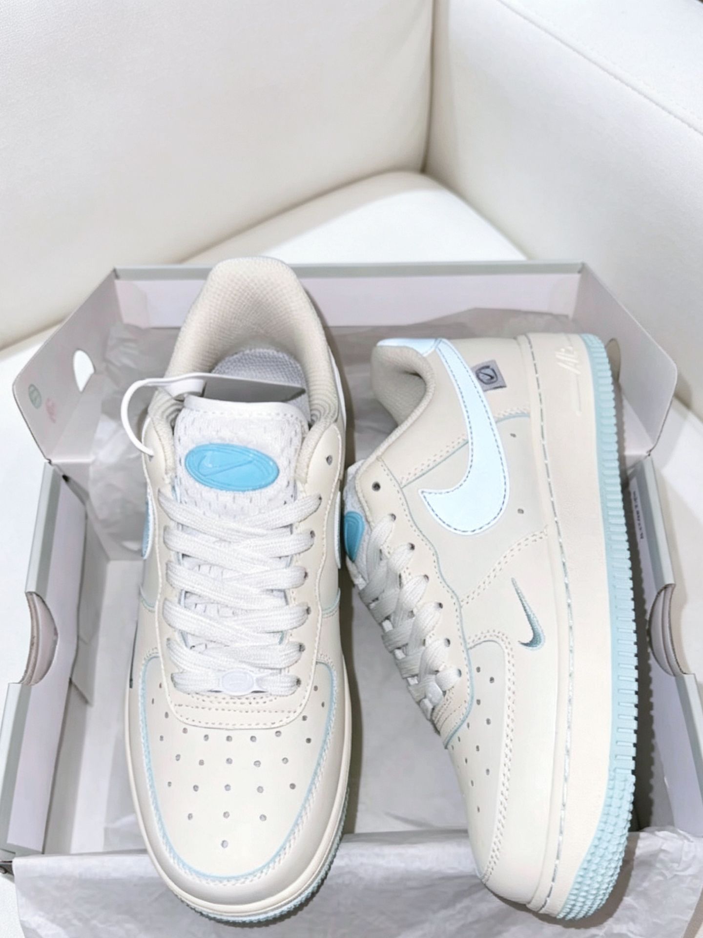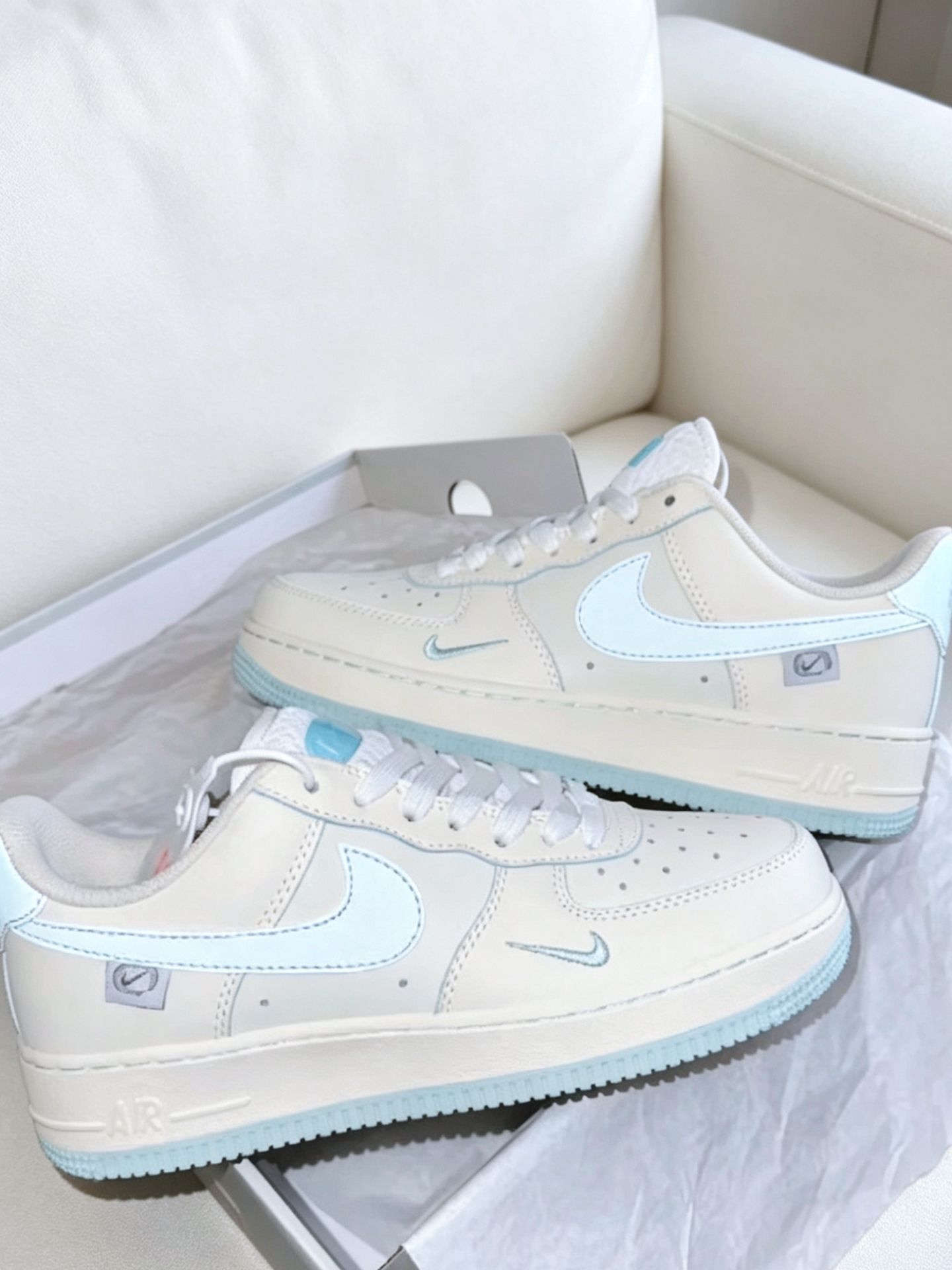 谁懂啊!这双空军一号直接戳中我的少女心!奶白鞋身搭配冰蓝Swoosh和外底,鞋侧的迷你小勾和特殊标细节也很到位,温柔又清新,春夏穿超合适。