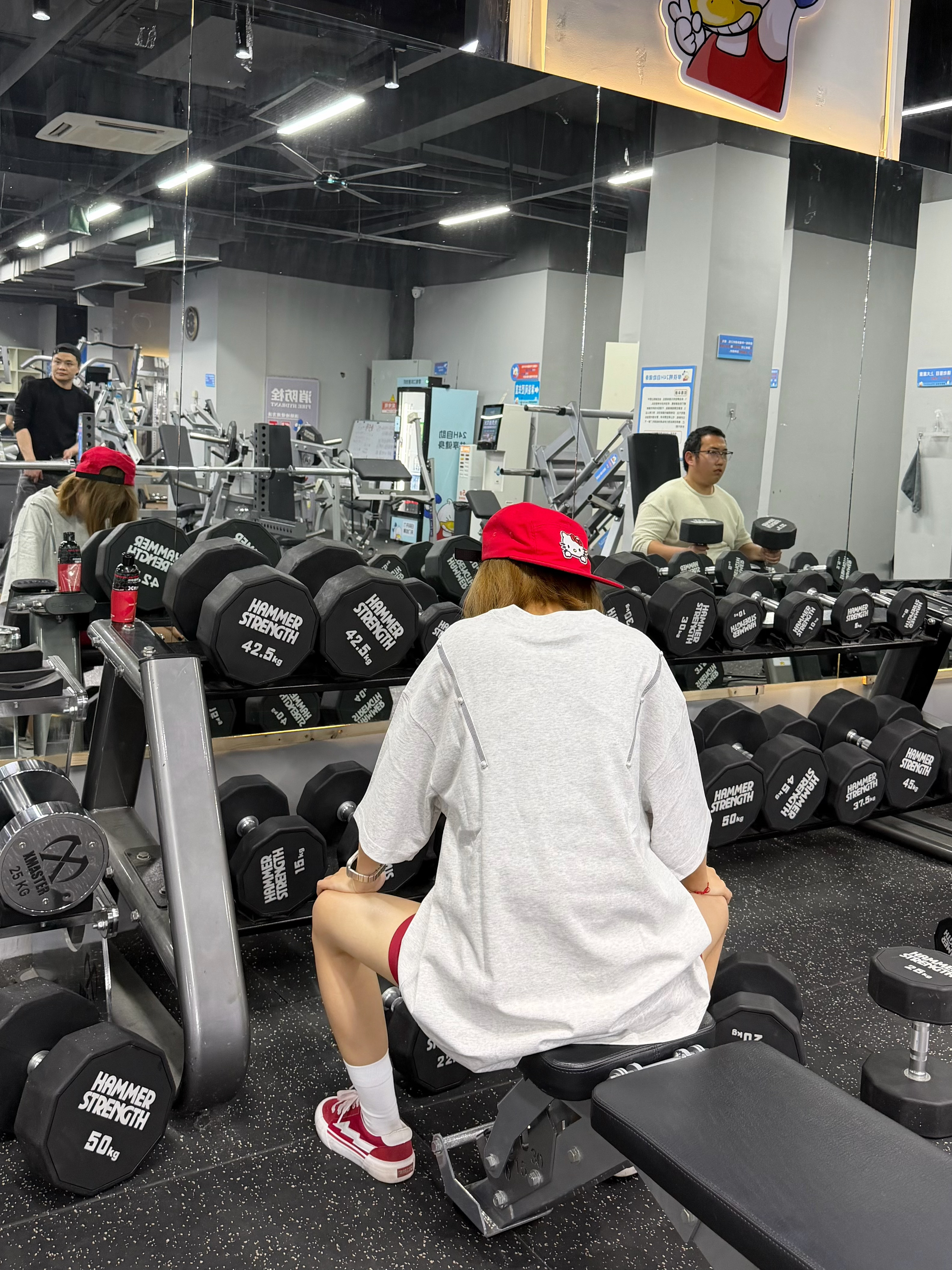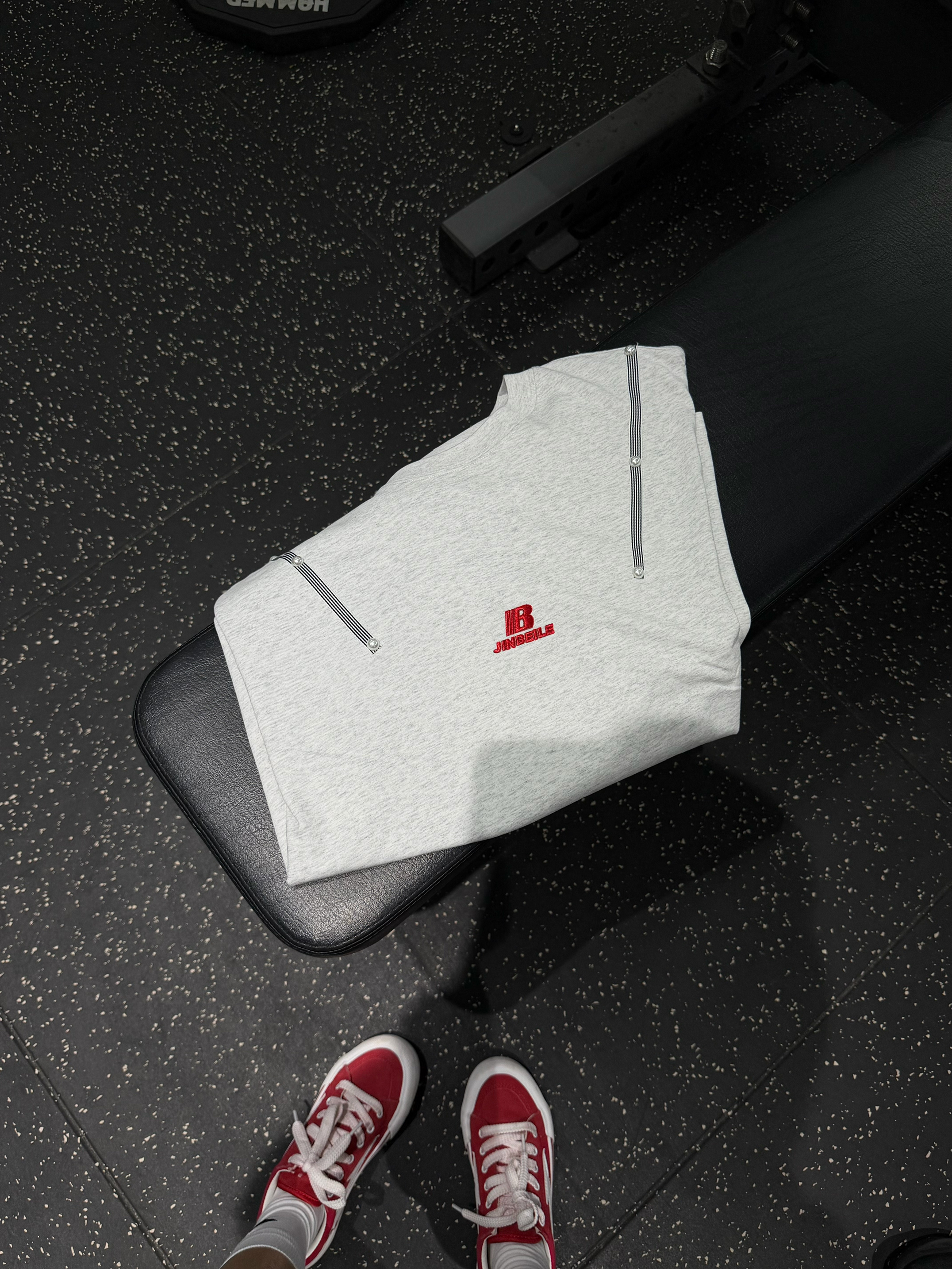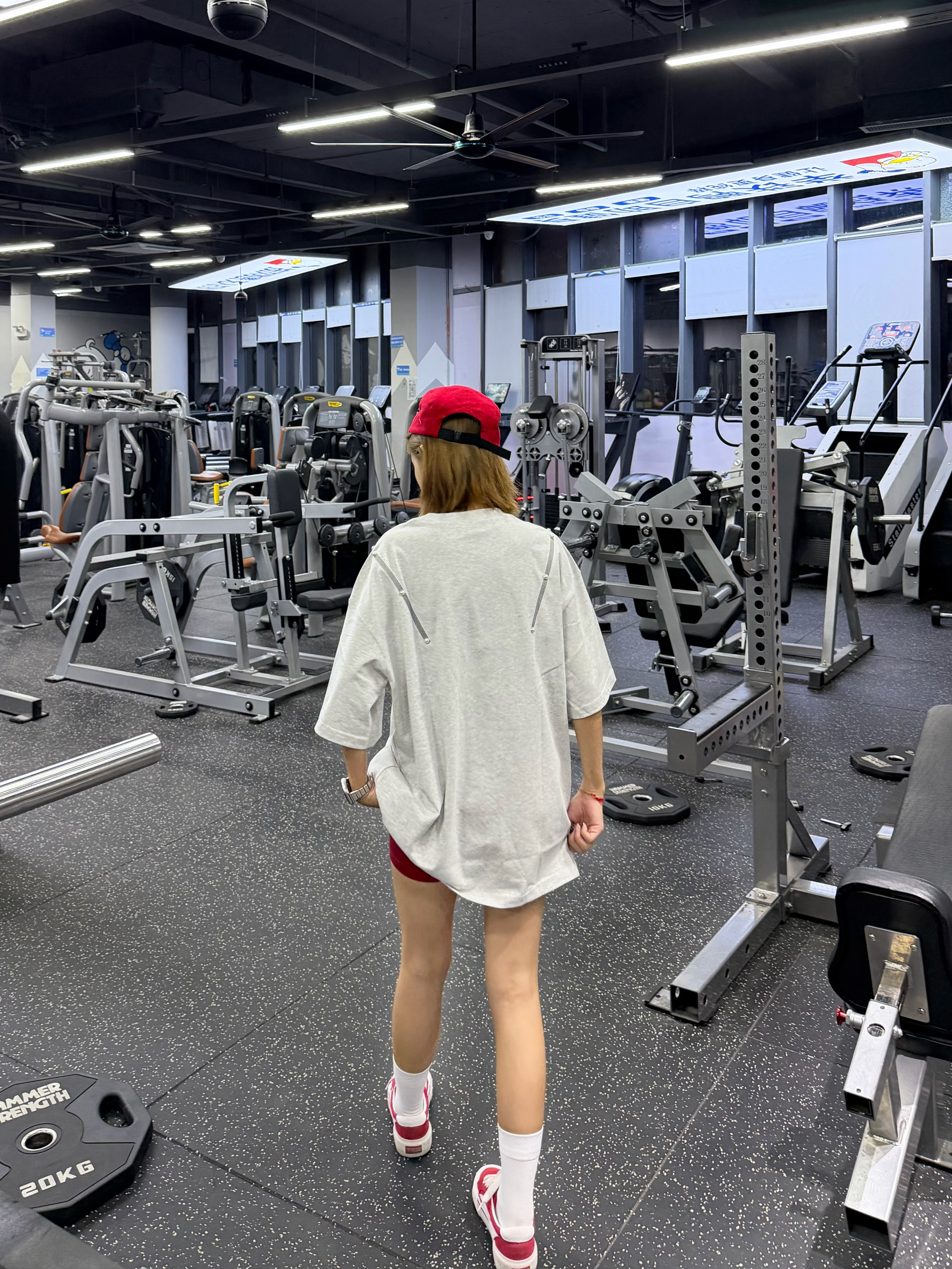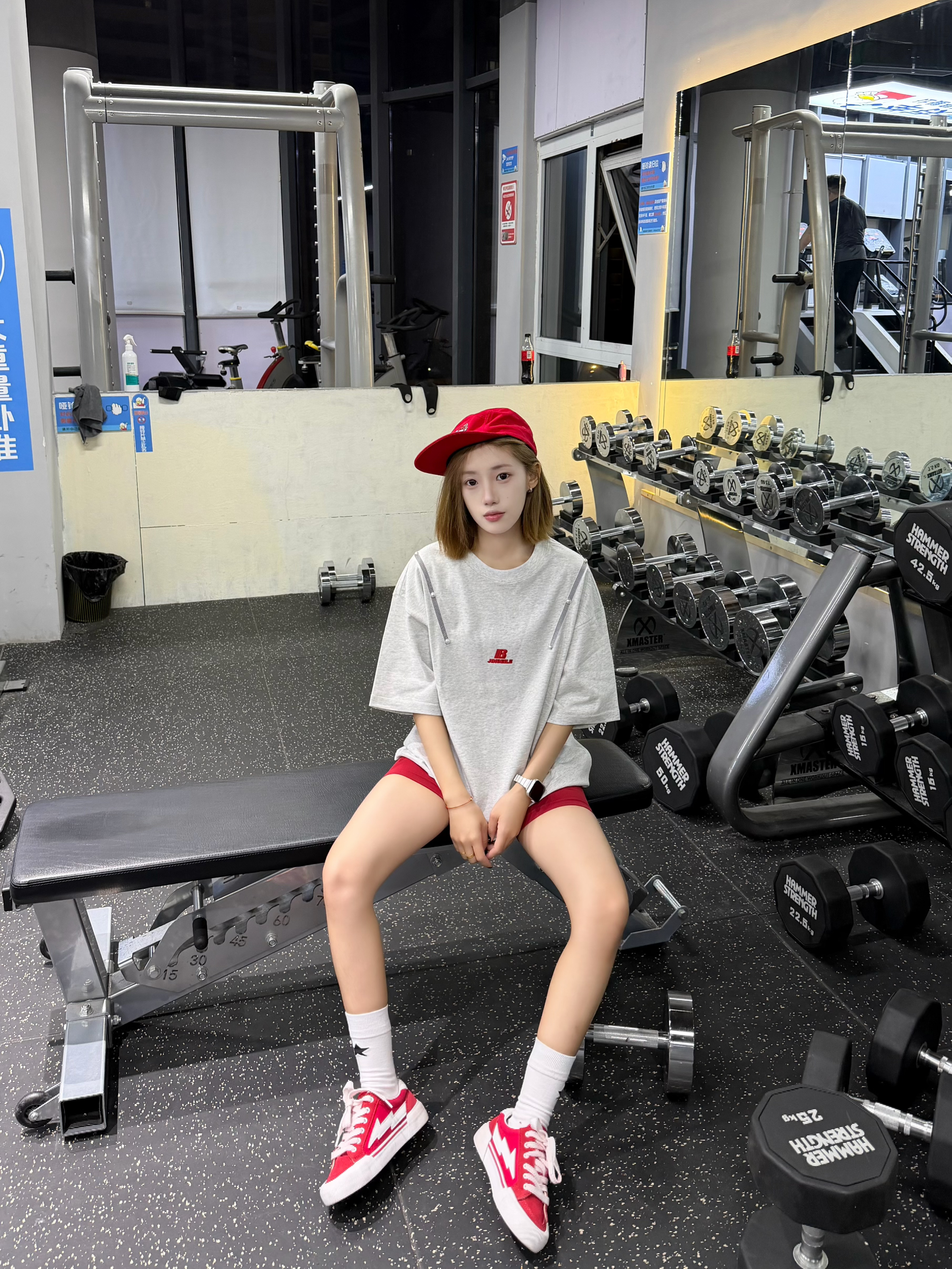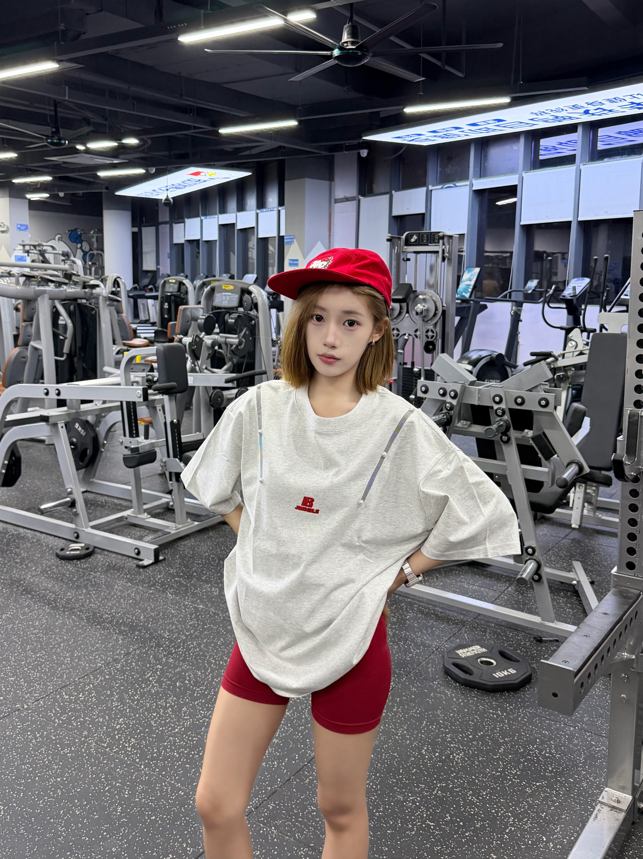 这件灰调oversize短袖,宽松版型藏肉又透气,举铁完全不束缚。搭配红短裤+红白帆布鞋,活力撞色超吸睛,红帽子还悄悄呼应了配色,健身也能穿得又美又自在,谁看了不夸一句会搭!
