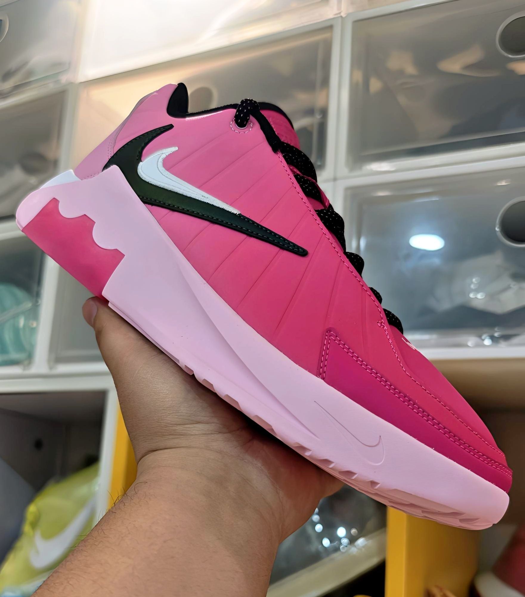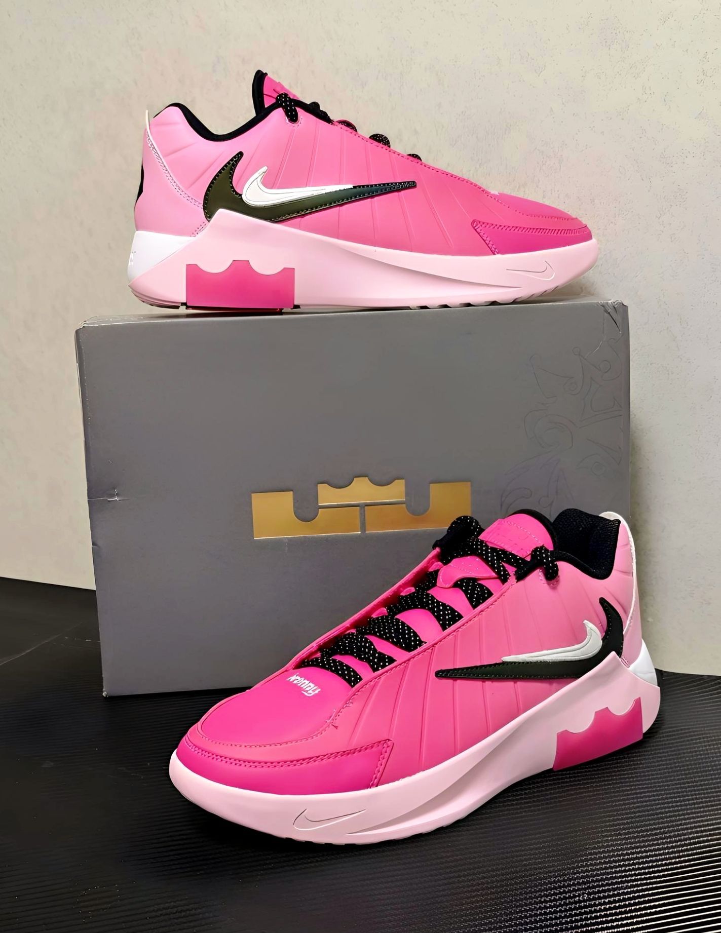 - 主色调:亮粉色鞋面+淡粉色中底,搭配白色鞋头、黑色内衬/鞋带,甜酷感拉满。
