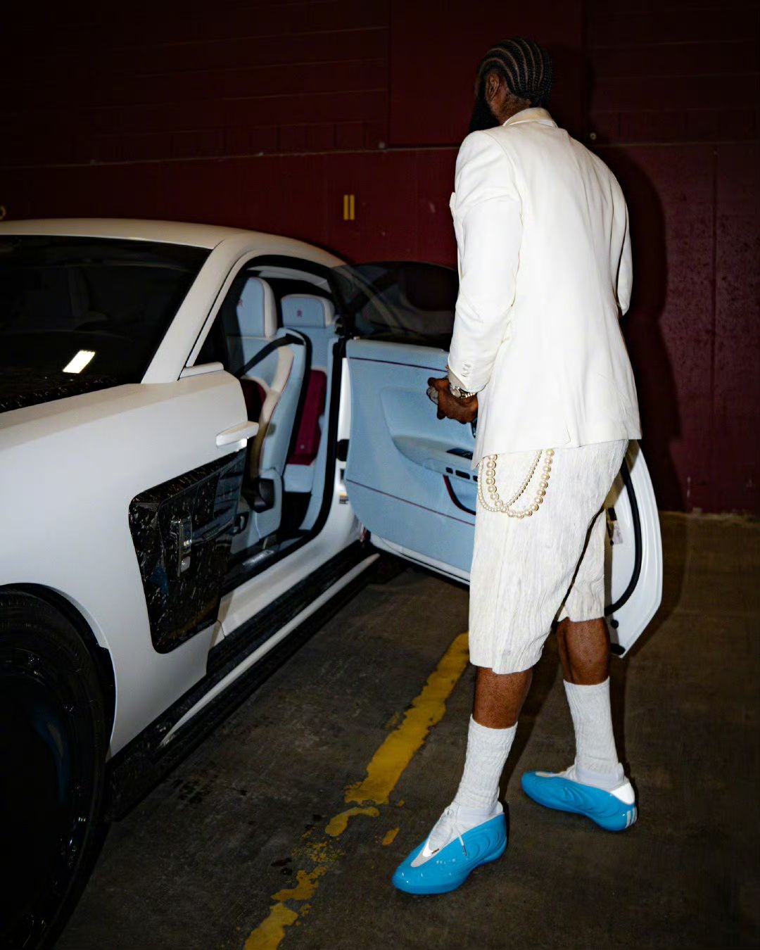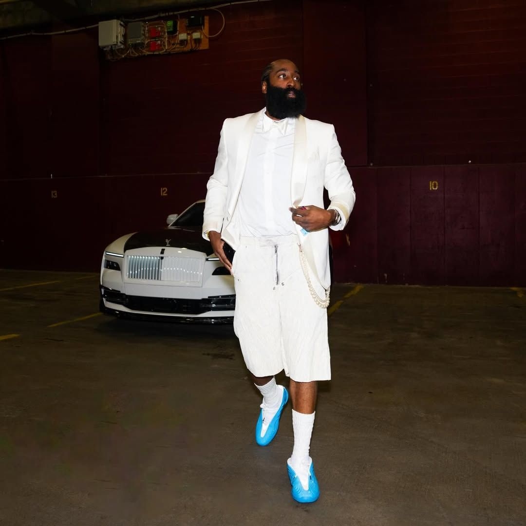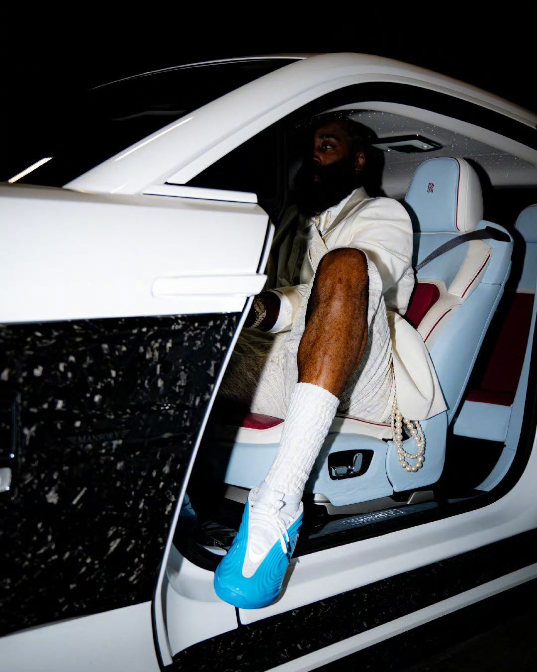致敬哈登的季后赛生涯 这个配色是为了纪念哈登连续17次参加NBA季后赛的传奇历程,鞋款的淡蓝色主调搭配白色细节,象征着他漫长且稳定的季后赛征程,也呼应了他赛前乘坐的定制劳斯莱斯闪灵的浅蓝色内饰与细节,形成了“鞋车同色”的仪式感。 鞋面采用亮面天蓝色材质,搭配白色鞋舌与后跟细节,整体视觉干净又充满活力;搭载全掌LIGHTBOOST缓震科技,兼顾了实战性能与造型辨识度。 这个配色和致敬Nipsey...