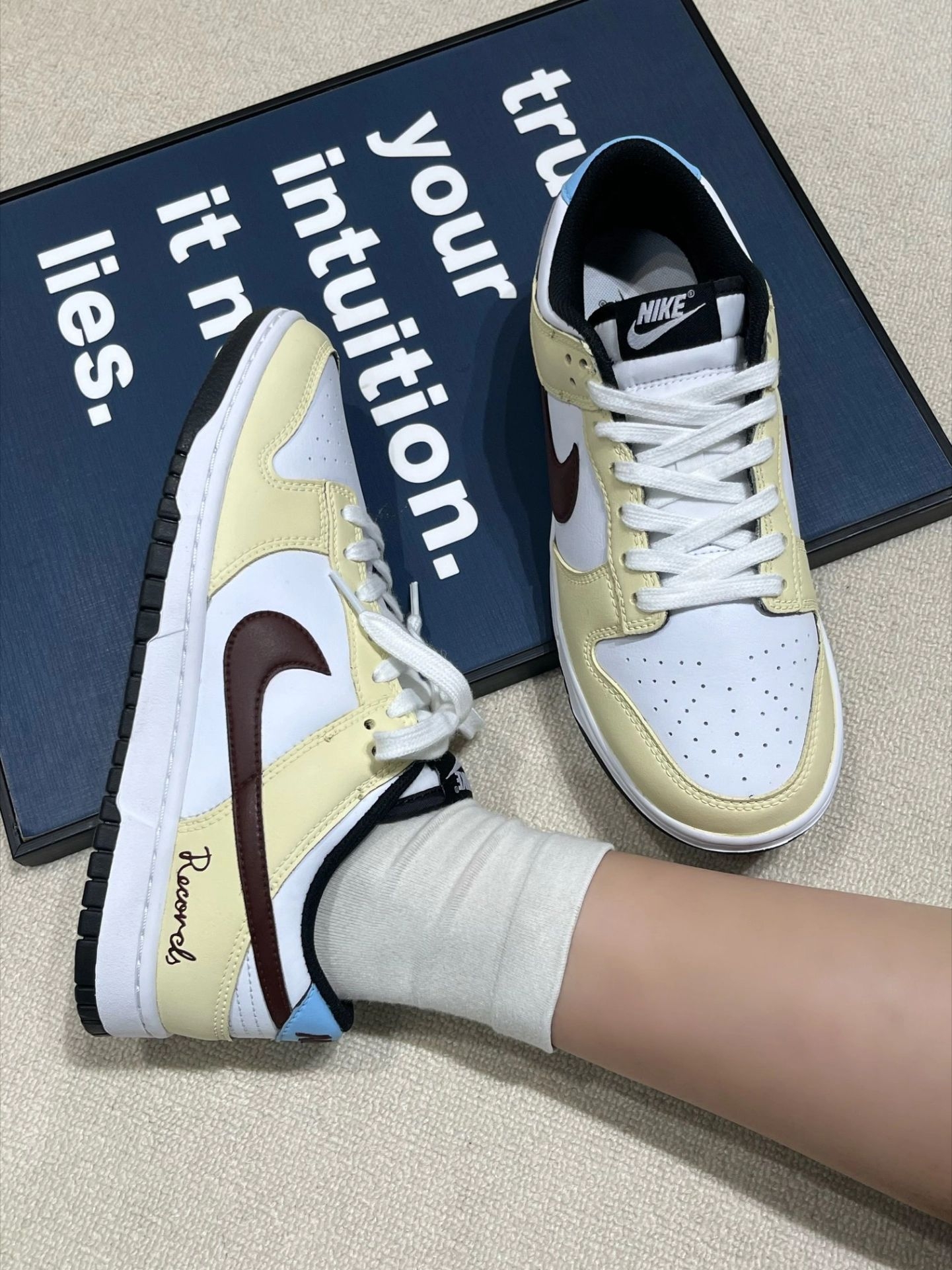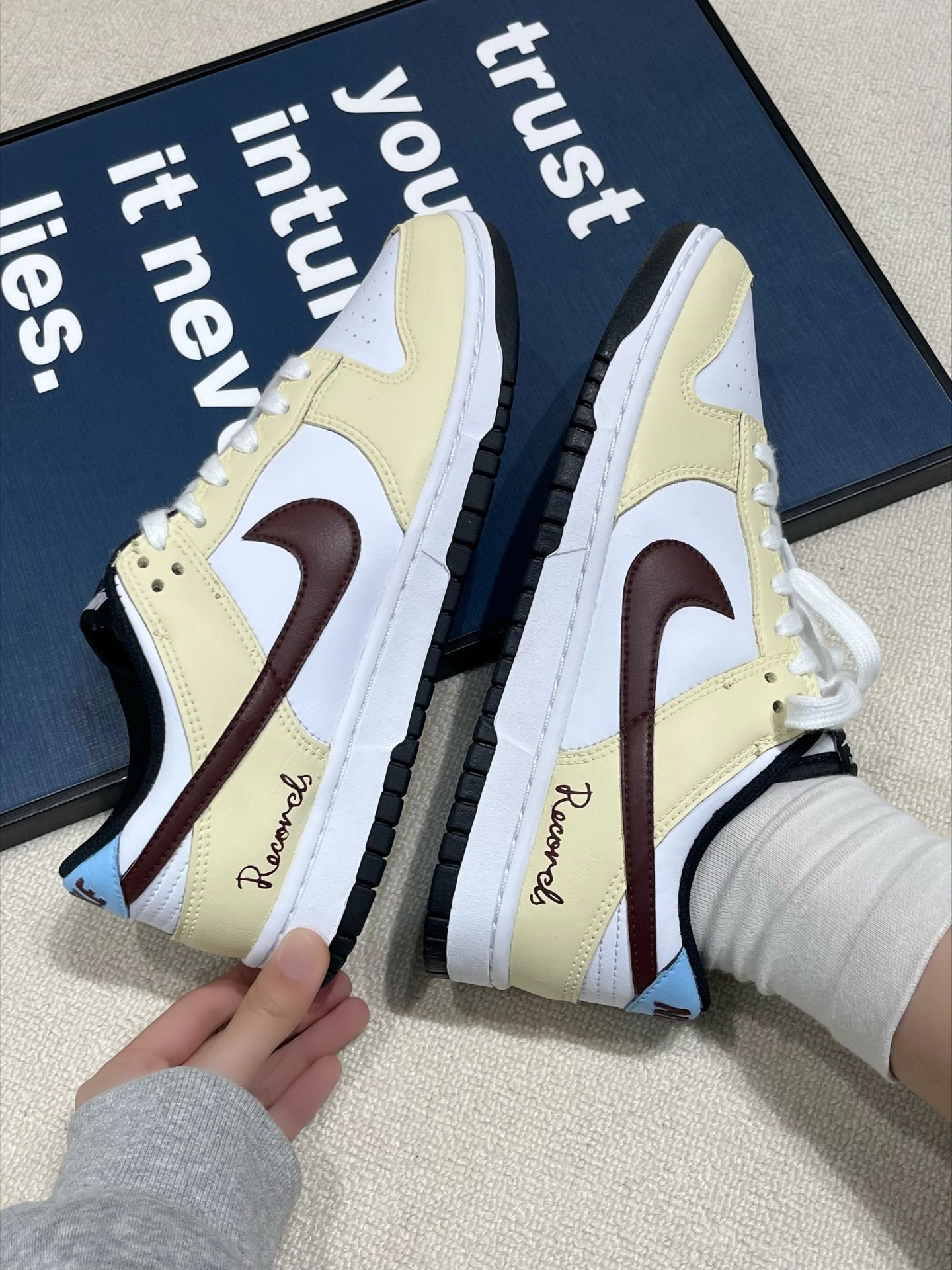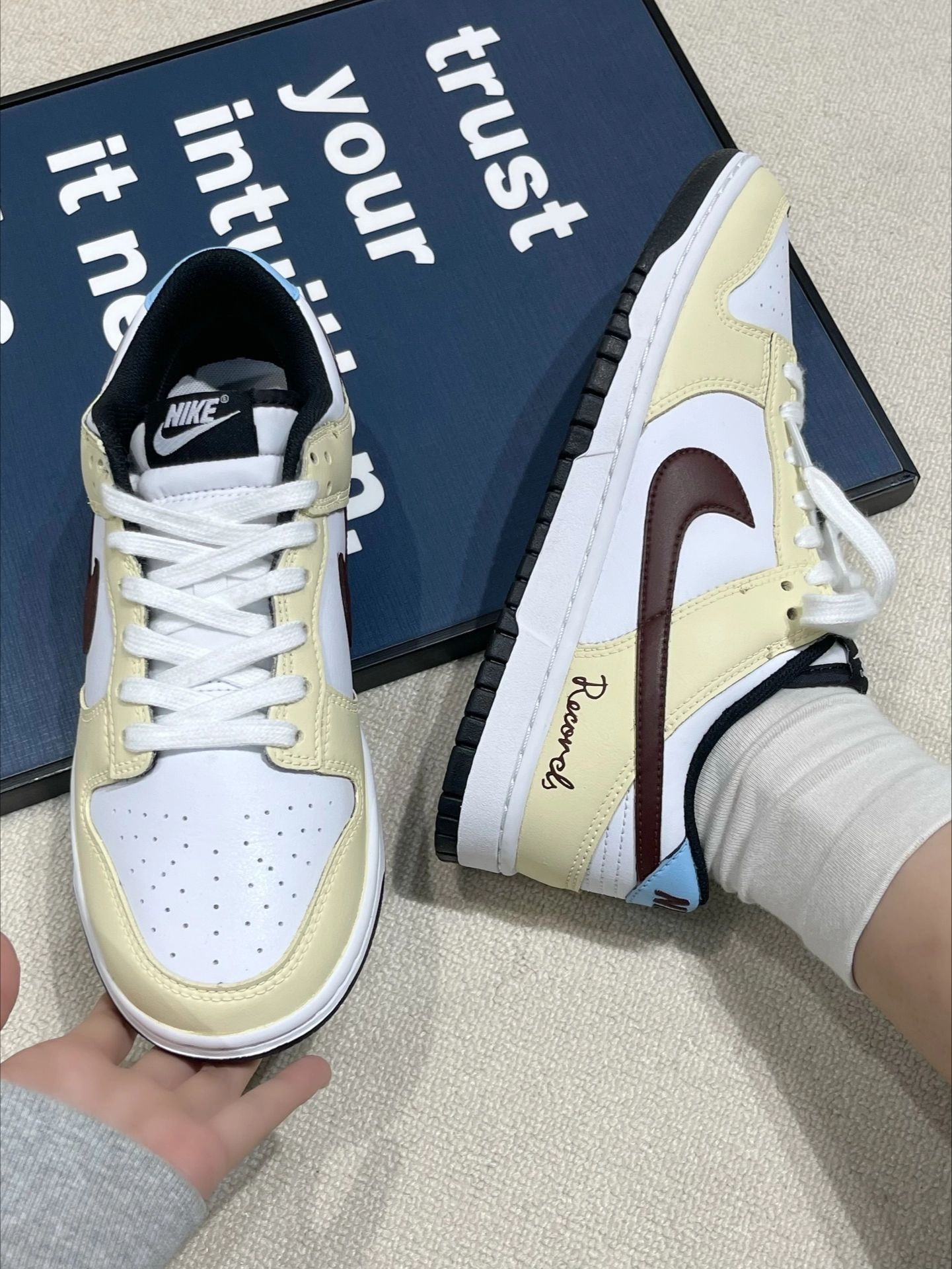 这双奶黄白+酒红勾的板鞋直接把温柔复古焊在脚上 奶fufu的米黄白底色搭配酒红Swoosh,鞋尾的手写体和淡蓝色点缀细节直接拉满,像把春日的焦糖奶茶穿在了脚上!皮革质感软乎乎的,鞋型超修饰脚型,对宽脚肉脚友好,上脚秒变漫画腿~搭配直筒牛仔裤、工装裤、百褶裙都巨有少年感!鞋底软弹不磨脚,暴走一天都不累,春夏出门随便套上就好看,温柔复古党直接锁死!