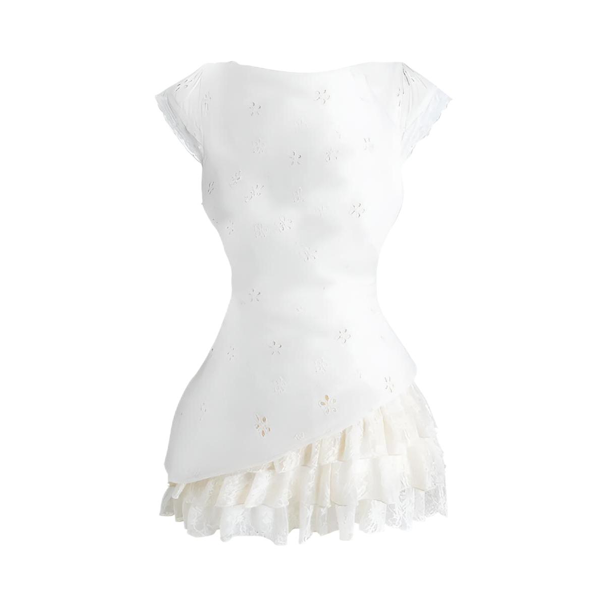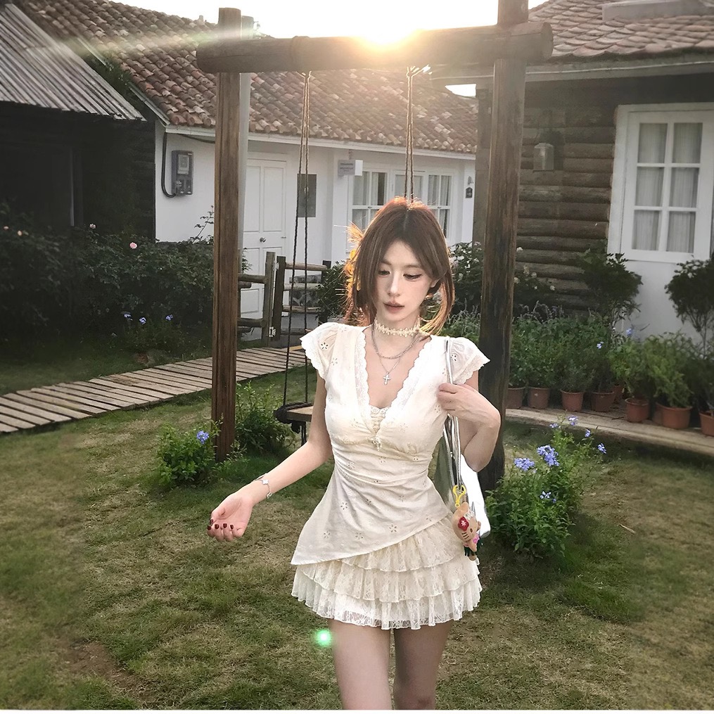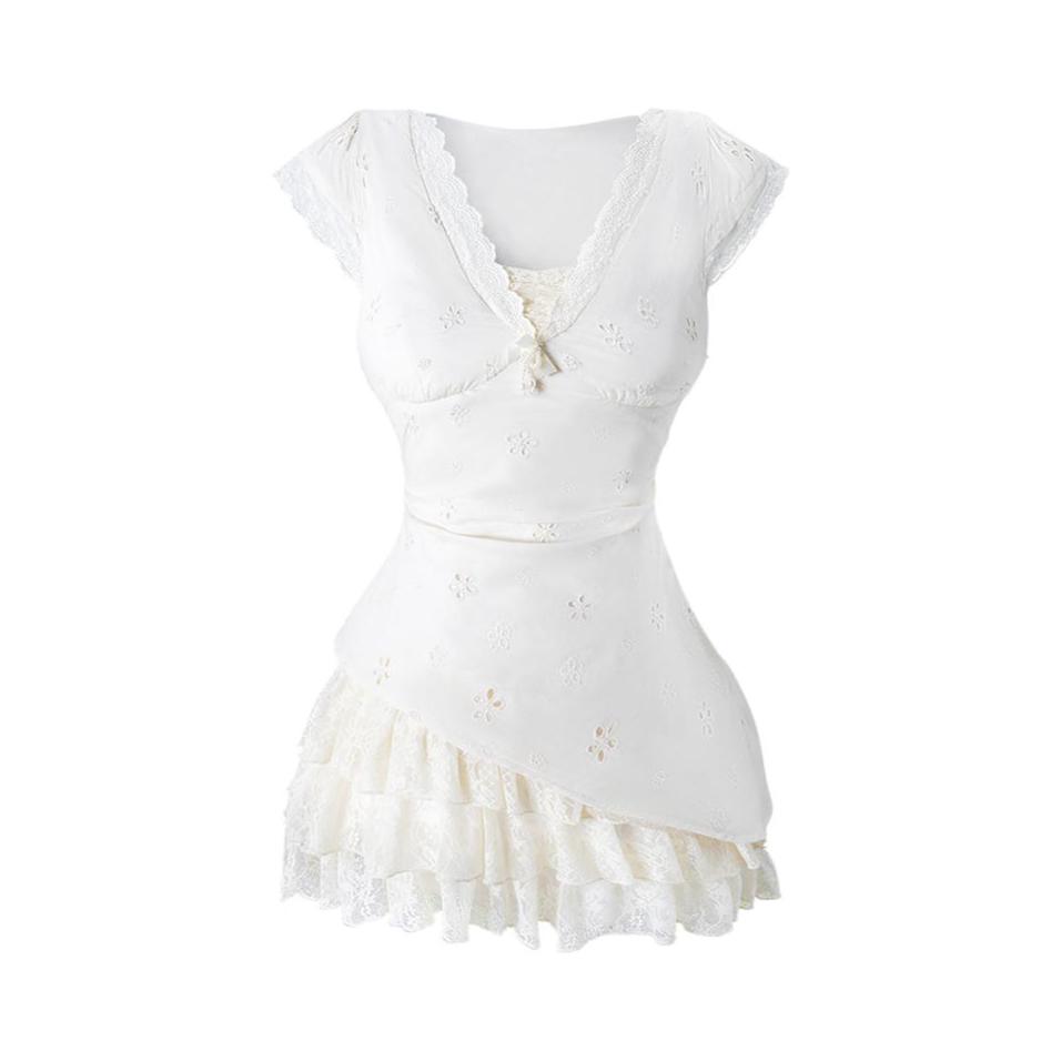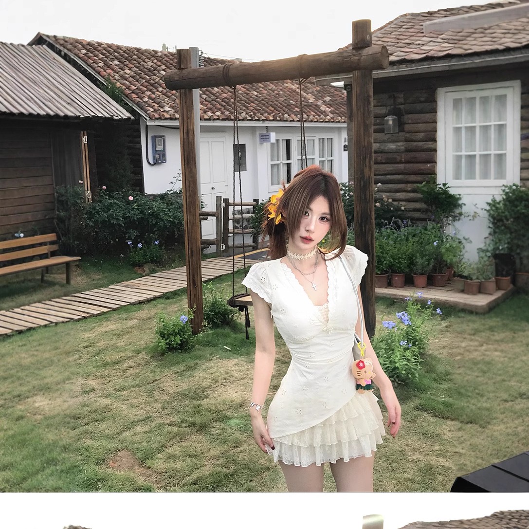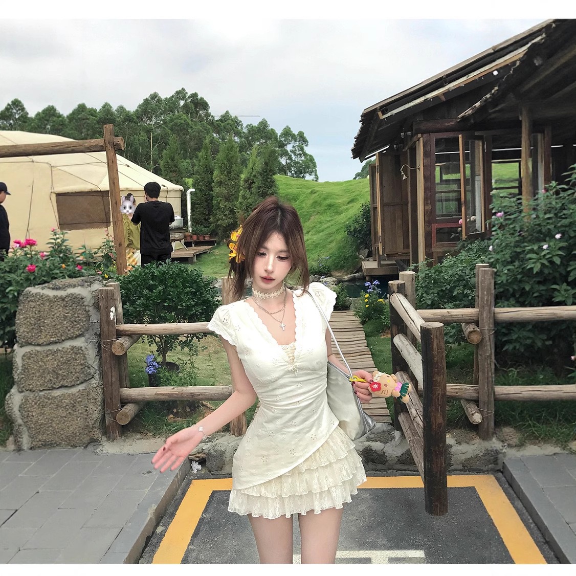 假两件蕾丝刺绣连衣裙女夏季收腰纯欲裙子法式纯欲风花边不规则裙.smlxl不退不换.