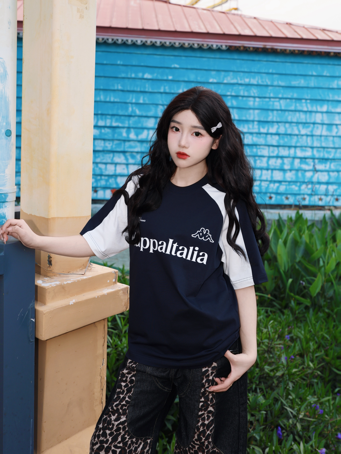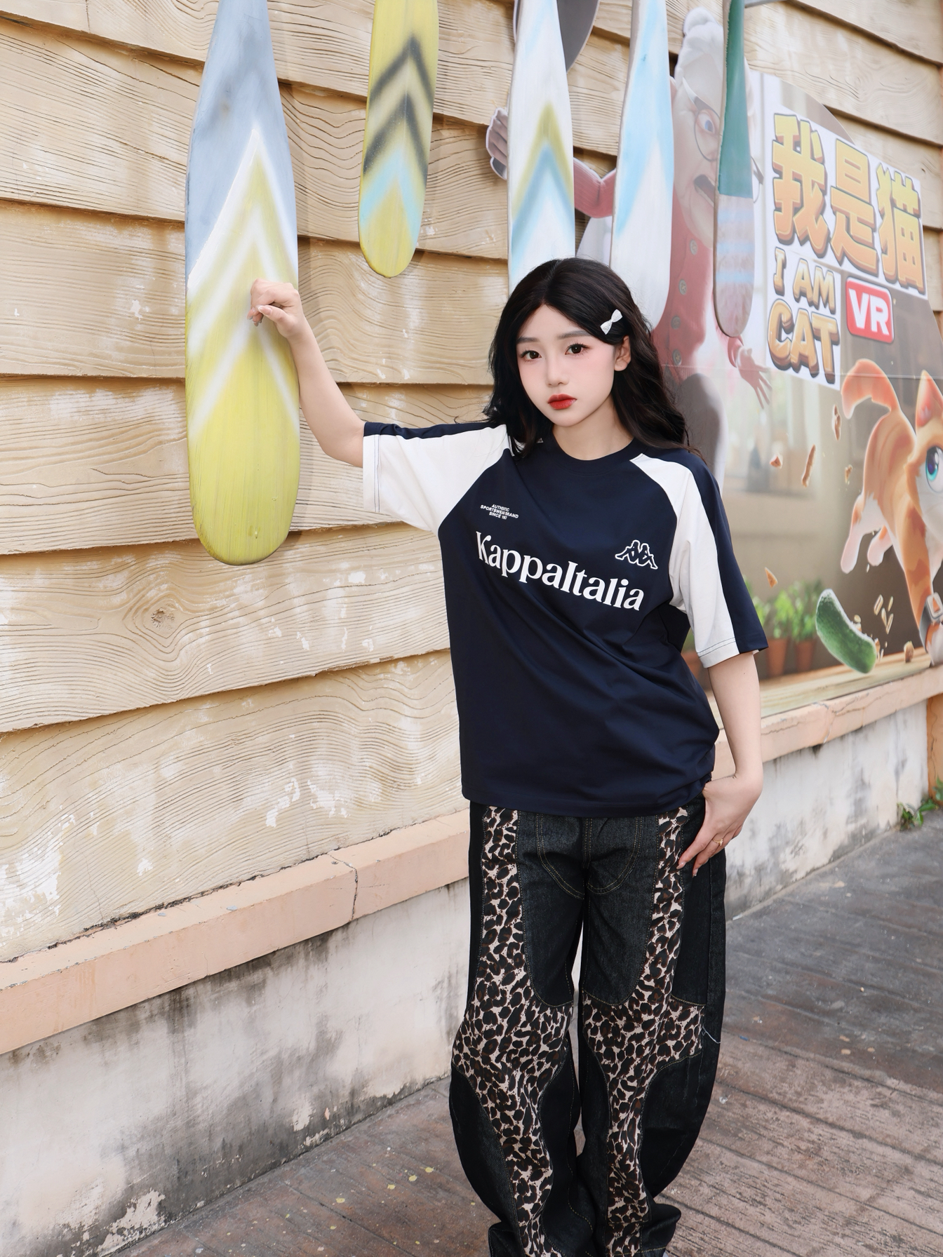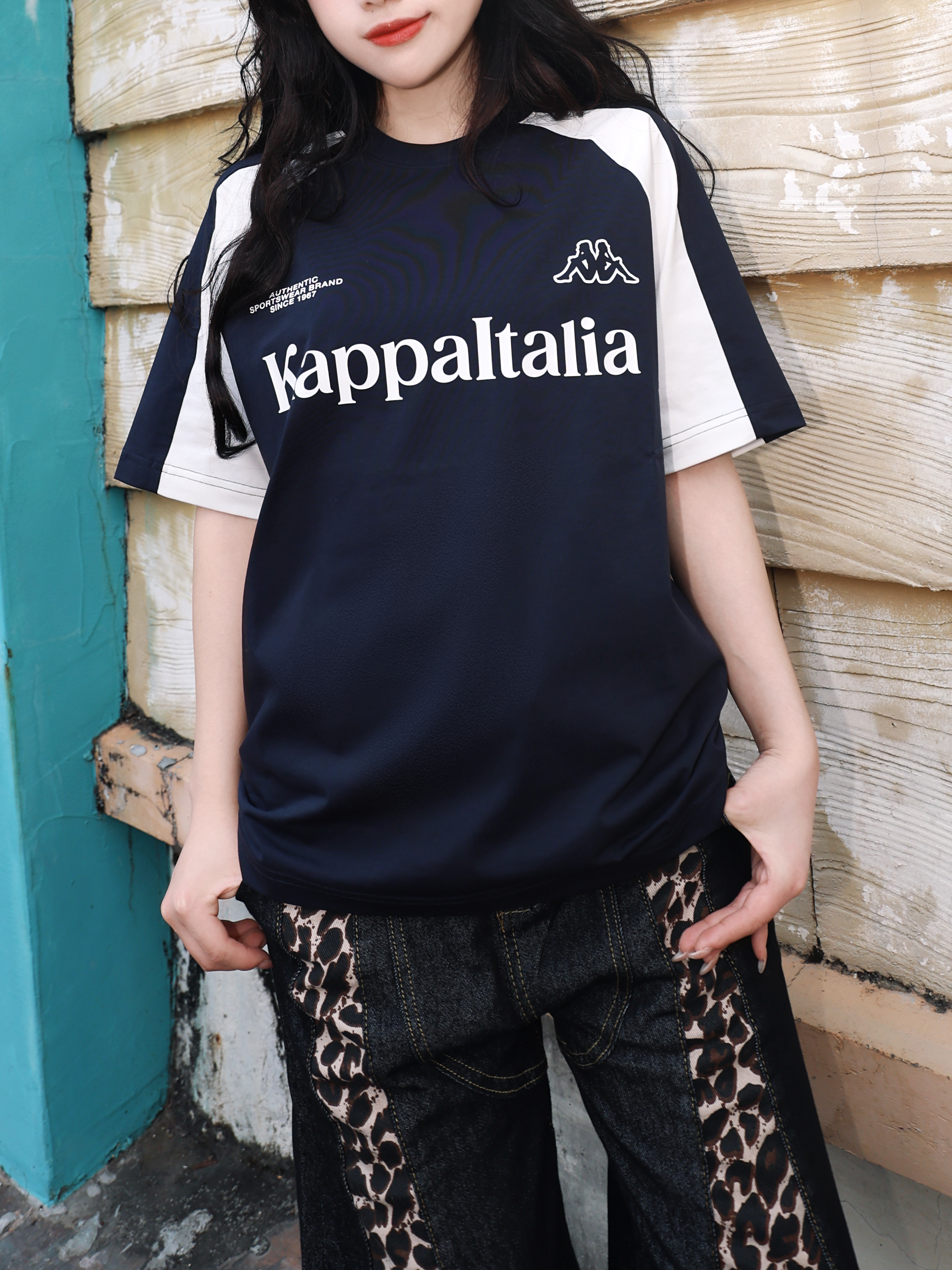 今天的主角是一一 撞色拼接款短袖 黑白撞色经典不过时 美式宽松版型 Kappa 胖瘦都能驾驭住 胸口的印花为整体的层次感增色不少 搭配一条竖状纹路长裤 人物比例一下子协调很多 这样穿出去还蛮青春!