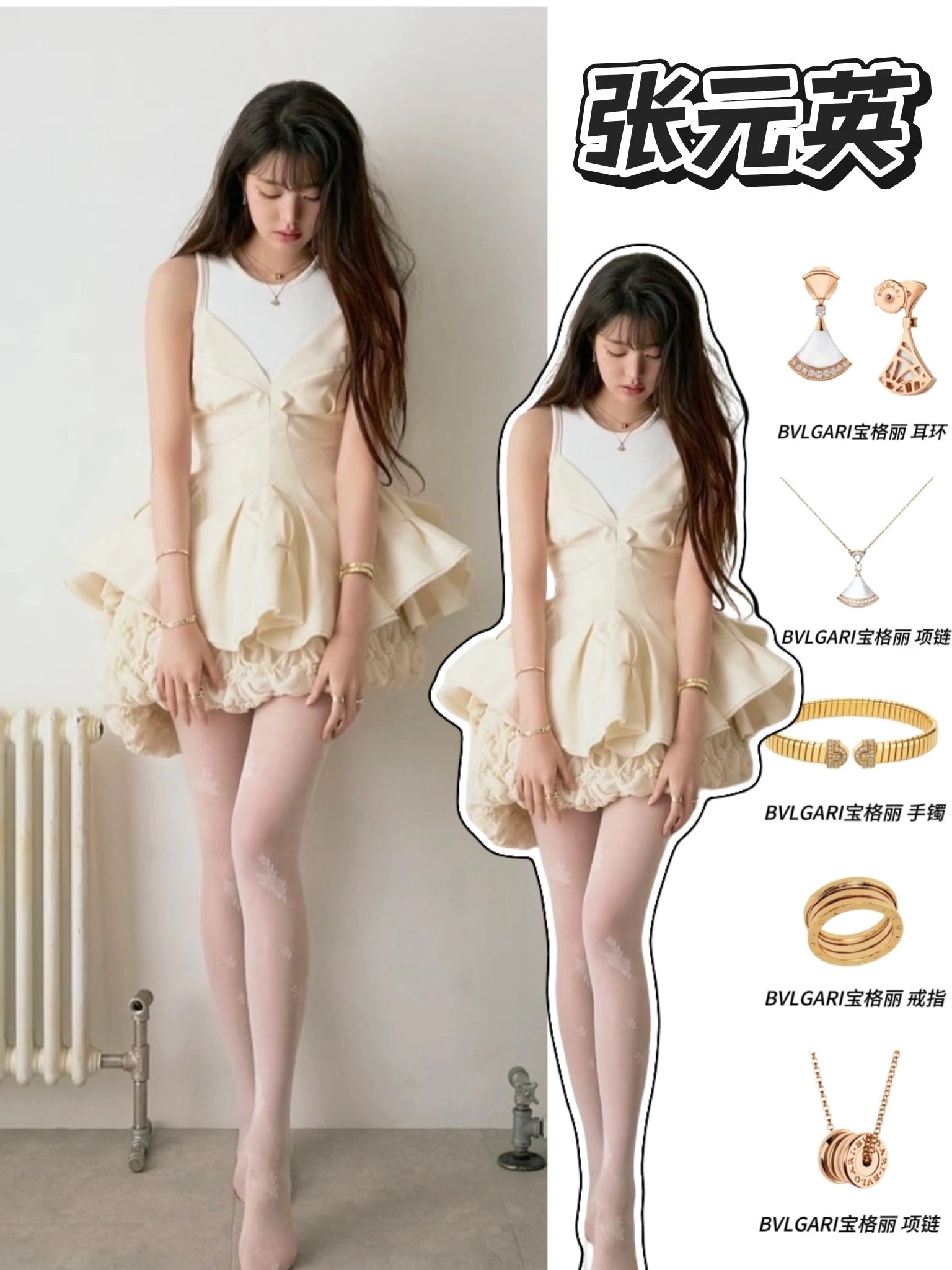 这套造型真的把张元英的贵气感拉满了!软乎乎的少女感和高级珠宝碰撞,又纯又欲,又娇又贵,完全就是小说里走出来的富家千金! 奶油白拼接花苞蓬蓬裙+白色蕾丝丝袜,自带少女感的甜妹氛围。 全套宝格丽Divas' Dream、B.Zero1系列黄金珠宝叠戴,瞬间拉高造型贵气感,完美诠释了“人间富贵花”的气质。