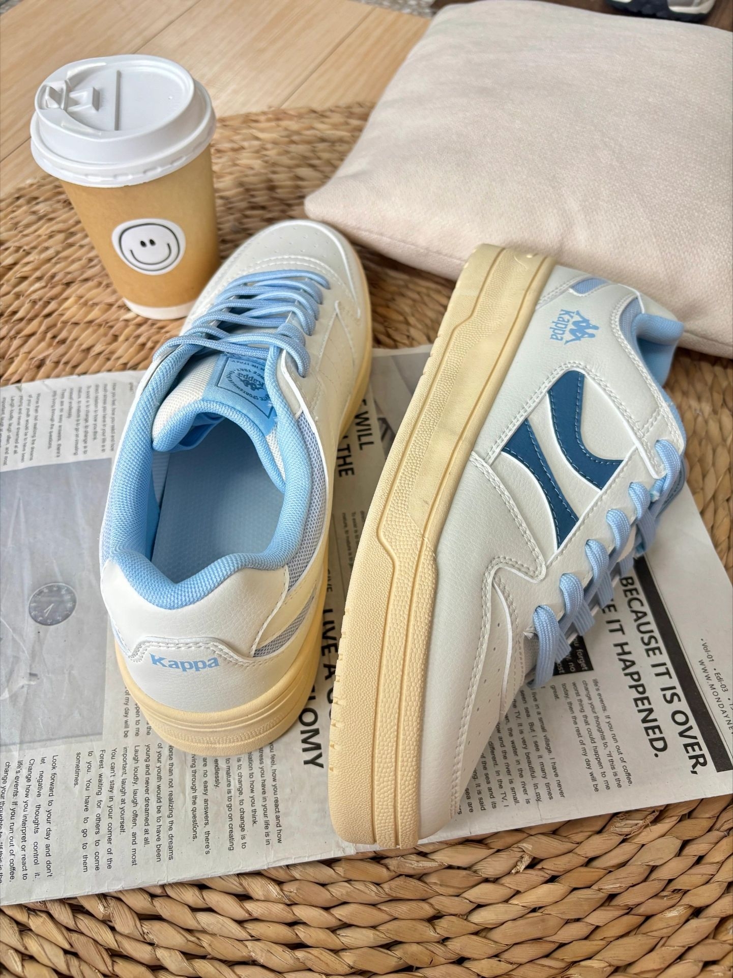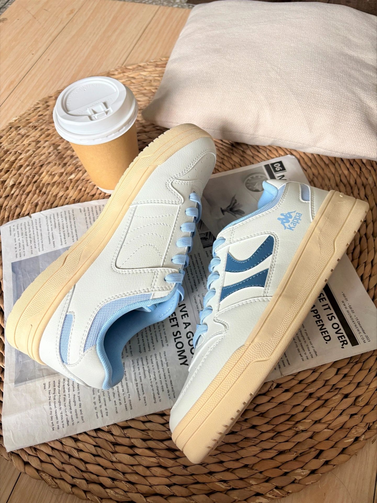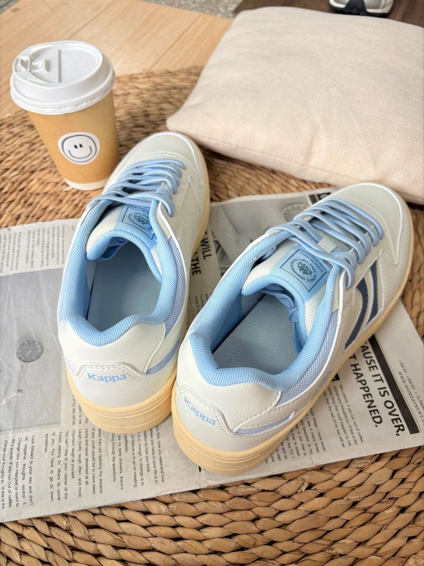 被这双Kappa板鞋的温柔配色狠狠拿捏了!奶白底色搭配浅蓝拼接,像把春日的海风穿在脚上,复古生胶底自带慵懒感,上脚巨显脚小。 鞋面是软fufu的皮质,上脚零磨合不磨脚,软弹鞋底走路像踩在云朵上,搭裙子温柔、搭裤子清爽,春夏三季都能穿,百元价位就能get同款氛围感,学生党闭眼冲不亏!