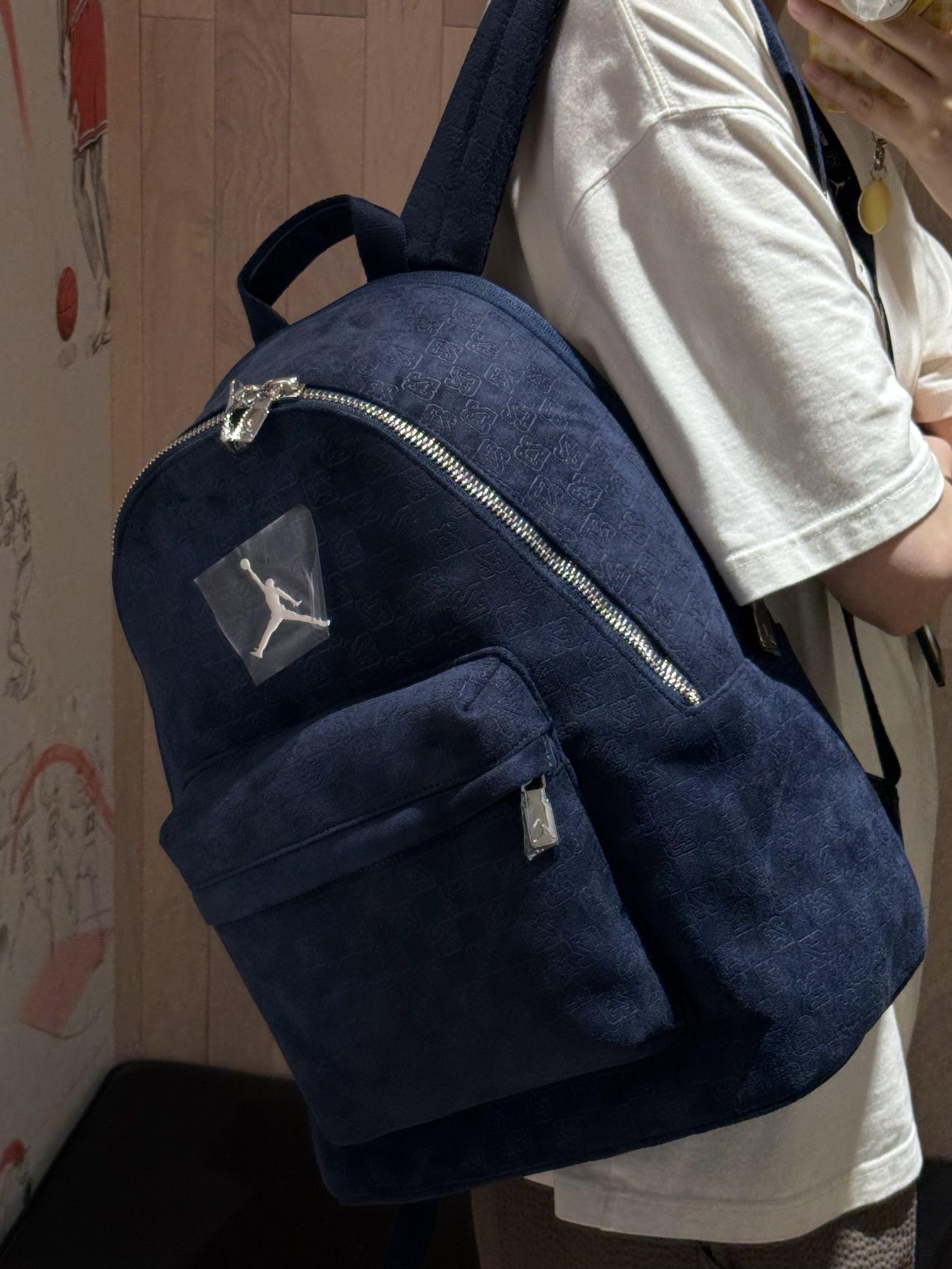 麂皮材质摸起来软乎乎的,质感绝了 不像普通包包的硬挺感,贴肤又舒服 而且压纹的AJ标志低调又有细节 双肩包日常通勤装电脑、书本完全没问题、容量超能打手提包不管是短途出行装衣物,还是当健身包都合适
