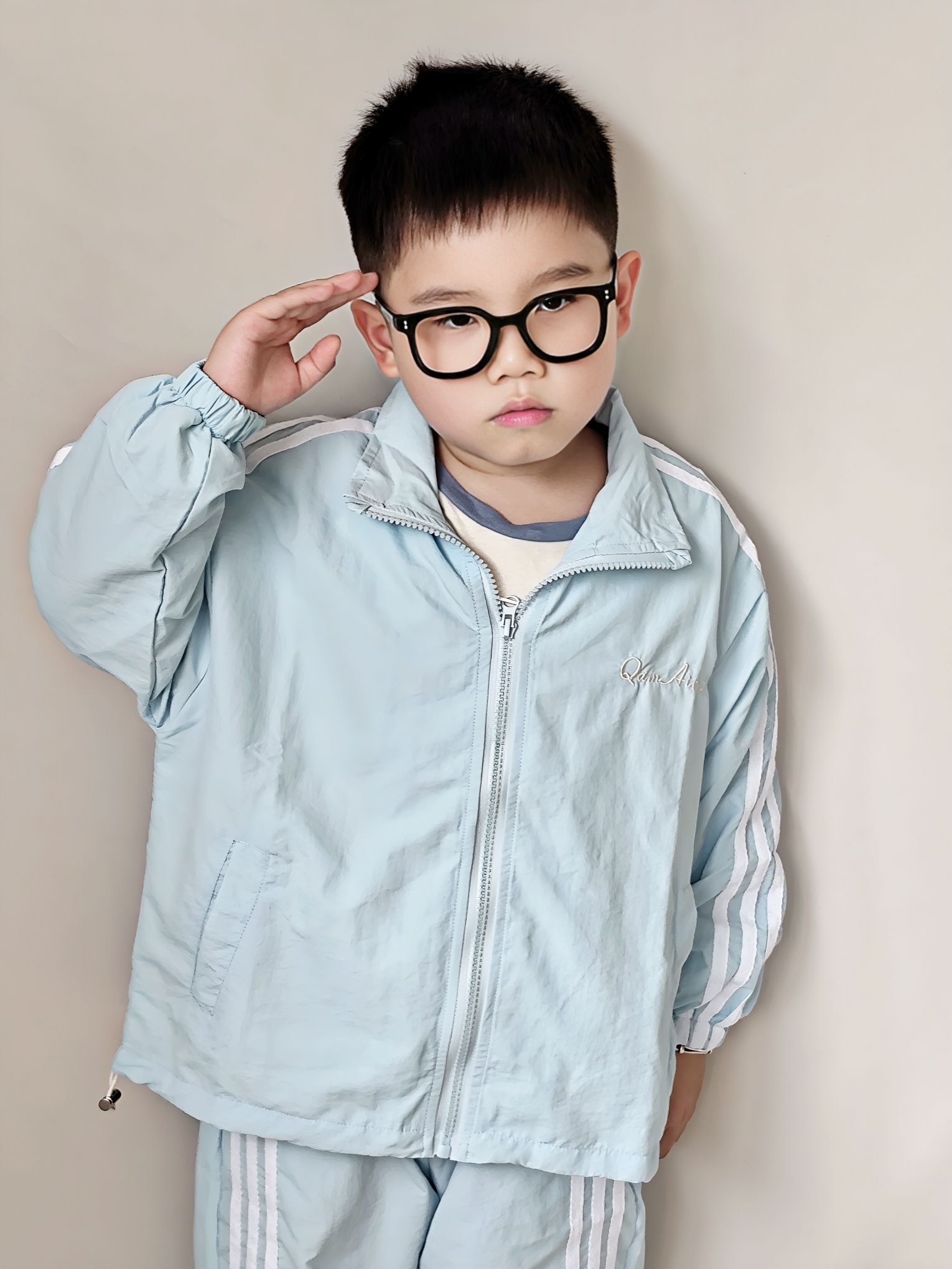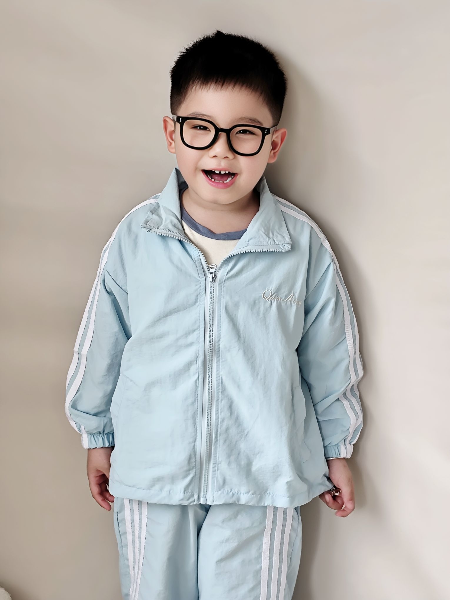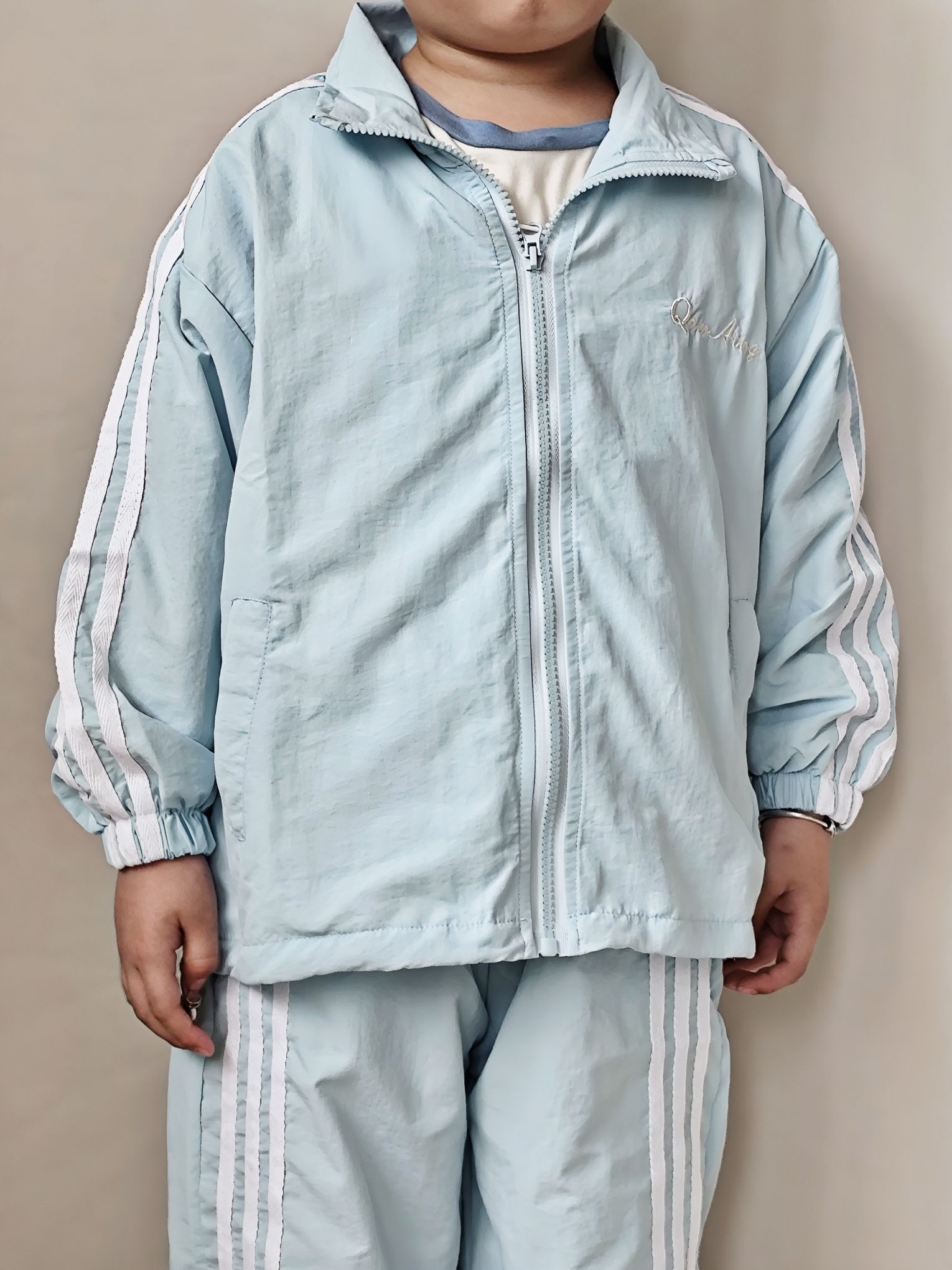 谁懂啊!宸宝这套浅蓝运动套装,真的把春日少年感焊在身上了! 作为宝妈,给男宝挑衣服真的很怕踩雷,要么款式土气,要么面料不舒服。这套我是一眼就看中了,到手真的惊喜满满! ✅ 真实穿搭感受: - 面料是那种轻薄的速干材质,摸起来滑溜溜的,夏天穿完全不闷汗,宸宝跑跳一整天后背也没湿,透气性绝了。 - 版型是宽松的运动款,不勒胳膊不勒腿,他玩滑梯、跑跳都毫无束缚感,而且落肩设计+三条杠元素,又潮又显精神,...