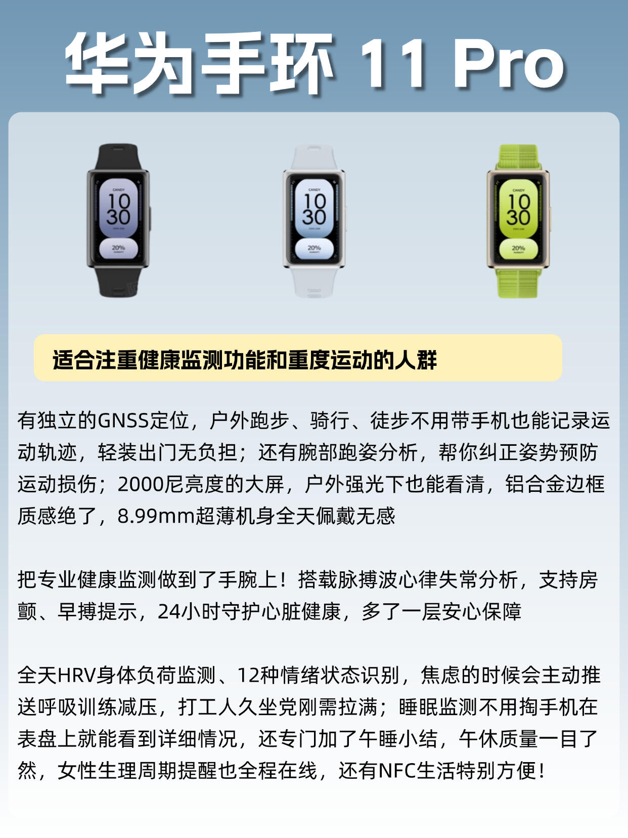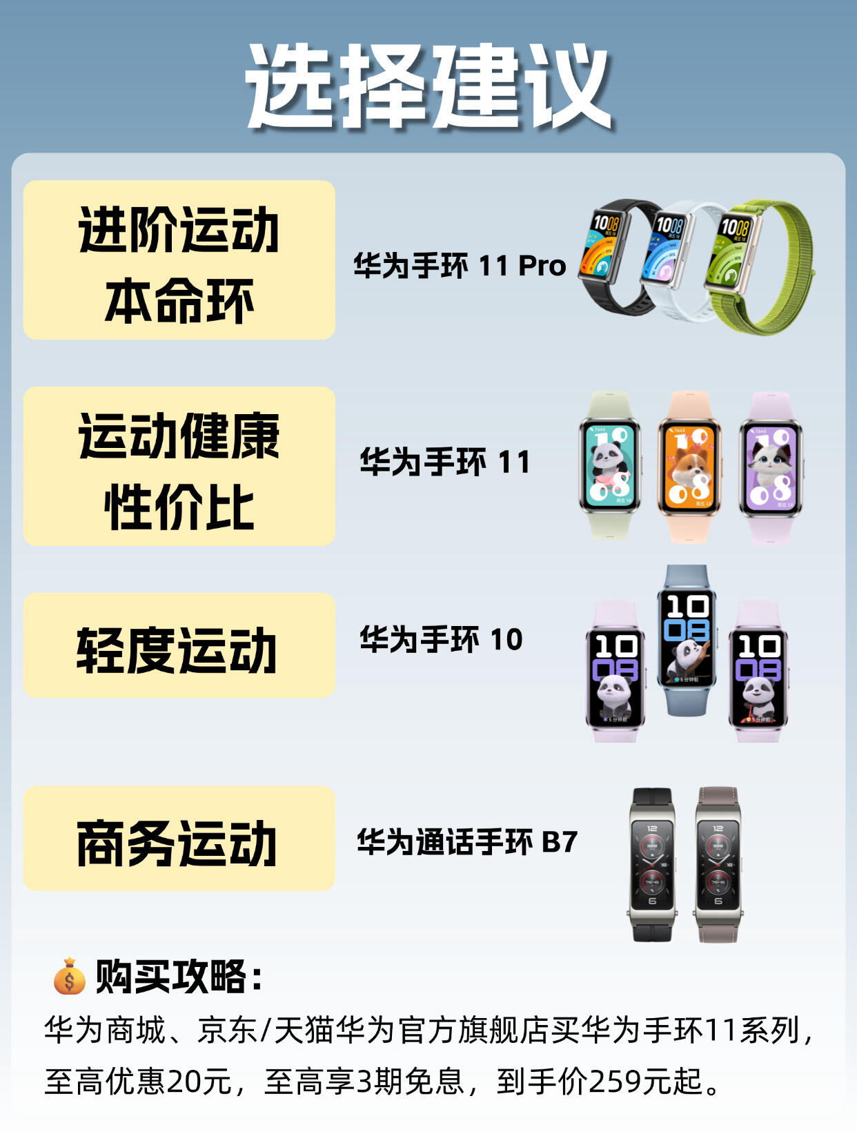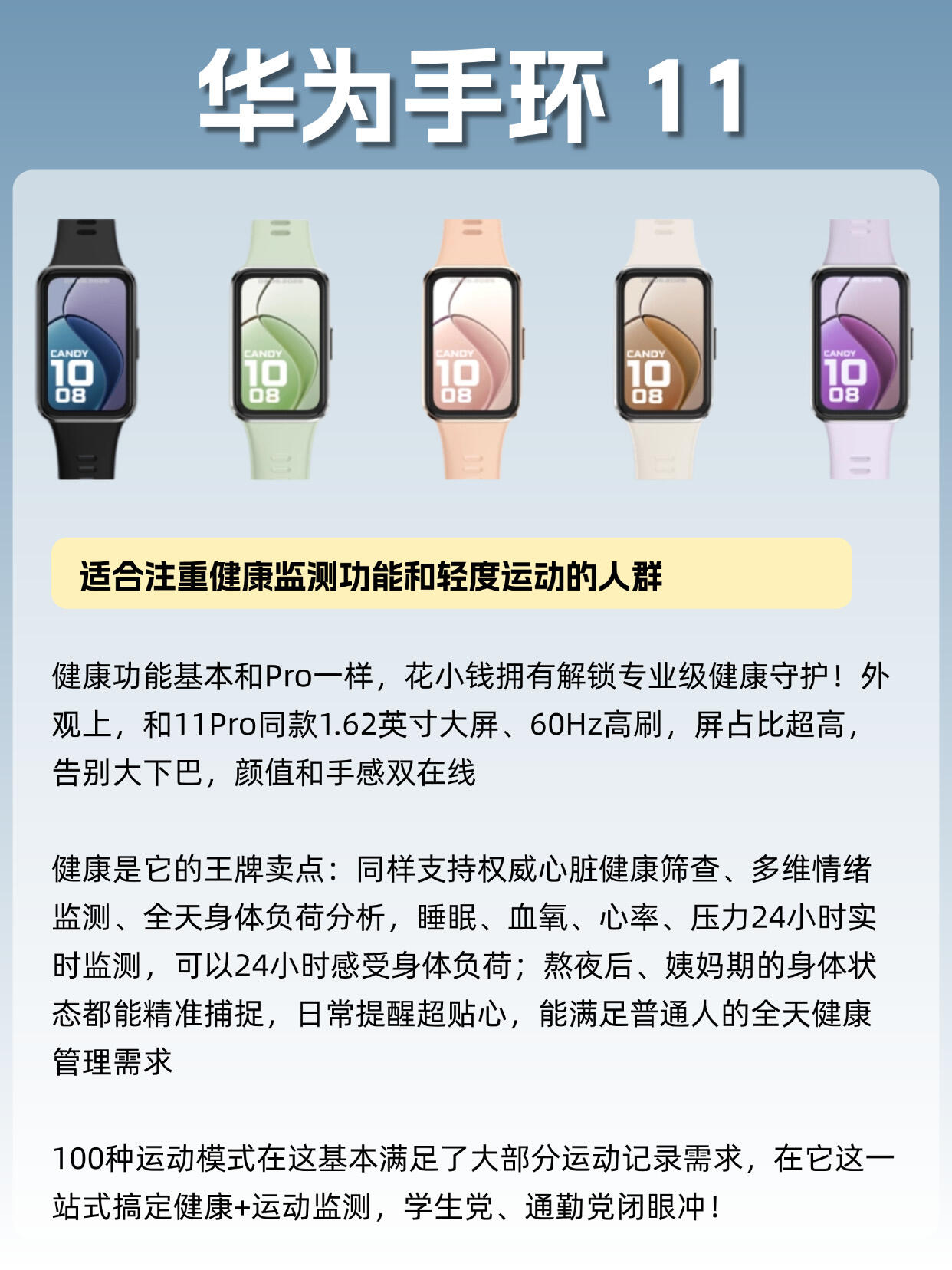 按需求直接对号入座,告别纠结👇 ✅ 手环11 性价比之王💥 大屏+全功能健康监测,预算有限直接冲 ✅ 手环11 Pro 运动党本命🏃 独立定位+专业健康分析,跑步/骑行首选 ✅ 手环10 新手友好款🐼 基础监测够用,熊猫表盘超可爱 ✅ 通话手环B7 商务专属📞 一键接打电话,兼顾颜值与通勤