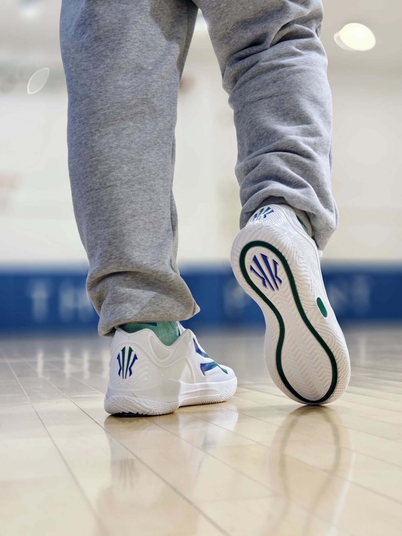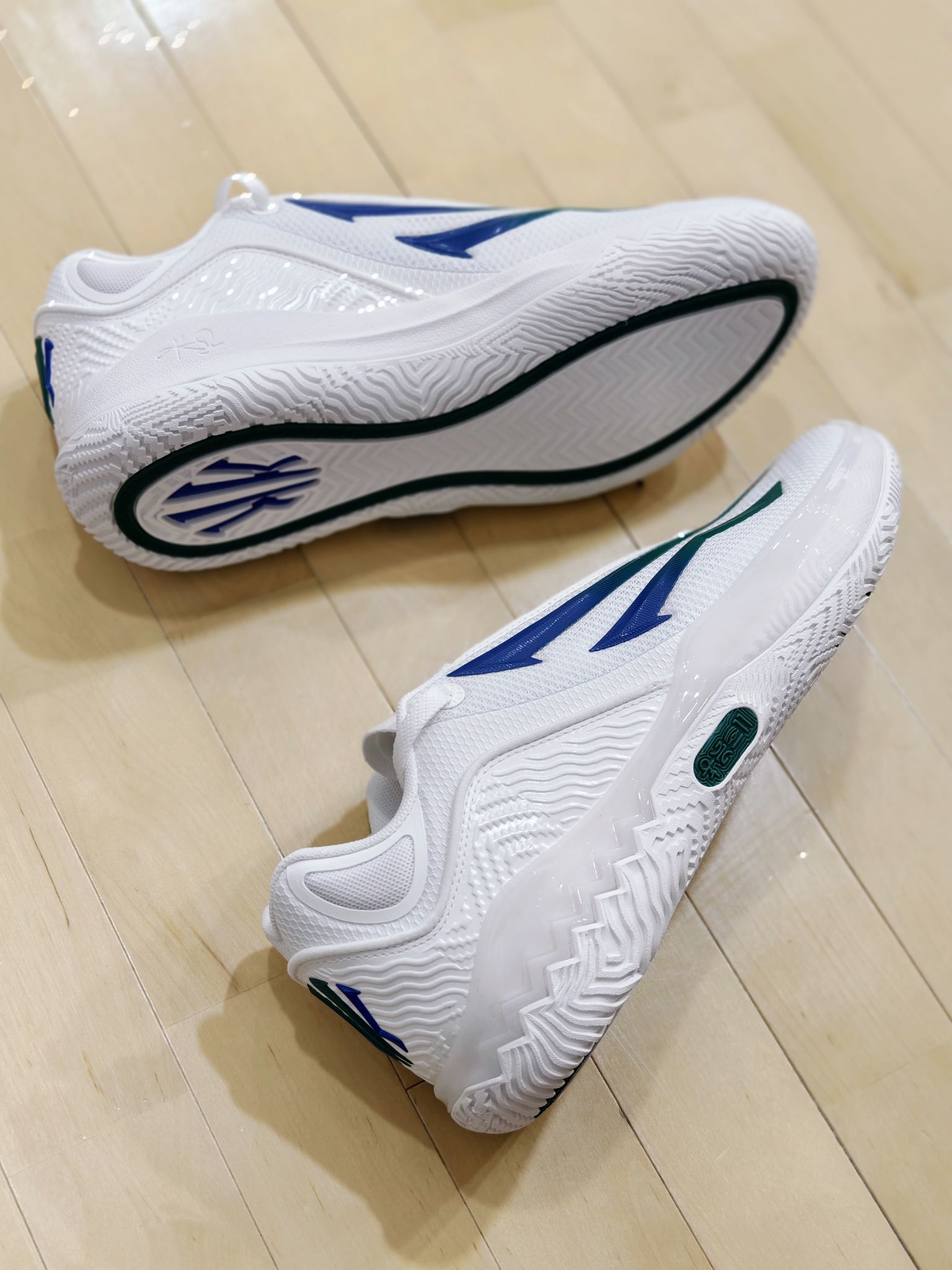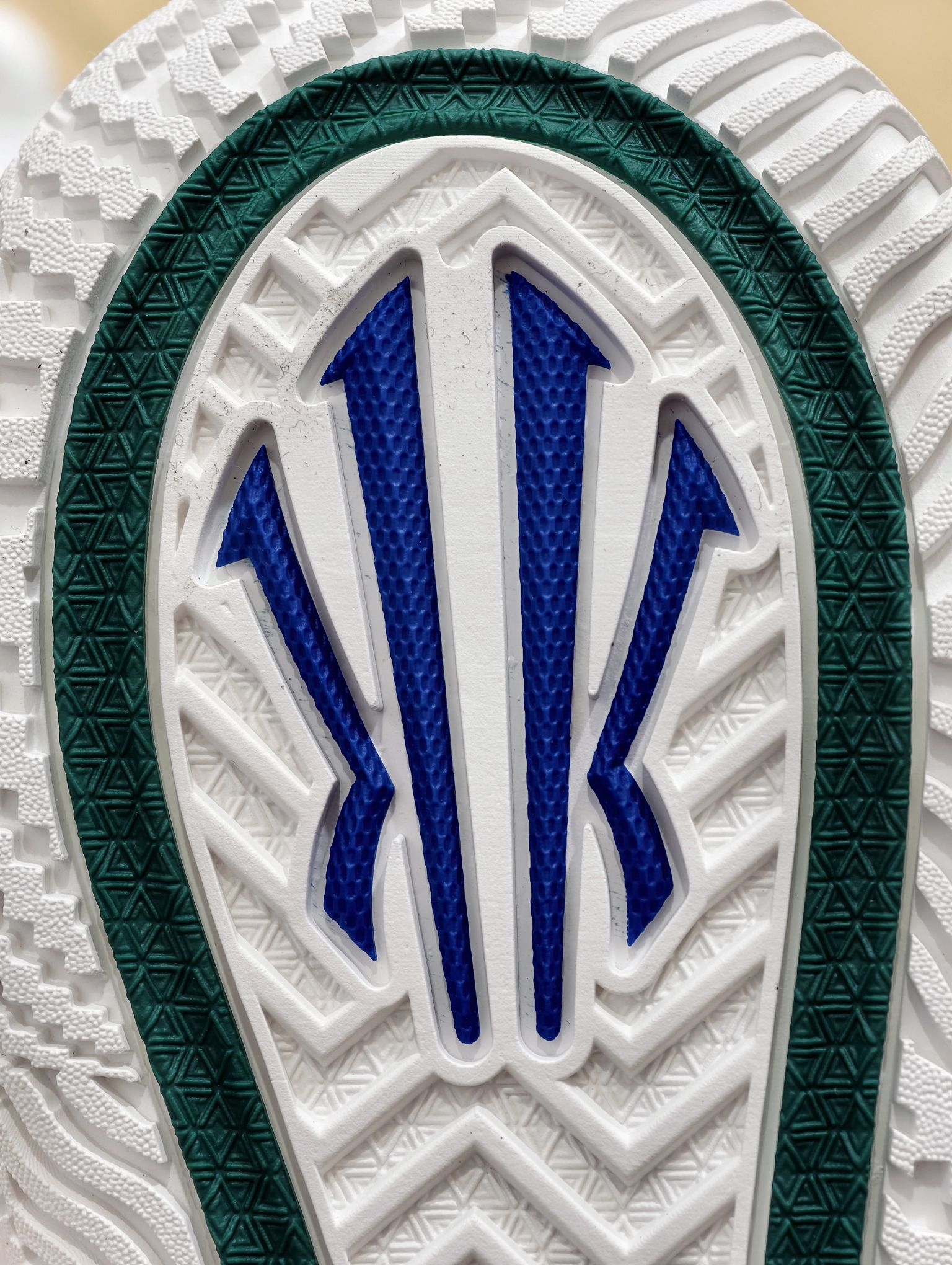安踏为凯里·欧文推出的支线实战篮球鞋,夏季版在原版基础上做了轻量化和透气升级,非常适合夏季外场打球。 2. 设计亮点 - 配色:白底色搭配蓝绿渐变线条,灵感源自达拉斯独行侠队,清爽又有辨识度。 - 鞋面:采用更轻薄的工程网布,鞋舌和内衬也做了减薄处理,兼顾透气与支撑,解决了原版夏季闷脚的问题。 - 缓震与抓地:搭载A-SHOCK PRO中底,回弹反馈直接;波浪形橡胶外底,抓地力能应...