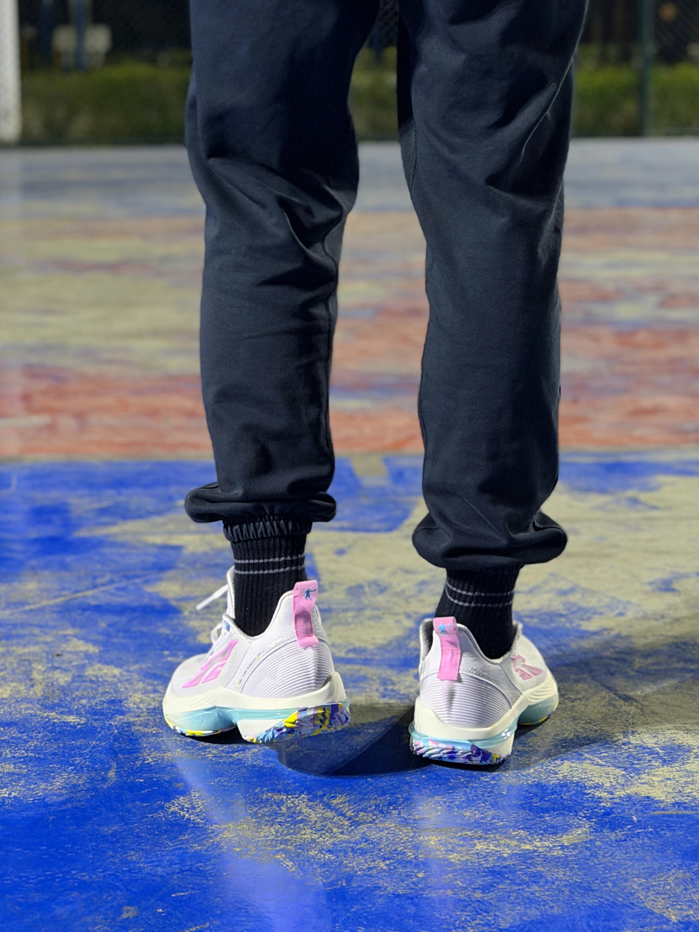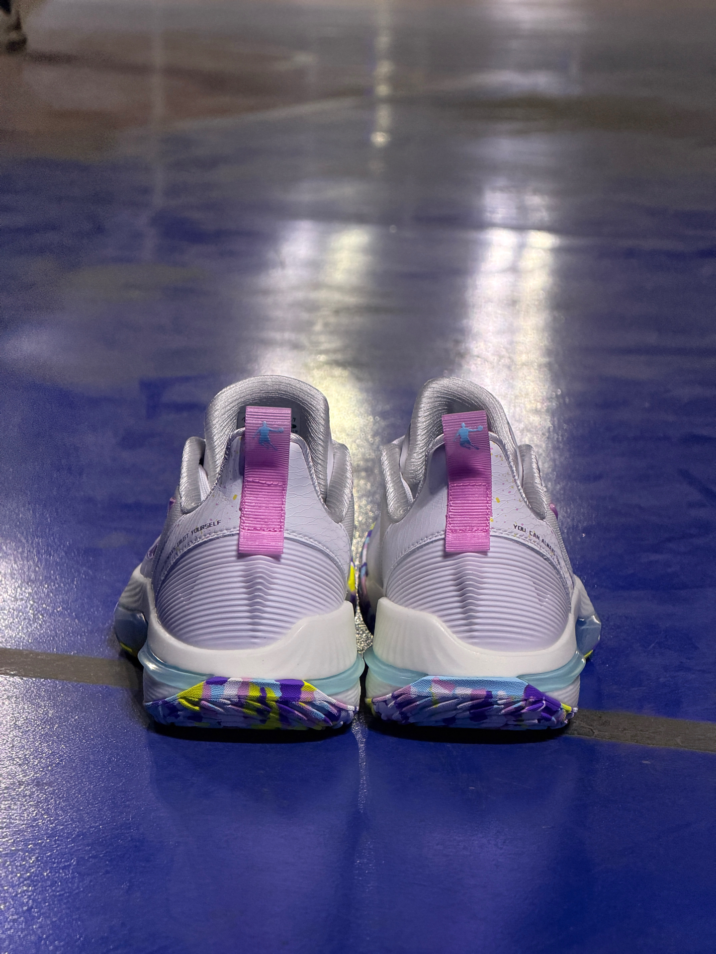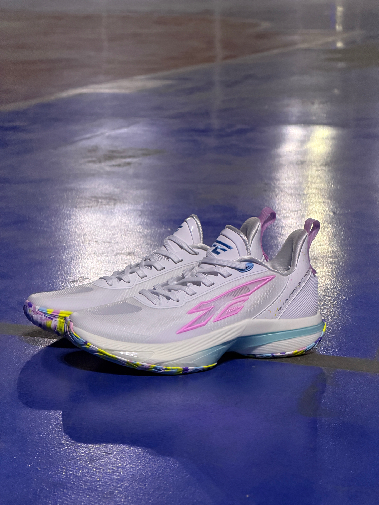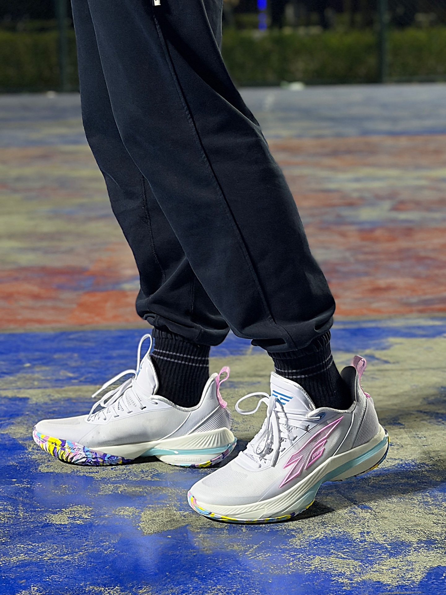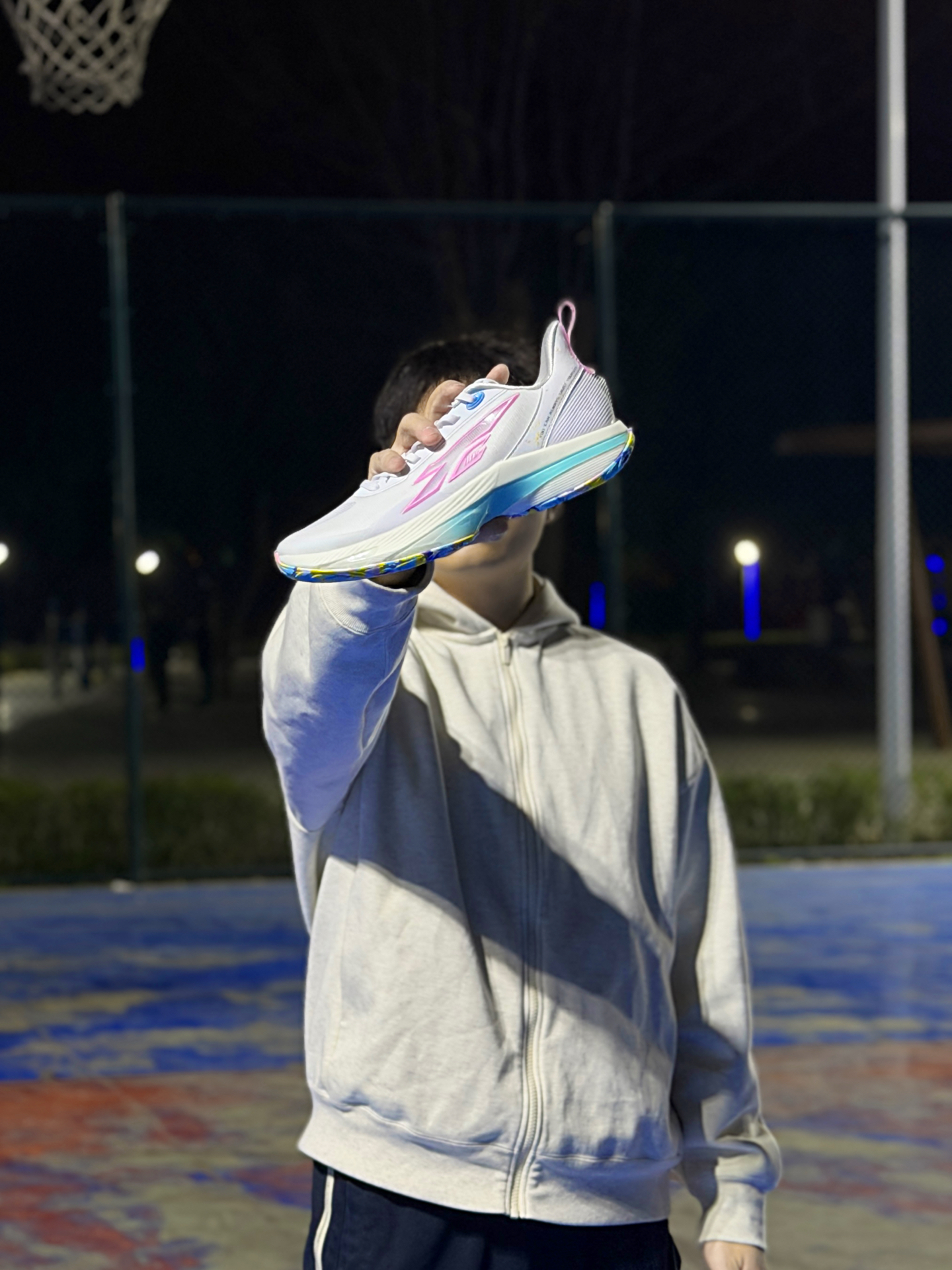 我入手的这双粉白渐变的糖果配色太戳少年心,夜晚球场灯光下直接封神✨ 轻量化网鞋面透气不闷脚,全掌调校的缓震科技回弹迅猛,侧向支撑片给足安全感,外场水泥地也能牢牢抓地。 上脚就是清爽又利落,突破、急停都稳得一批,百元价位的实战黑马