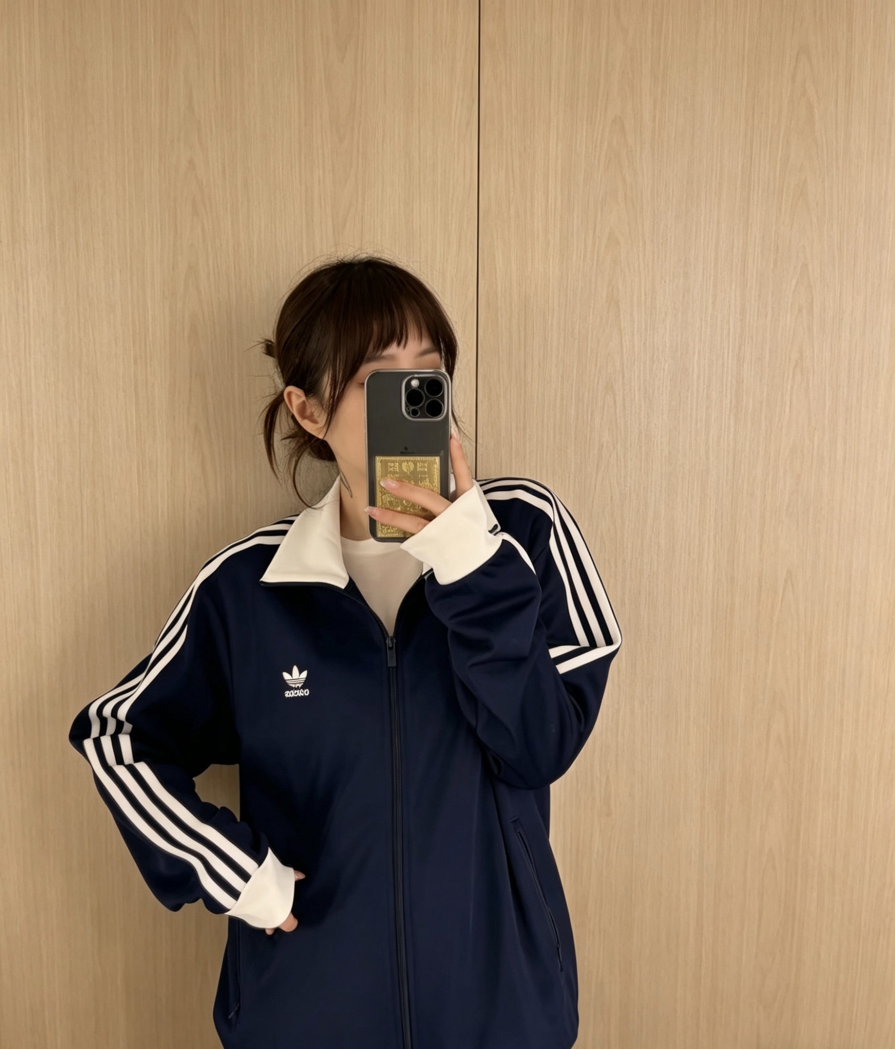 这件藏青三叶草运动外套太戳我了!经典三条杠+撞色白翻领,复古学院风拉满。面料顺滑垂坠,上身宽松不臃肿,显瘦又藏肉。日常搭白T、牛仔裤或运动裤都超有范儿,早秋当外搭、春夏当防晒,百搭又耐看,懒人闭眼入!