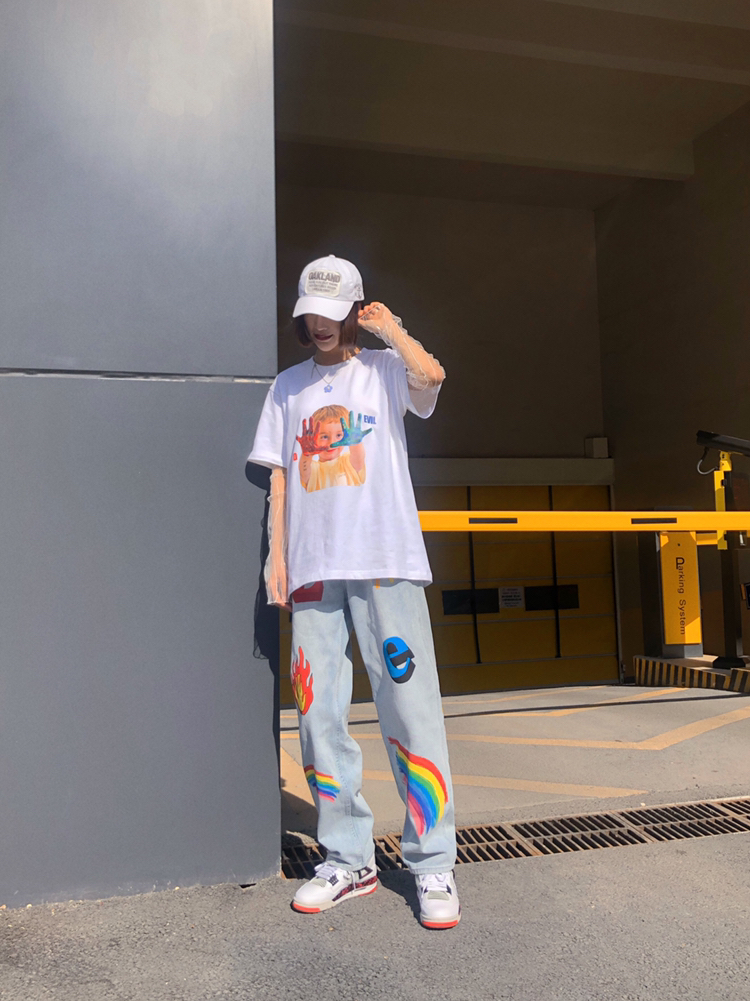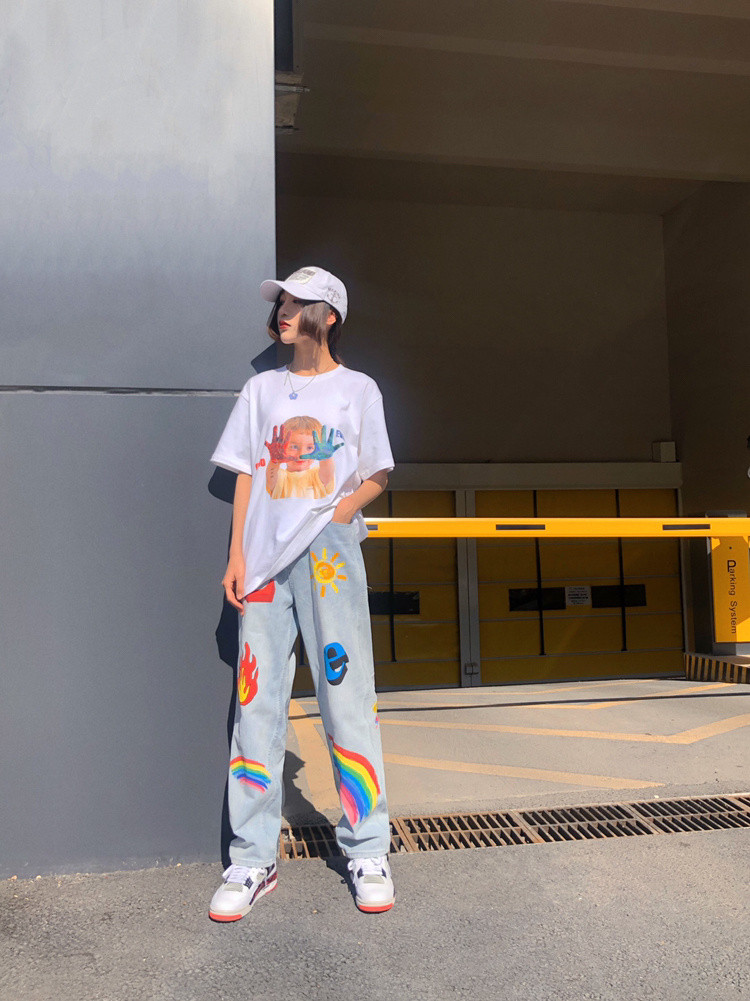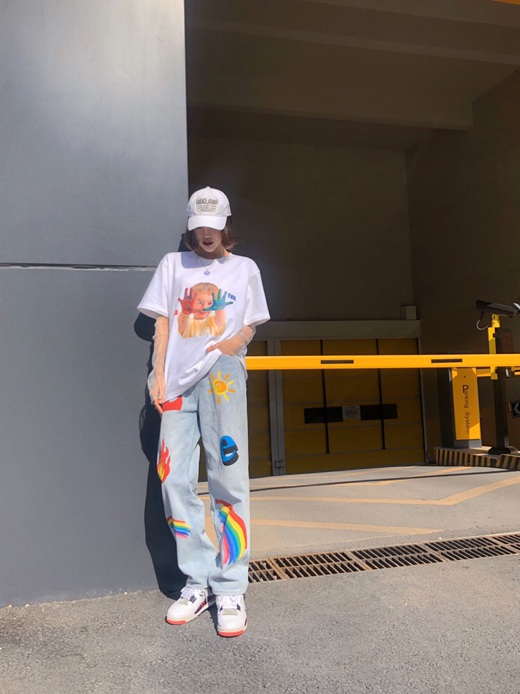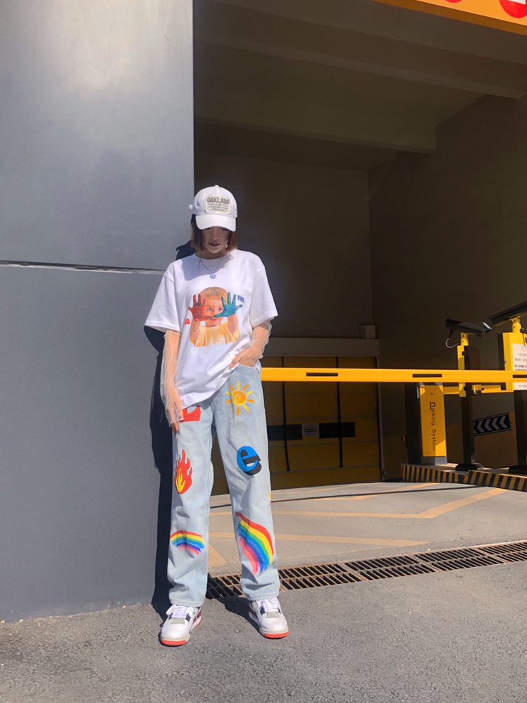 半袖: m5is 基础版型 胸前印花可可爱爱 近期上身频率最高的一件tee 可单穿可打底 男女都可穿的款 白色很好搭配也适合夏季搭配 实用百搭款tee 牛仔裤: 传奇商行 这种水洗蓝的牛仔裤四季穿都很ok 直筒版型不挑身材 男生女生穿都🉑️ 🌈印花是亮点✨ 色彩控福音 搭配t恤简约休闲 小清新风格独特 鞋: AJ4热熔岩 AJ4热熔岩是去年乔四30周年款的一双新鞋 材料上是选用了大面积的硬牛纸...