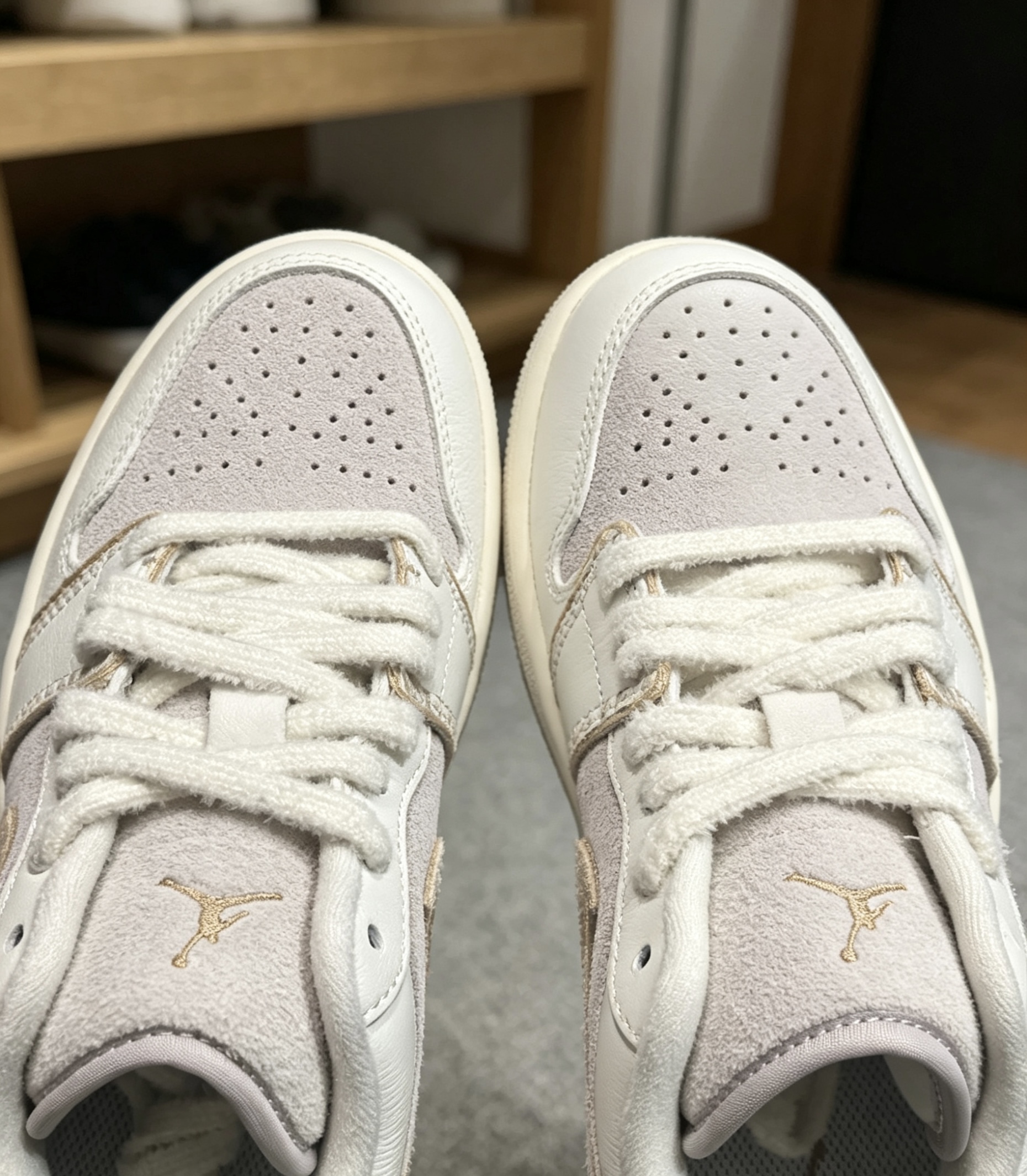 谁懂啊!挖到了今年最戳我的AJ1低帮! 完全长在审美上的奶fufu配色,浅灰拼米白的调调温柔到骨子里,一点都不挑皮,黄皮姐妹也能闭眼冲。 翻毛皮+细腻皮革的拼接质感超绝,毛绒毛巾鞋带直接把温柔感拉满,鞋舌的浅金飞人标细节感拉满,低调又藏着小心机。 上脚巨显脚小,鞋型超秀气,完全不会笨重!日常搭牛仔裤、小裙子、运动裤全都能hold住,通勤上学穿都超合适,软乎乎的脚感暴走一天都不累。 百搭又不烂大街,...