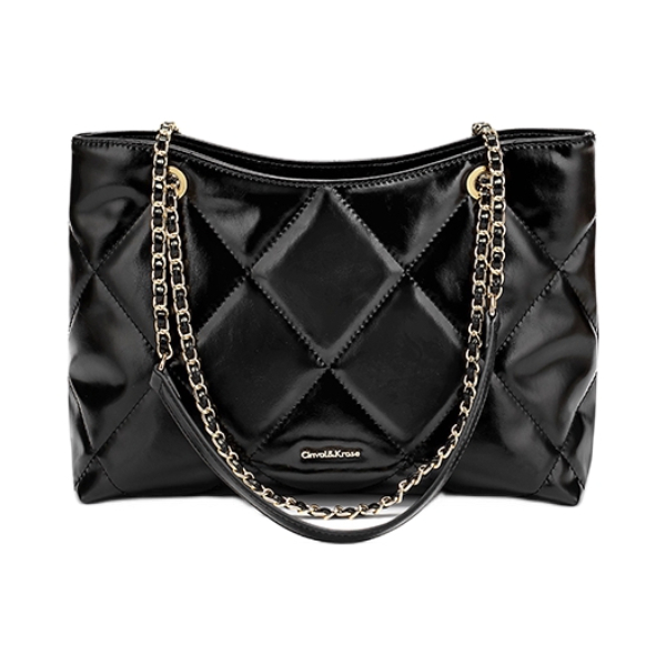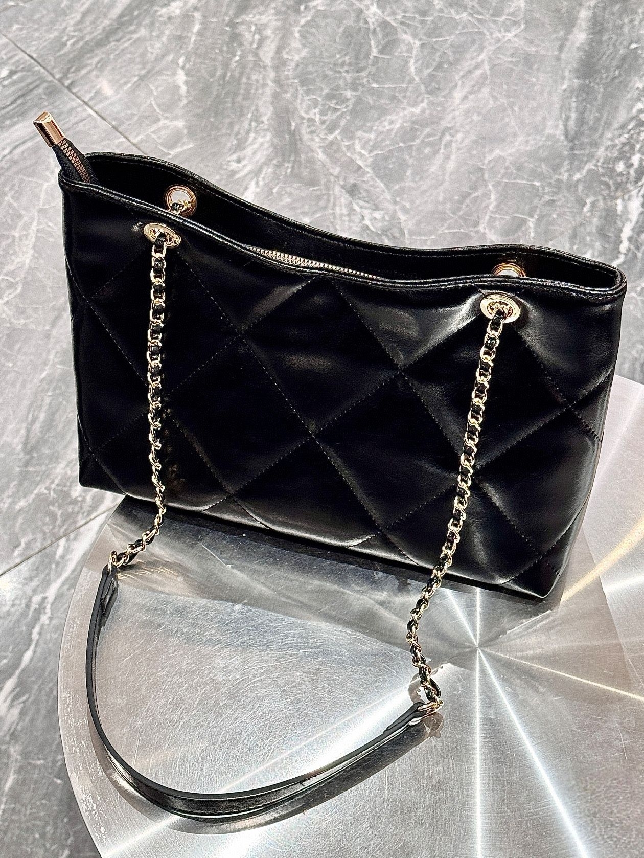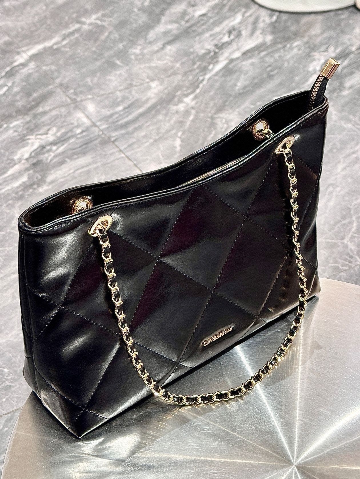 又让我挖到了百搭又漂酿的托特包啦 尊嘟正中我这种每天着急但又想美美出门的小女孩啦 包身是皮质的,摸着软软的手感也不戳 经典的黑色菱格纹时髦又有质感 搭配黑金链条我觉得背上显得贵里贵气的 容量也敲大的,我的平板和书本什么的都放得下 平时出门可以斜挎也可以单肩 穿各种风格的衣服我背它感觉都挺搭的耶