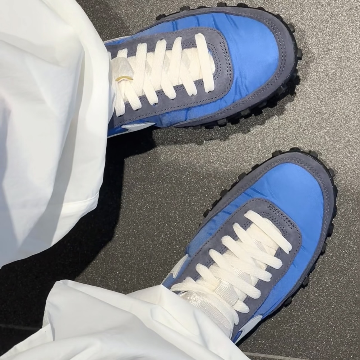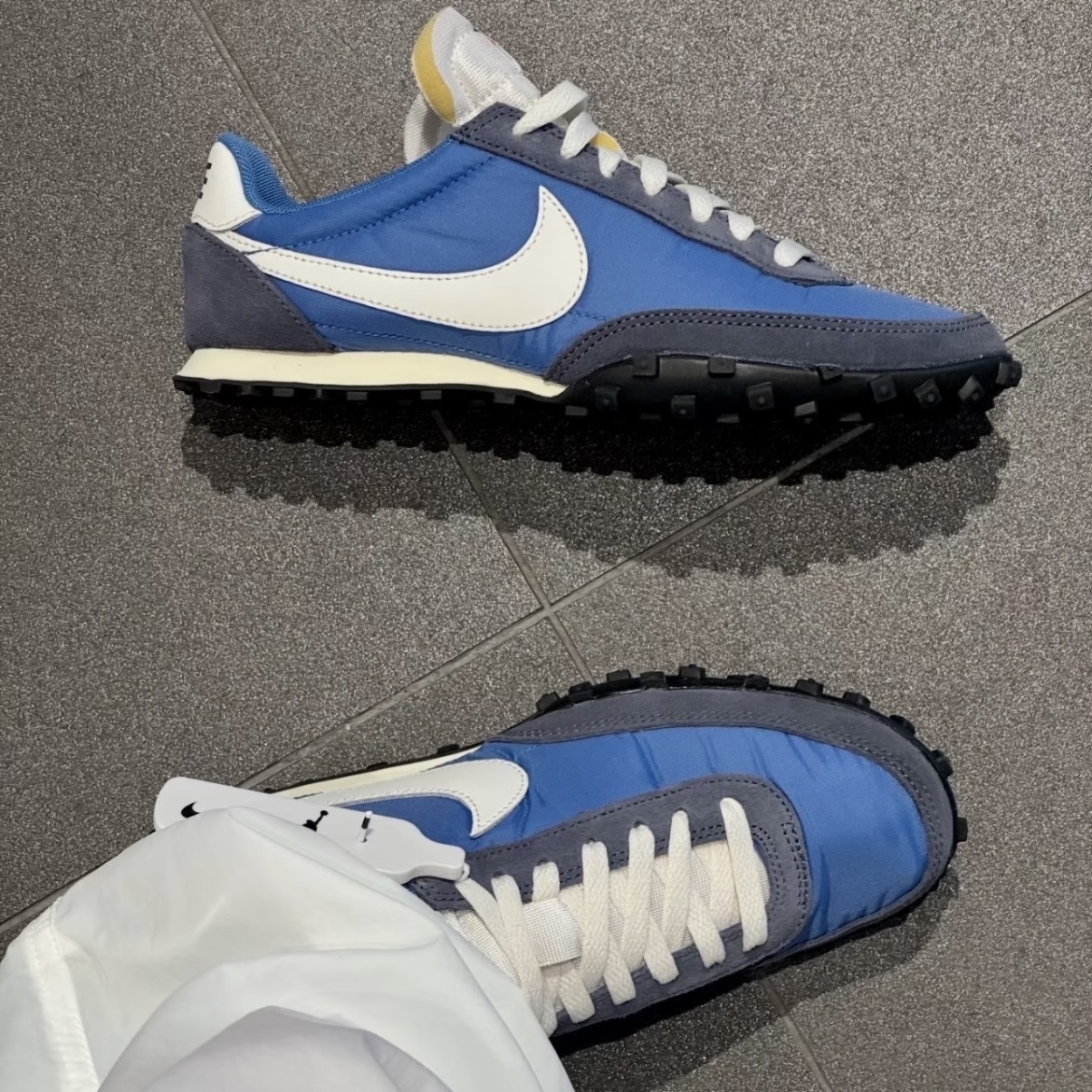 谁能拒绝许光汉同款的复古蓝白小白鞋啊💙 Nike Waffle Racer真的长在审美上,经典复古风拉满! 低帮版型超利落,上脚显脚瘦,蓝白撞色干净又高级 织物+翻毛皮拼接,质感在线,透气不闷脚 华夫底经典纹路,抓地力强,走路稳又舒服 泡棉中底软弹缓震,暴走一天都不累 日常搭牛仔裤、运动裤、休闲裤都绝配 男生女生穿都好看,明星同款闭眼冲不亏✨