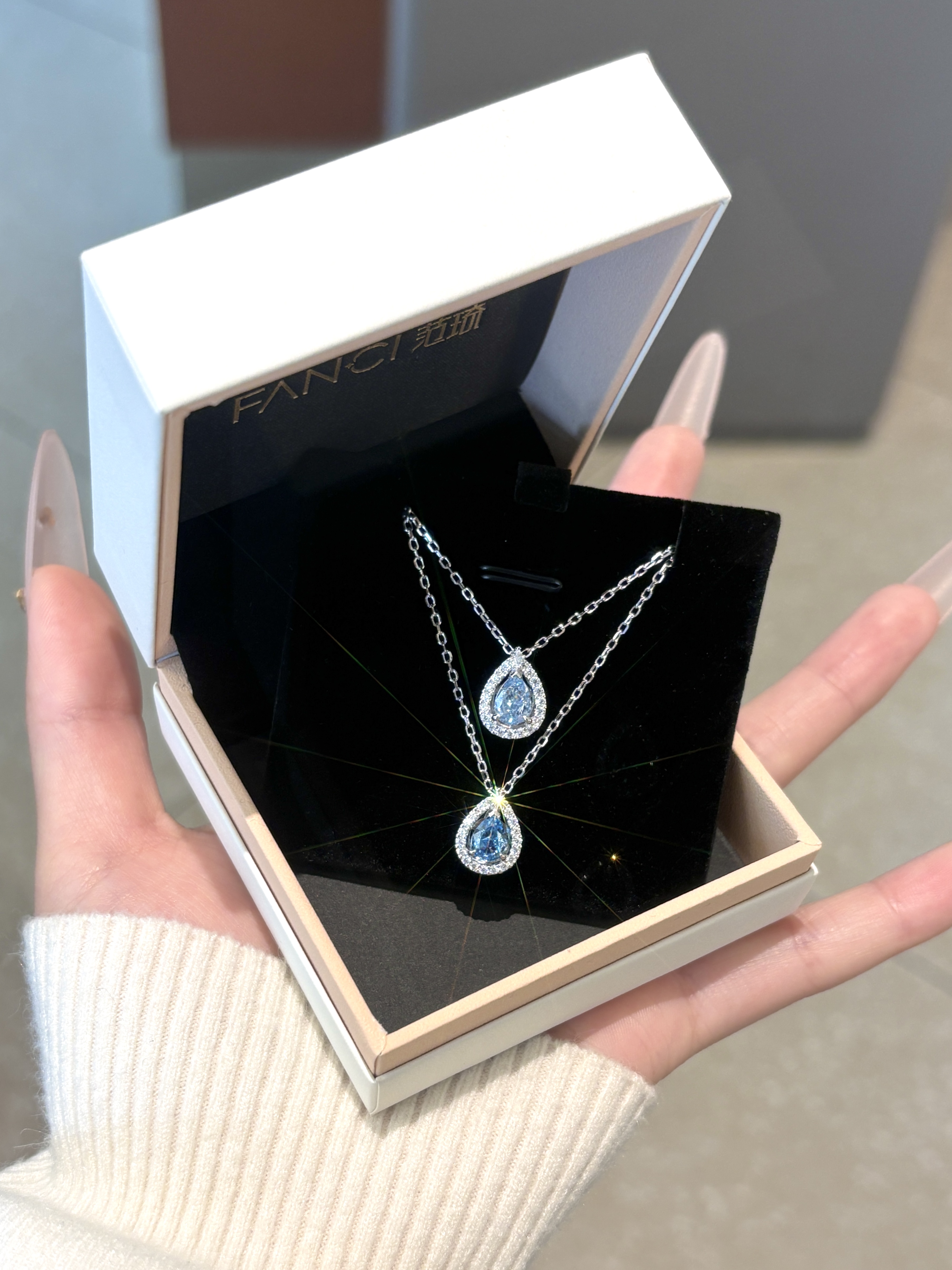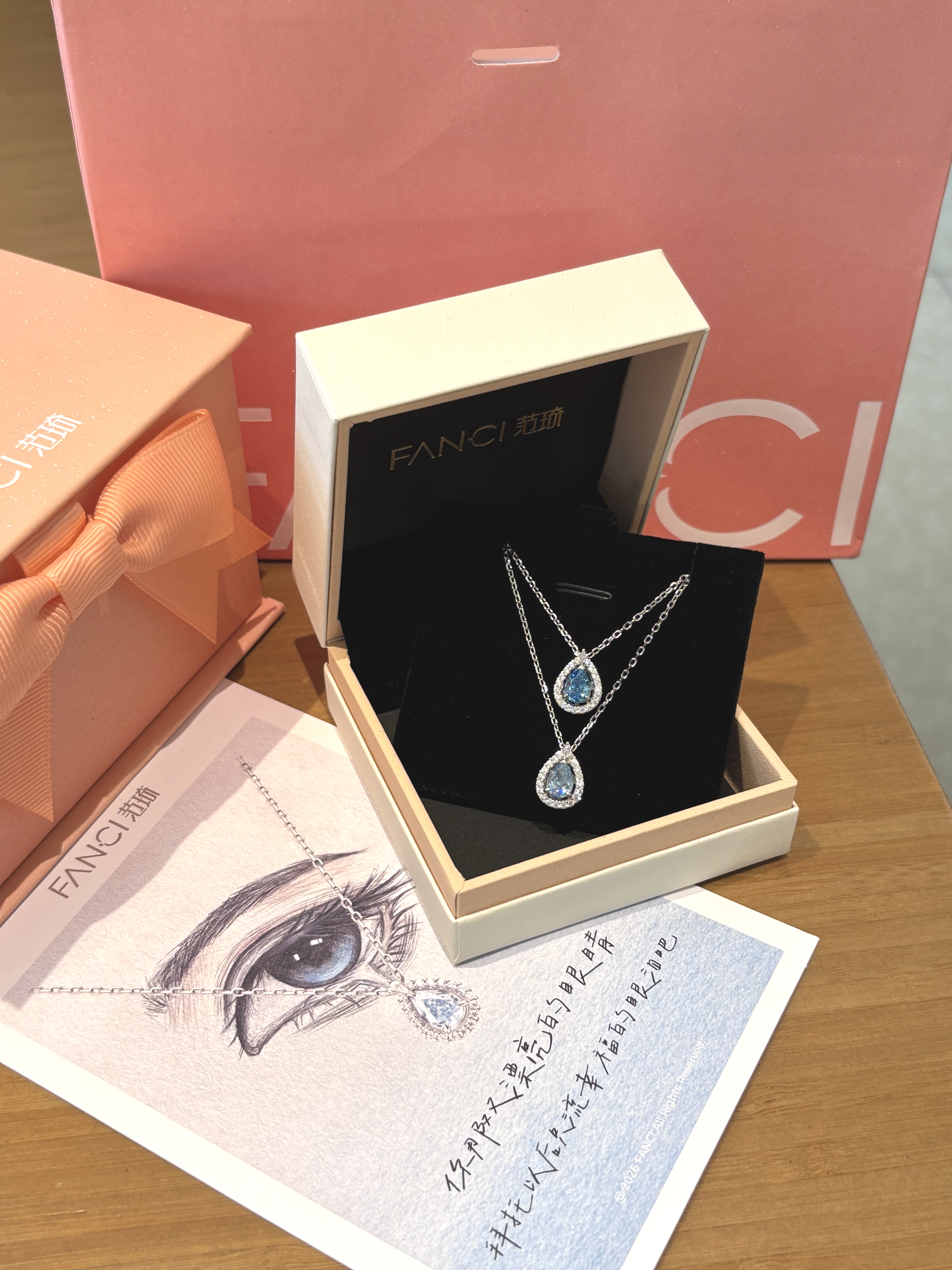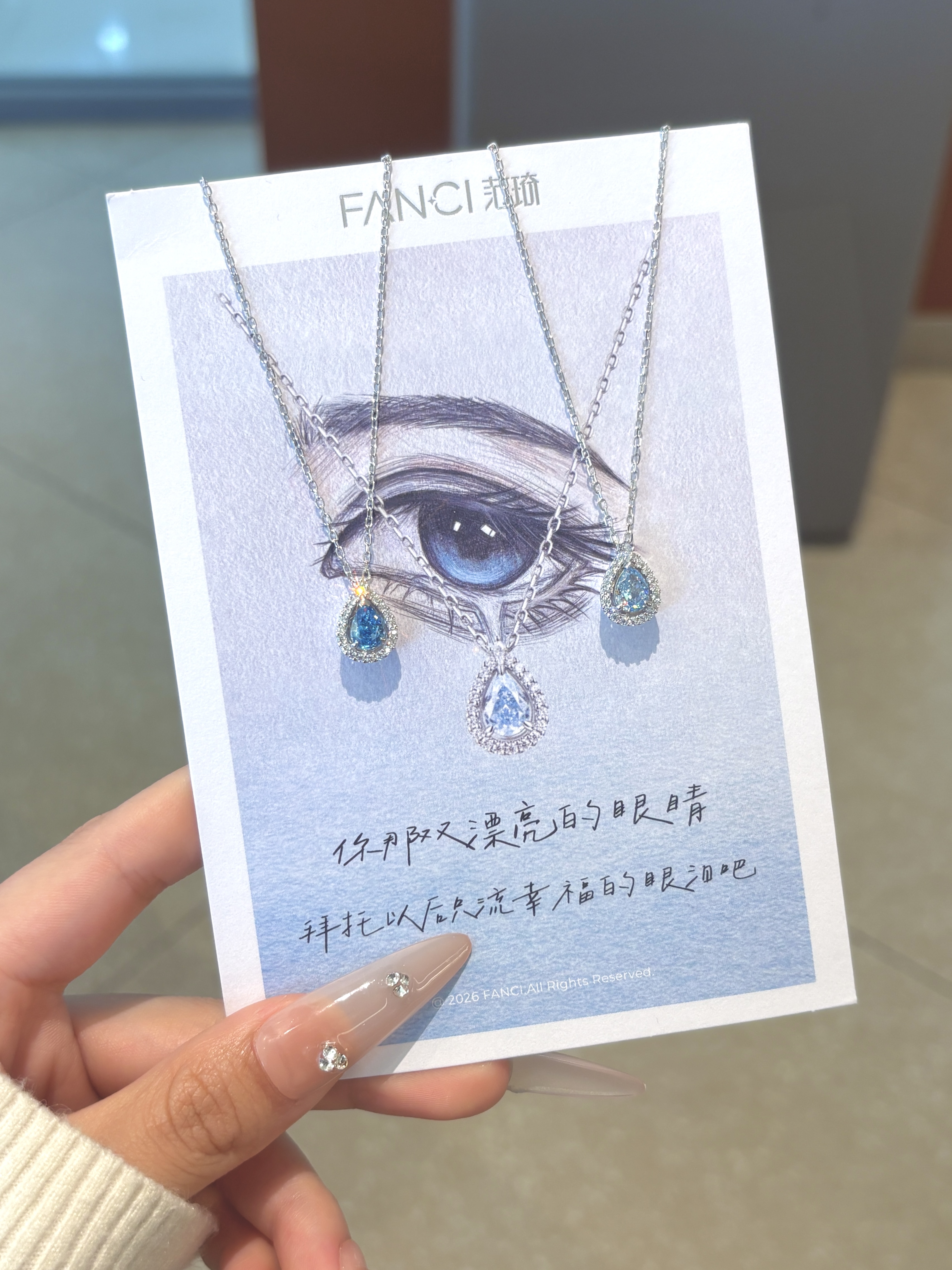 是这个范琦家的两条蓝色项链! 水滴型的蓝皓石晶莹剔透的周围一圈小钻blingbling的 但又不会太夸张✨ 戴在脖子上那种清冷感拿捏得刚好 赠送的这个卡纸寓意也很好啊 让女孩子更加爱自己 愿我们漂亮的眼睛都只流幸福的泪水☺️
