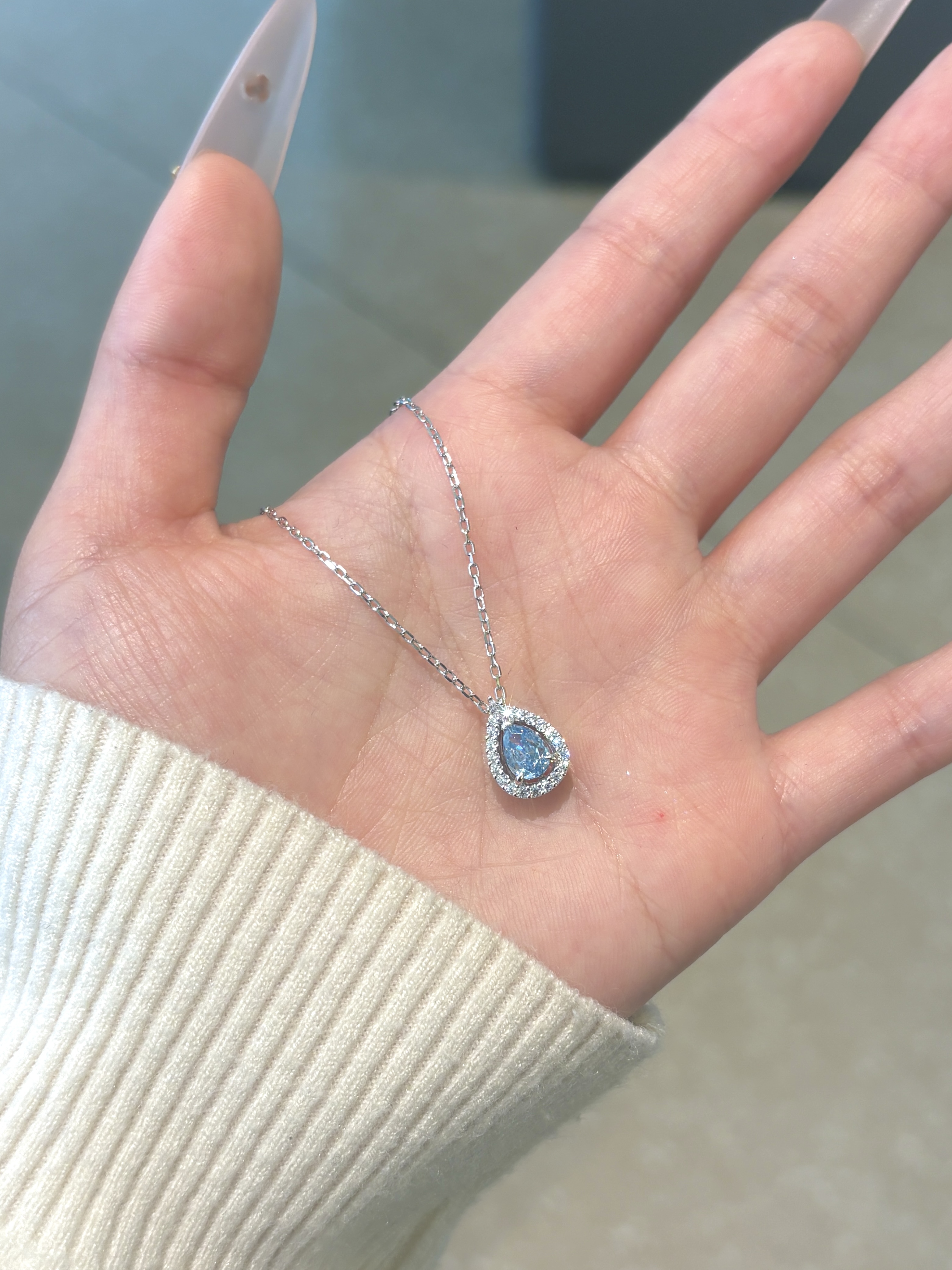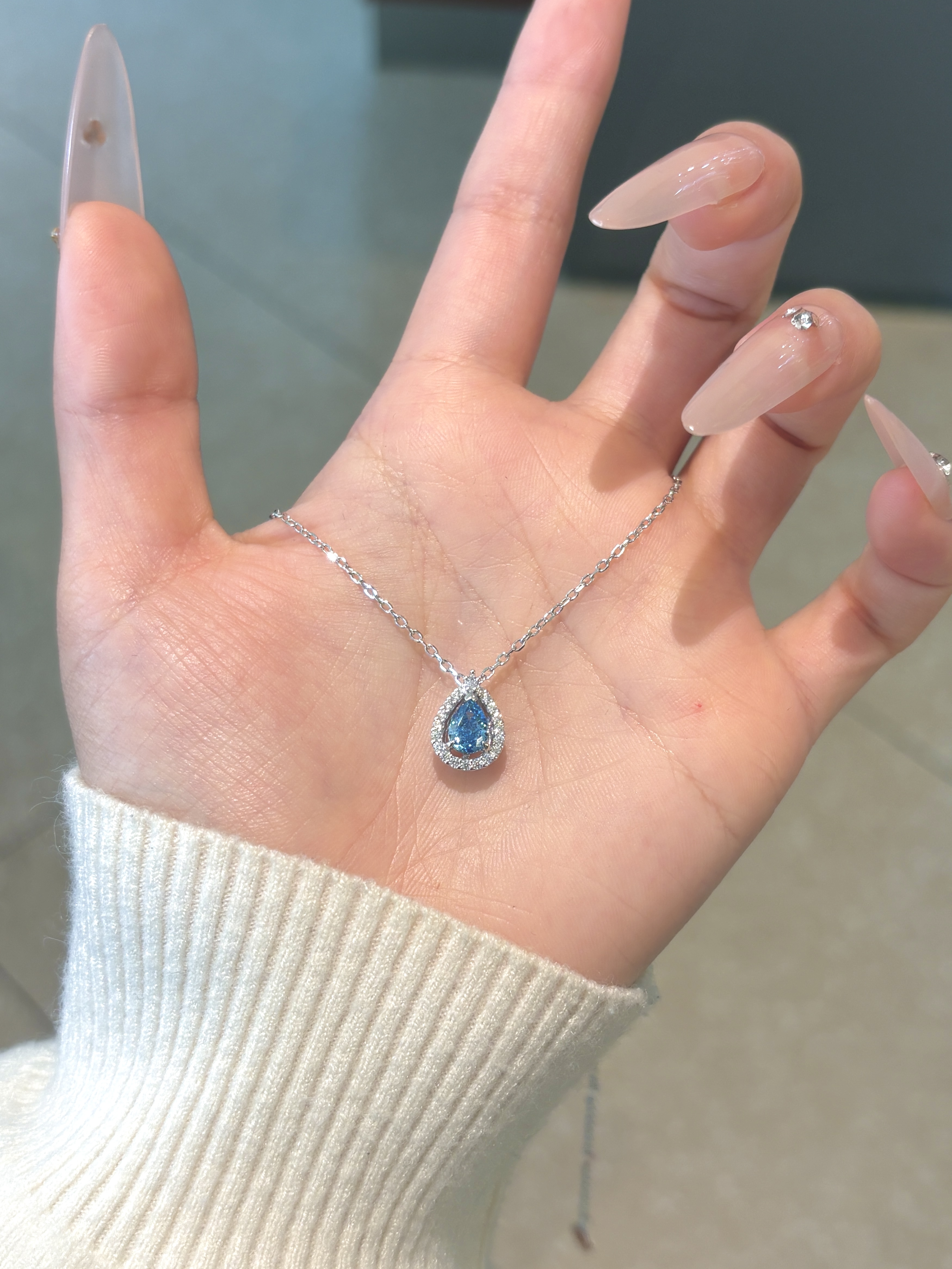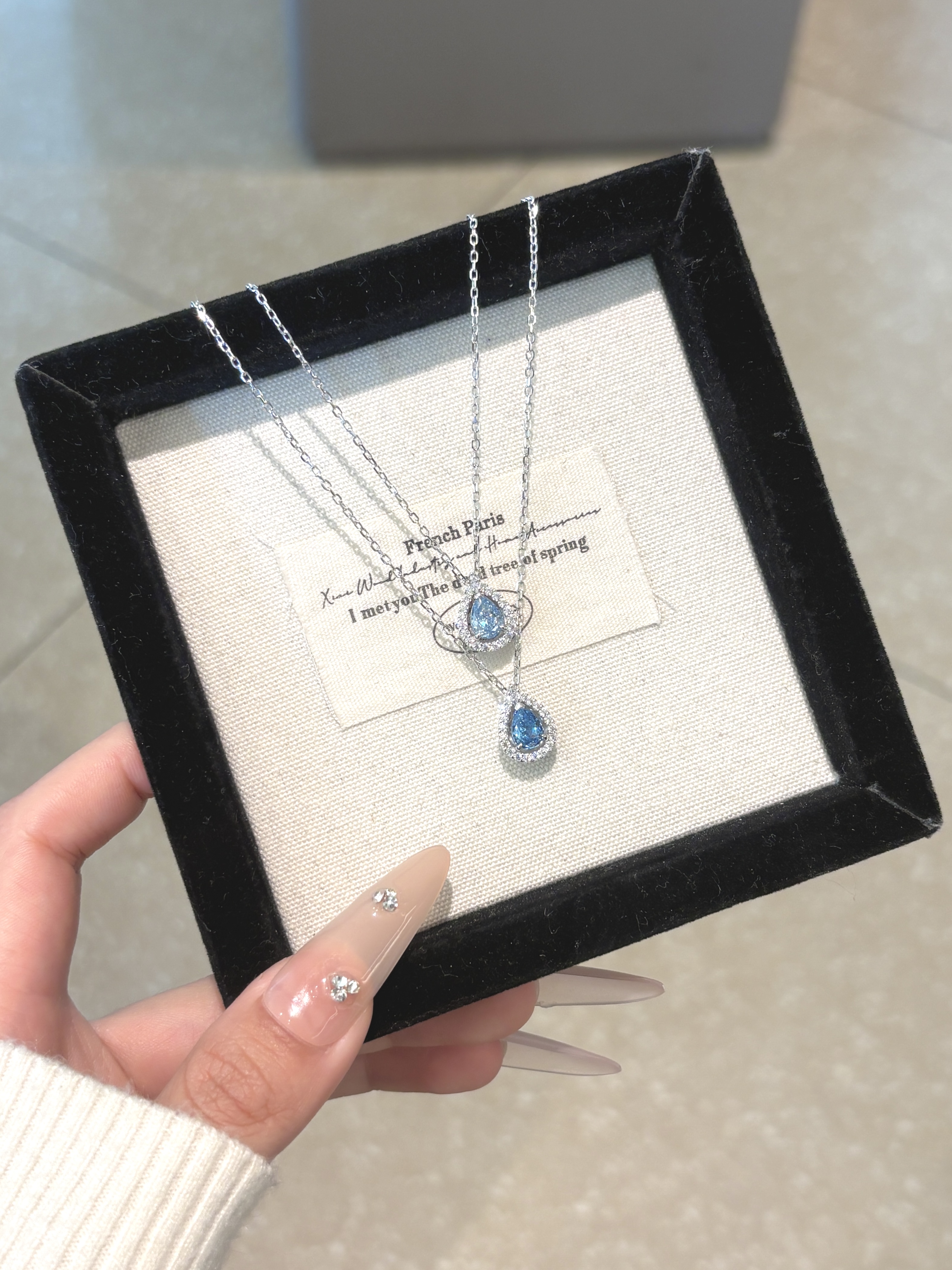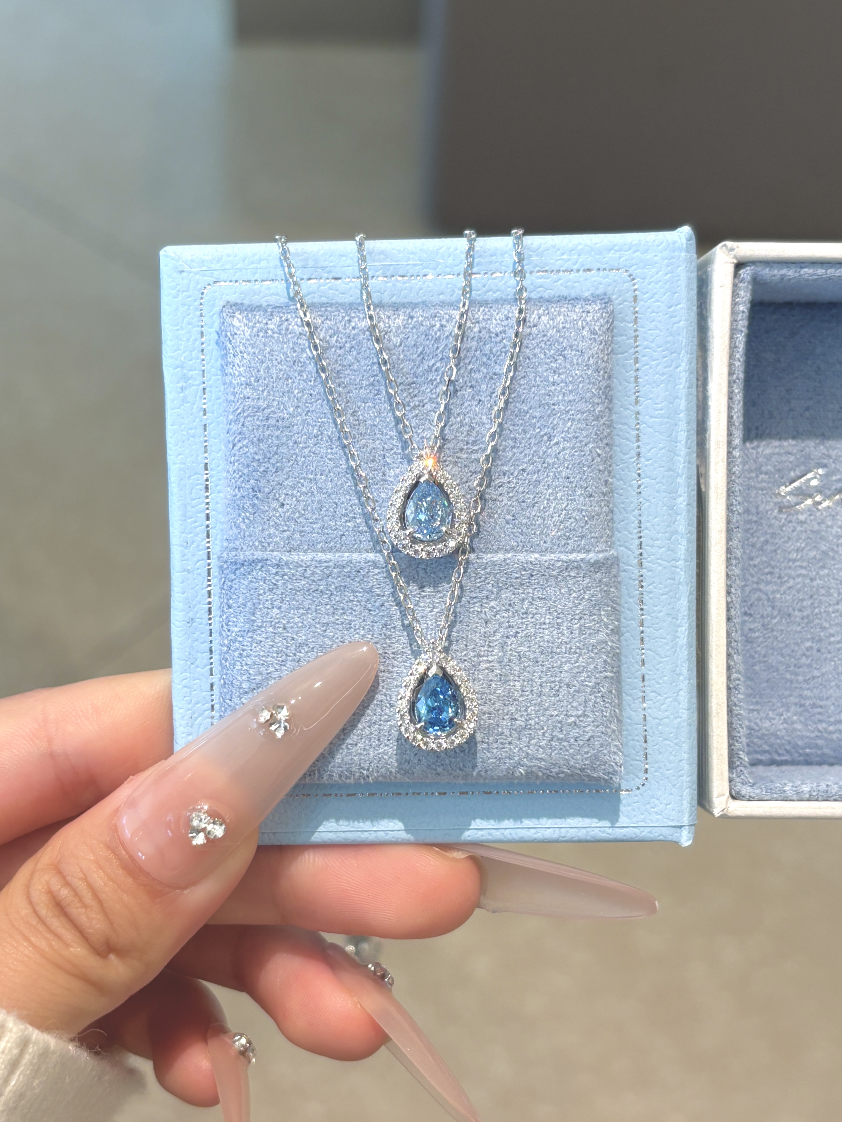 是这个范琦家的两条蓝色项链! 水滴型的蓝皓石晶莹剔透的周围一圈小钻blingbling的 但又不会太夸张✨ 戴在脖子上那种清冷感拿捏得刚好 赠送的这个卡纸寓意也很好啊 让女孩子更加爱自己 愿我们漂亮的眼睛都只流幸福的泪水☺️