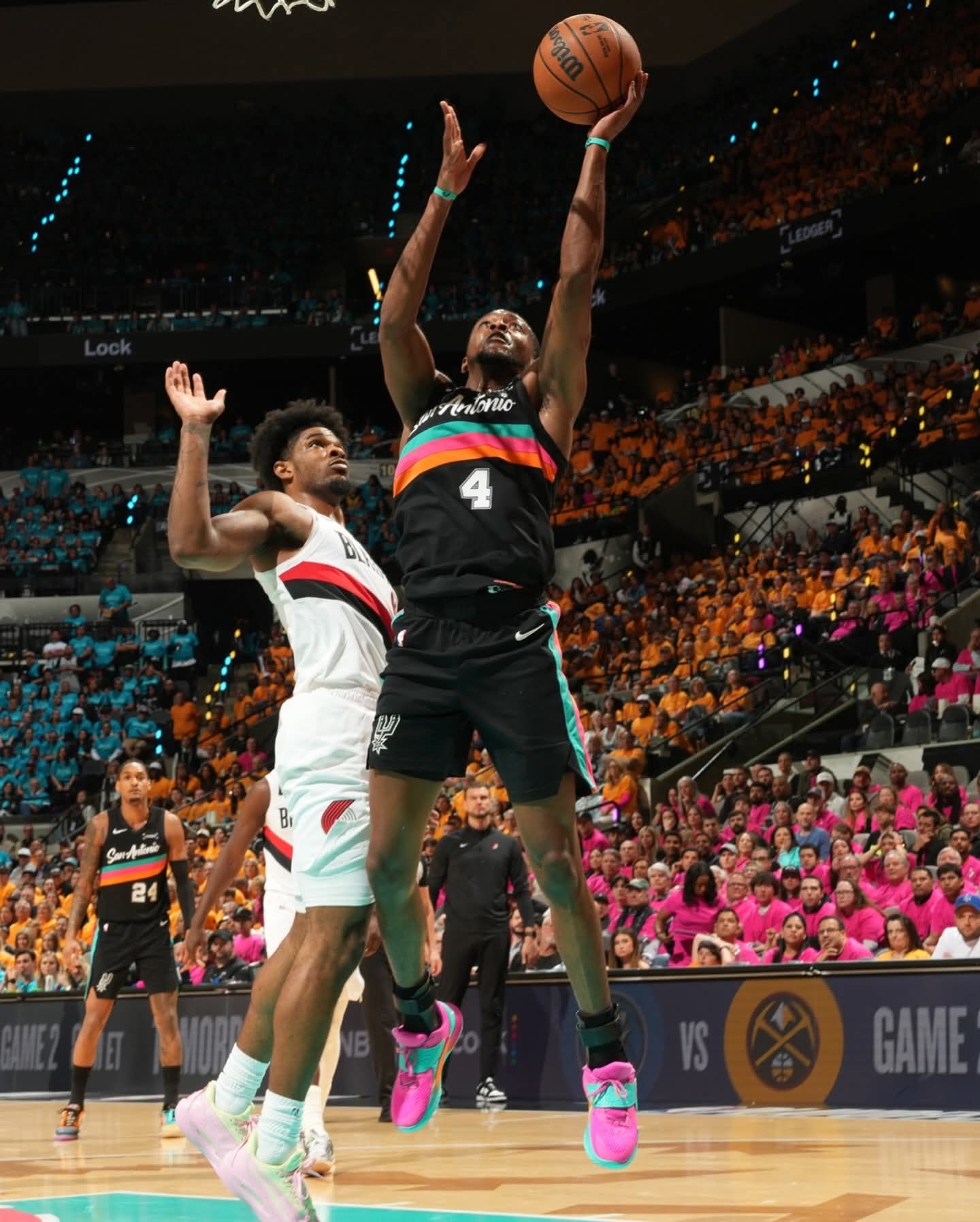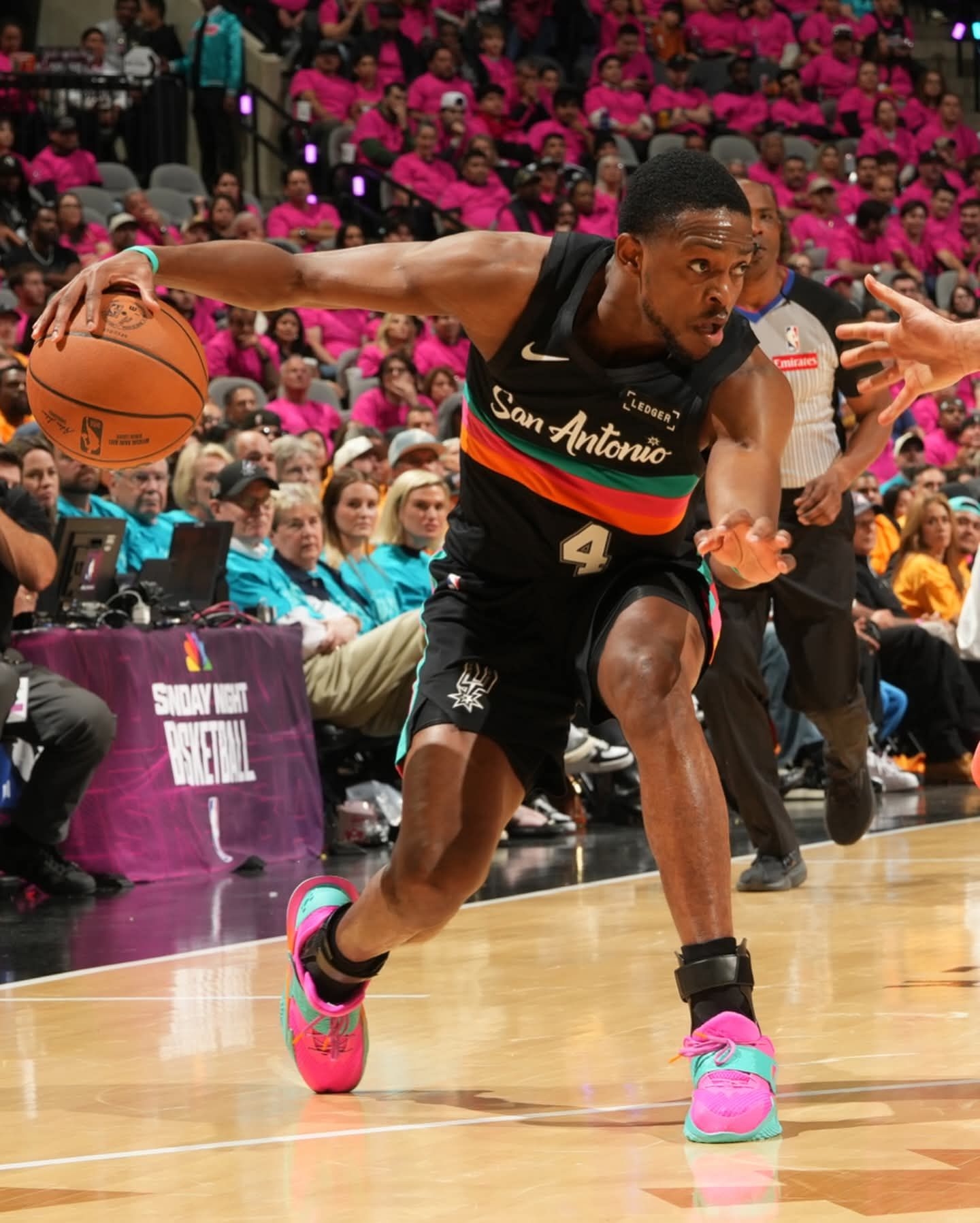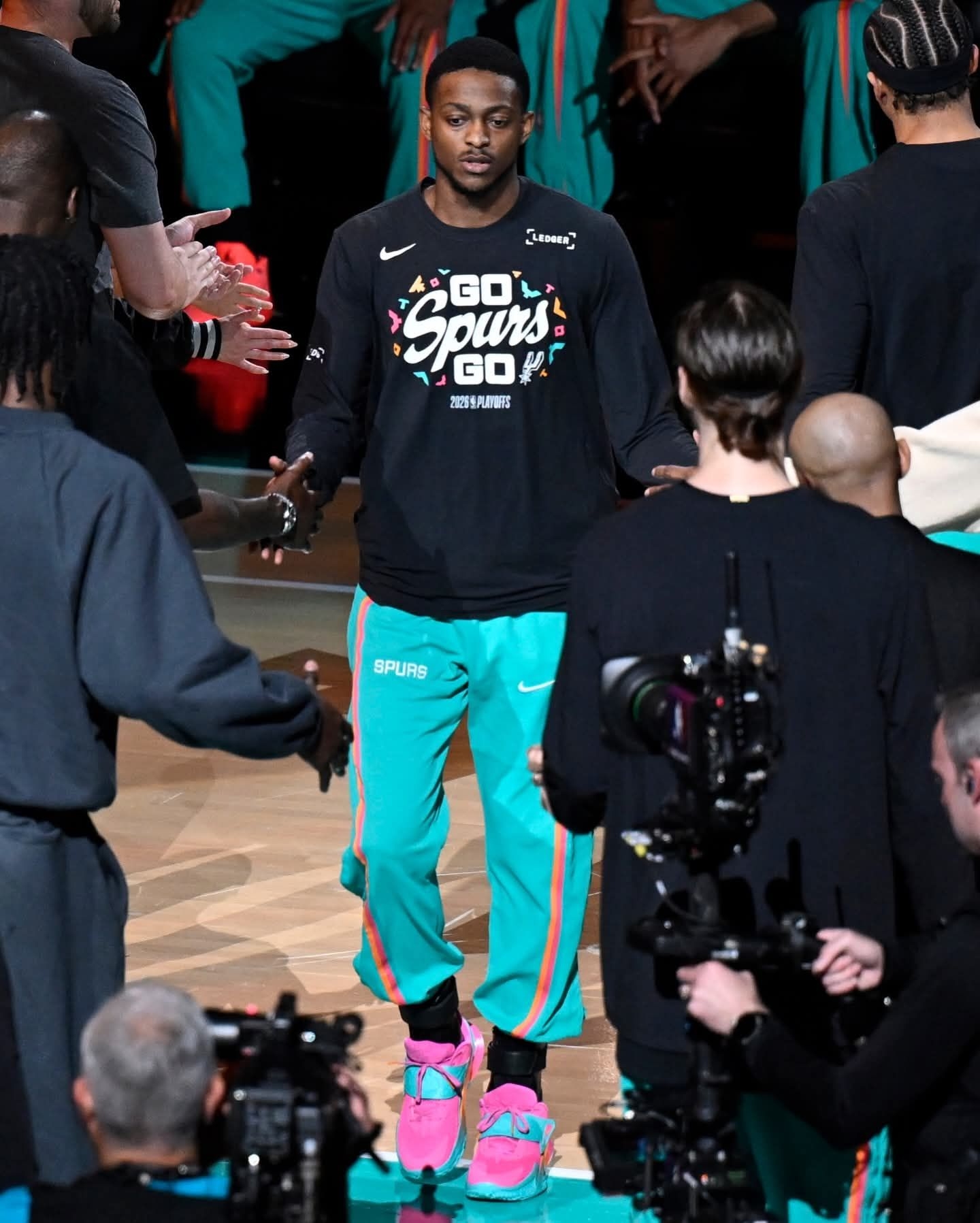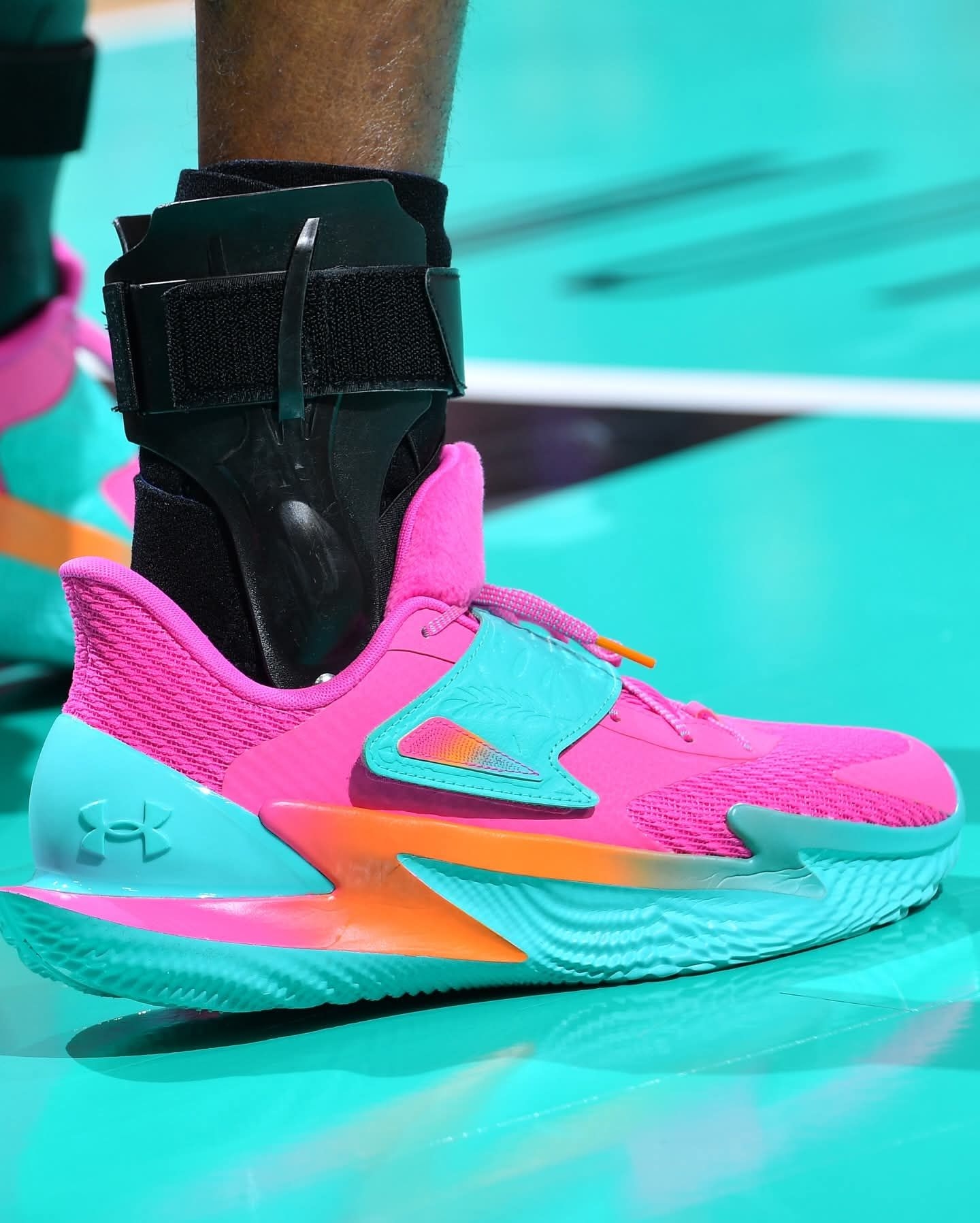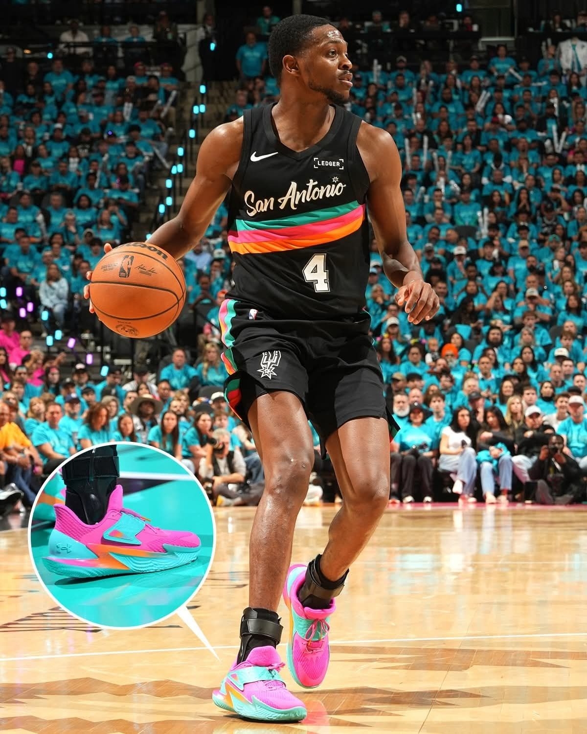 圣安东尼奥的狂欢,被福克斯踩进了球鞋里! 对阵开拓者的首秀,他上脚的UA Fox 2「马刺嘉年华」直接把主场氛围点燃🔥 粉、青、橙的撞色完美复刻了马刺球衣的霓虹色彩,鞋身的细节更是藏满了圣城的专属浪漫。 搭载UA FLOW科技的鞋款,和福克斯闪电般的突破相得益彰,17分8助攻的表现,也让这双限定PE成了赛场最亮眼的存在。 当球鞋和主场的灯光同频,这才是属于马刺的速度美学!