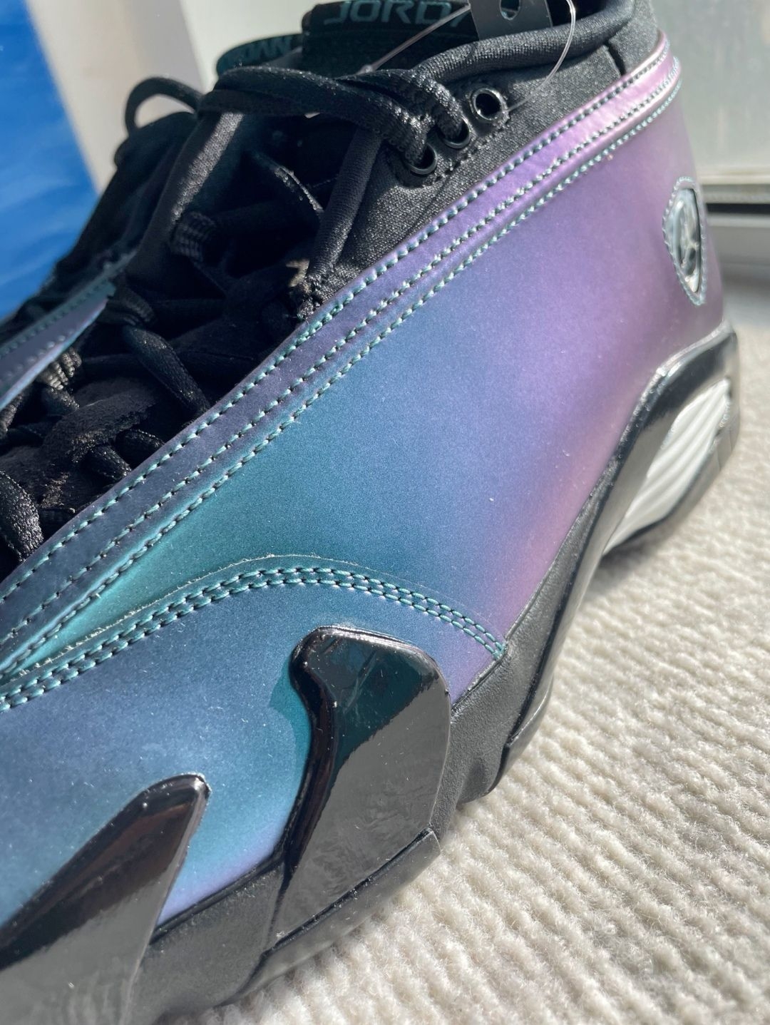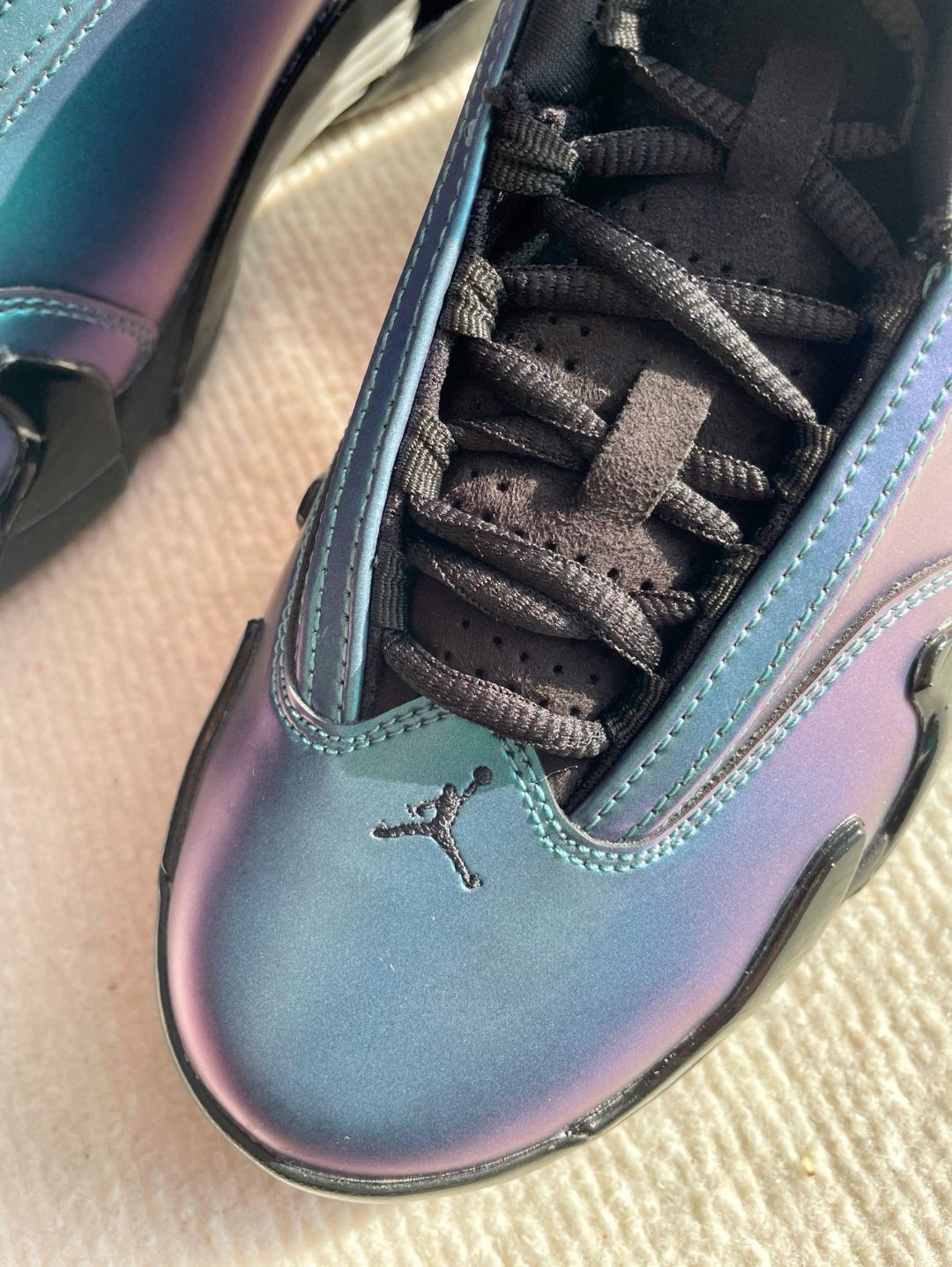 这一双air jordan 14low的情人节💌。 虽然叫情人节,感觉在配色上却没有情人节那种粉粉嫩嫩的感觉。整双鞋采用了黑色加镭射配色的搭配,与之前发售的变色龙系列有异曲同工之处。皮质的鞋面,加上这个配色,在阳光底下是真的帅气。 后跟的盾牌jumpmqn图案是也很经典。这也是我第一次入手aj14这双鞋,这双鞋感觉是真的轻,相比于13和12这双鞋重量很轻,上脚也很轻快,全是一个不错的鞋子,压马路...