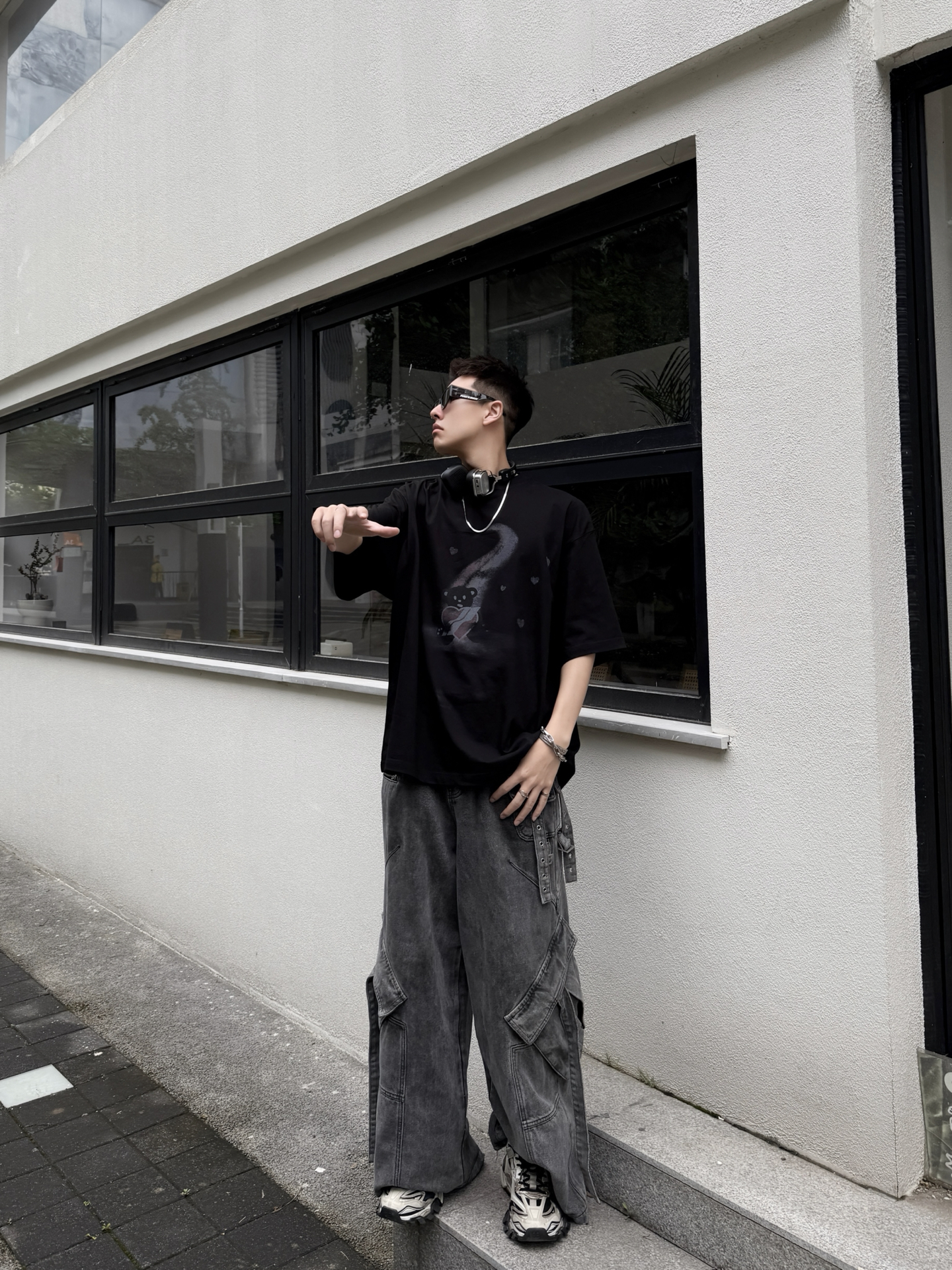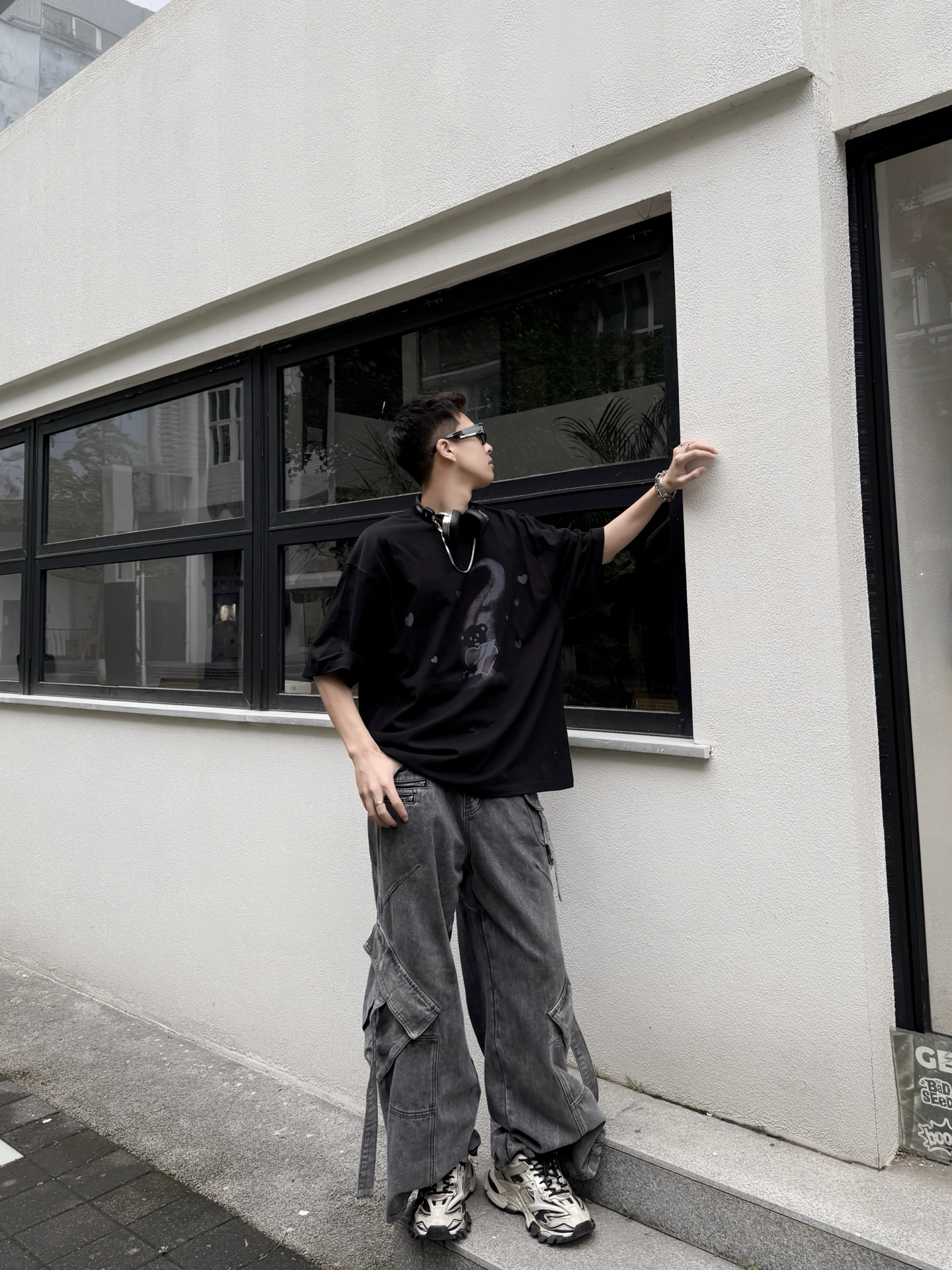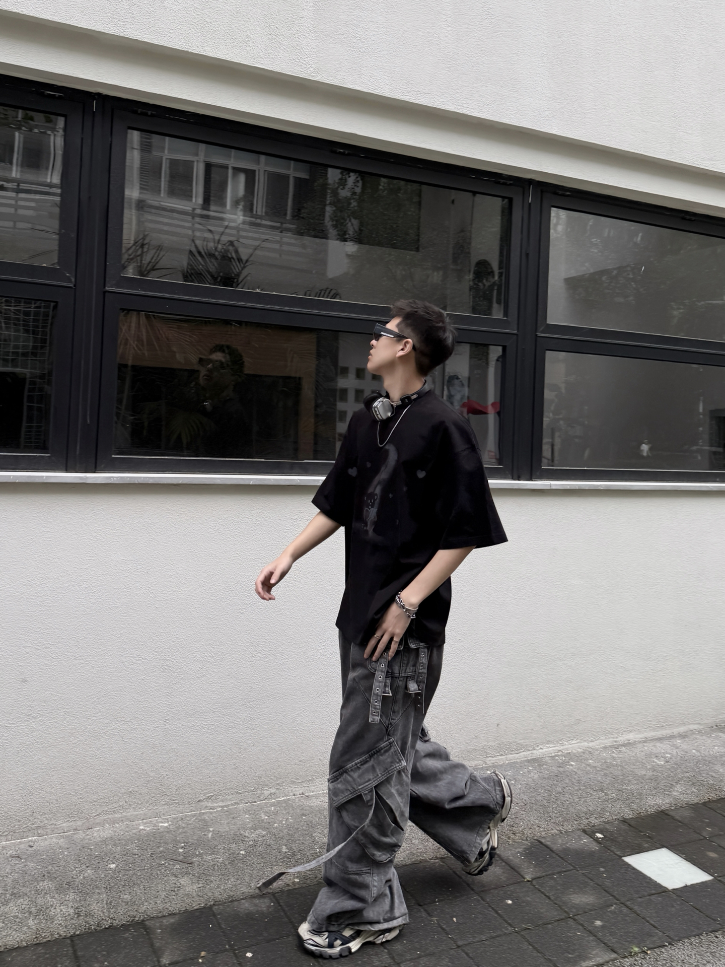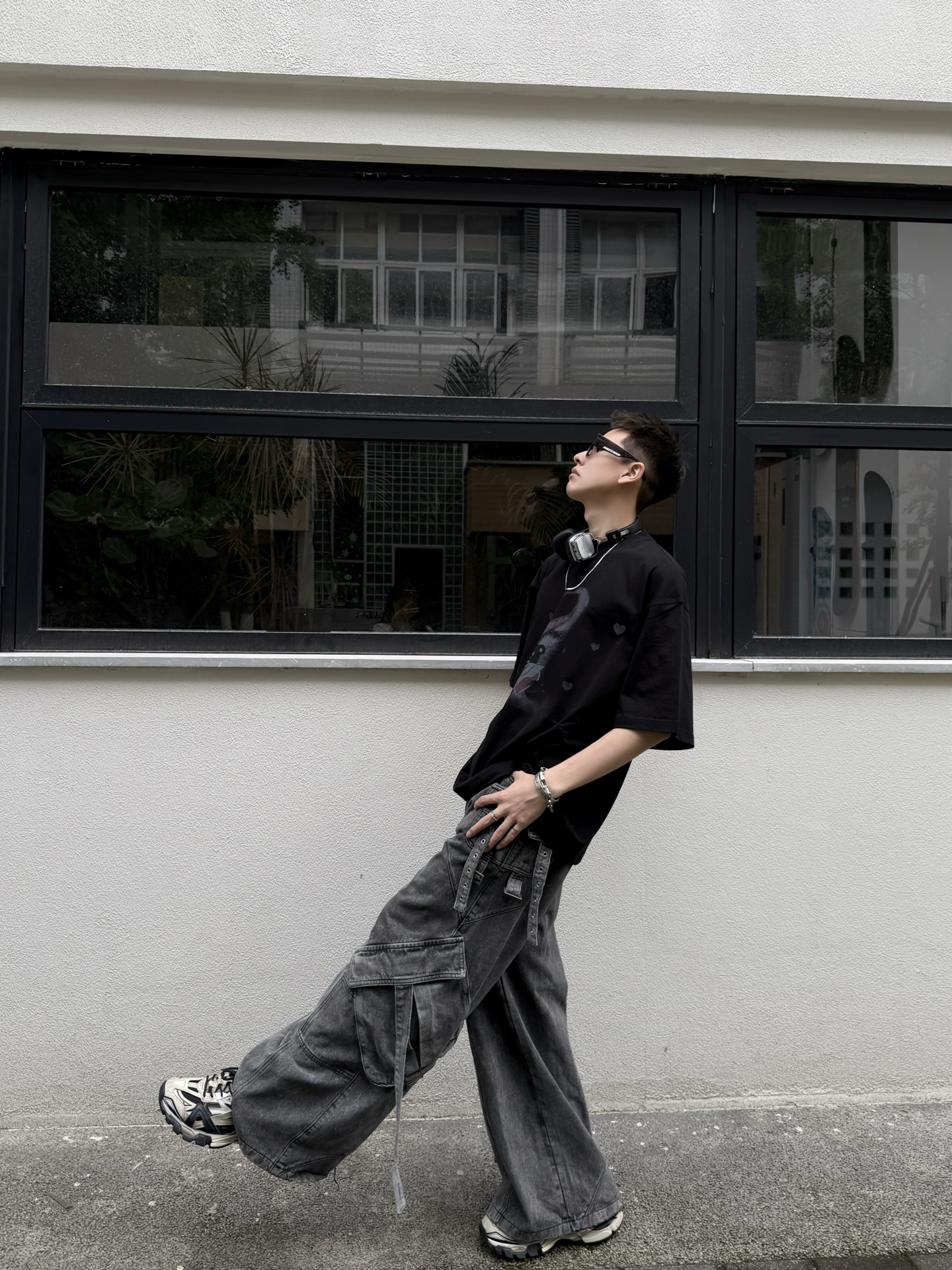 美式高街穿搭的松弛密码,被这套黑灰组合拿捏了。 宽松黑T搭配做旧灰工装裤,oversize版型自带慵懒感,裤身多口袋+飘带设计细节拉满,街头vibe风直接拉满。搭配做旧老爹鞋,复古感和酷感一键get,不管是citywalk还是街头探店,都能拍出随性大片,轻松拿捏暗黑少年感。
