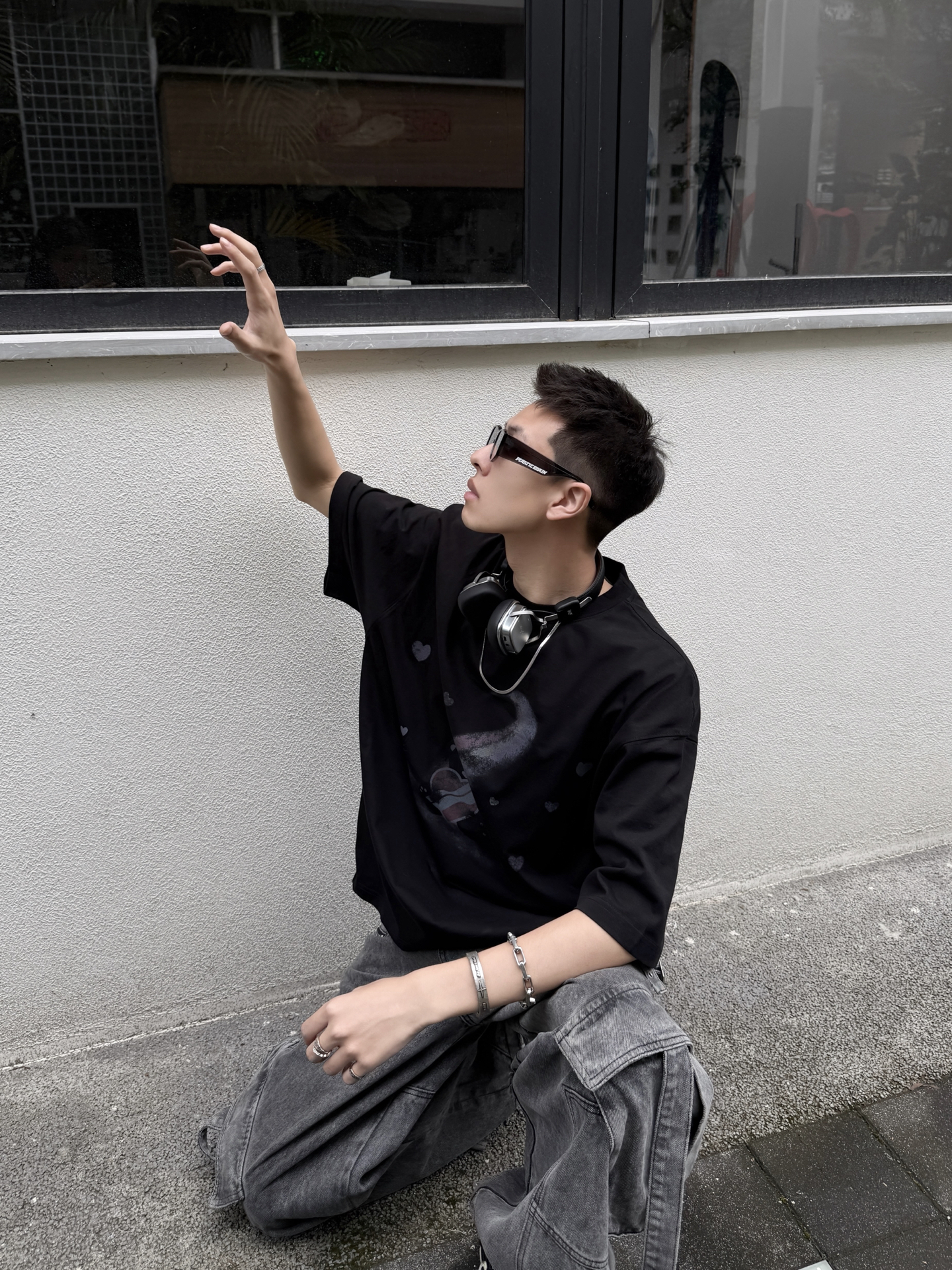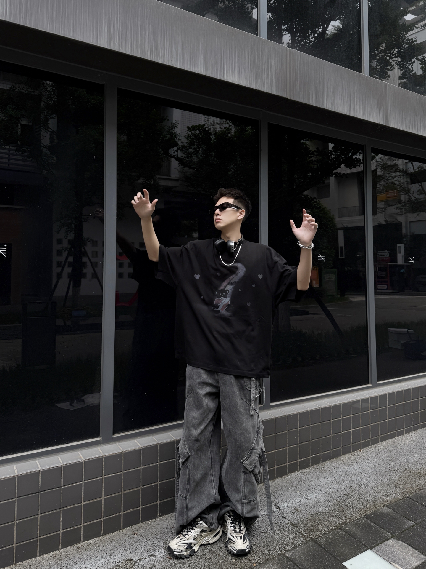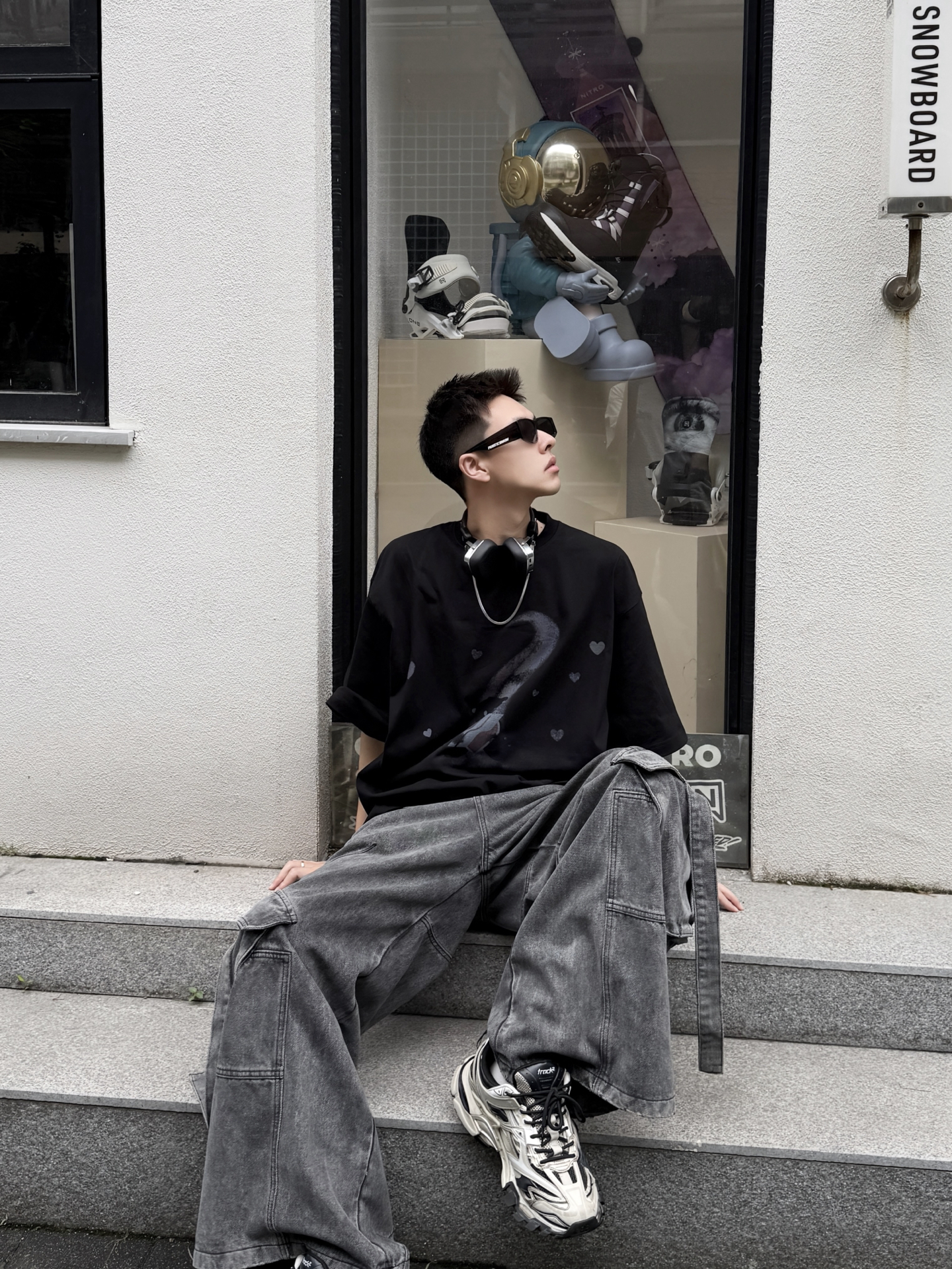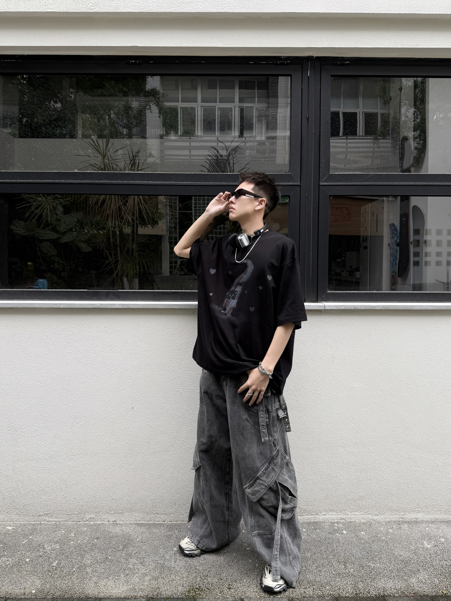 美式高街穿搭的松弛密码,被这套黑灰组合拿捏了。 宽松黑T搭配做旧灰工装裤,oversize版型自带慵懒感,裤身多口袋+飘带设计细节拉满,街头vibe风直接拉满。搭配做旧老爹鞋,复古感和酷感一键get,不管是citywalk还是街头探店,都能拍出随性大片,轻松拿捏暗黑少年感。