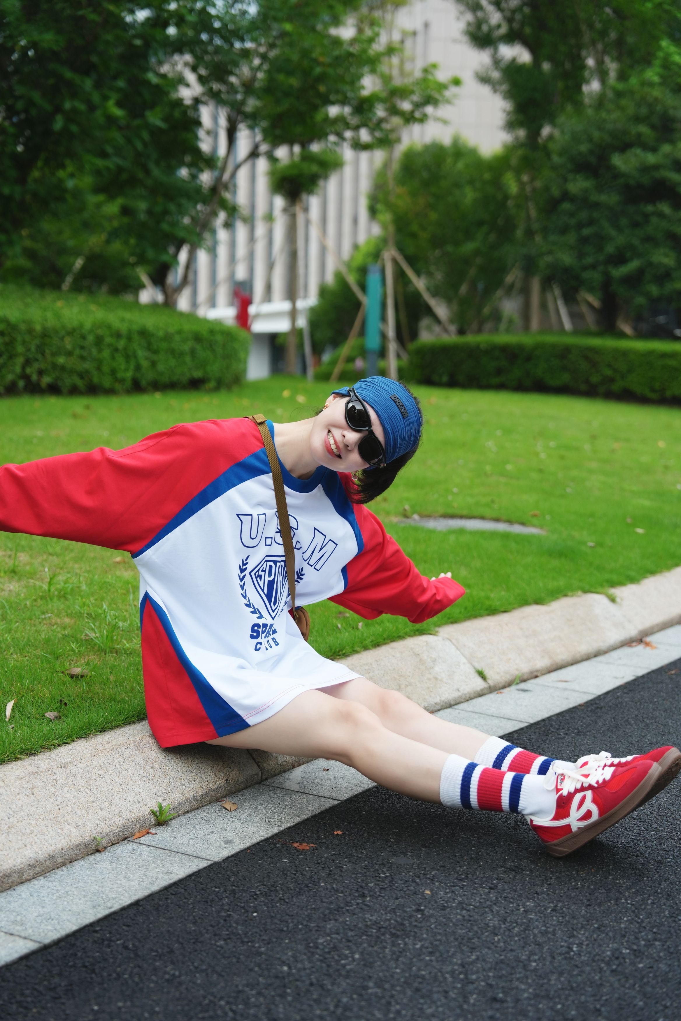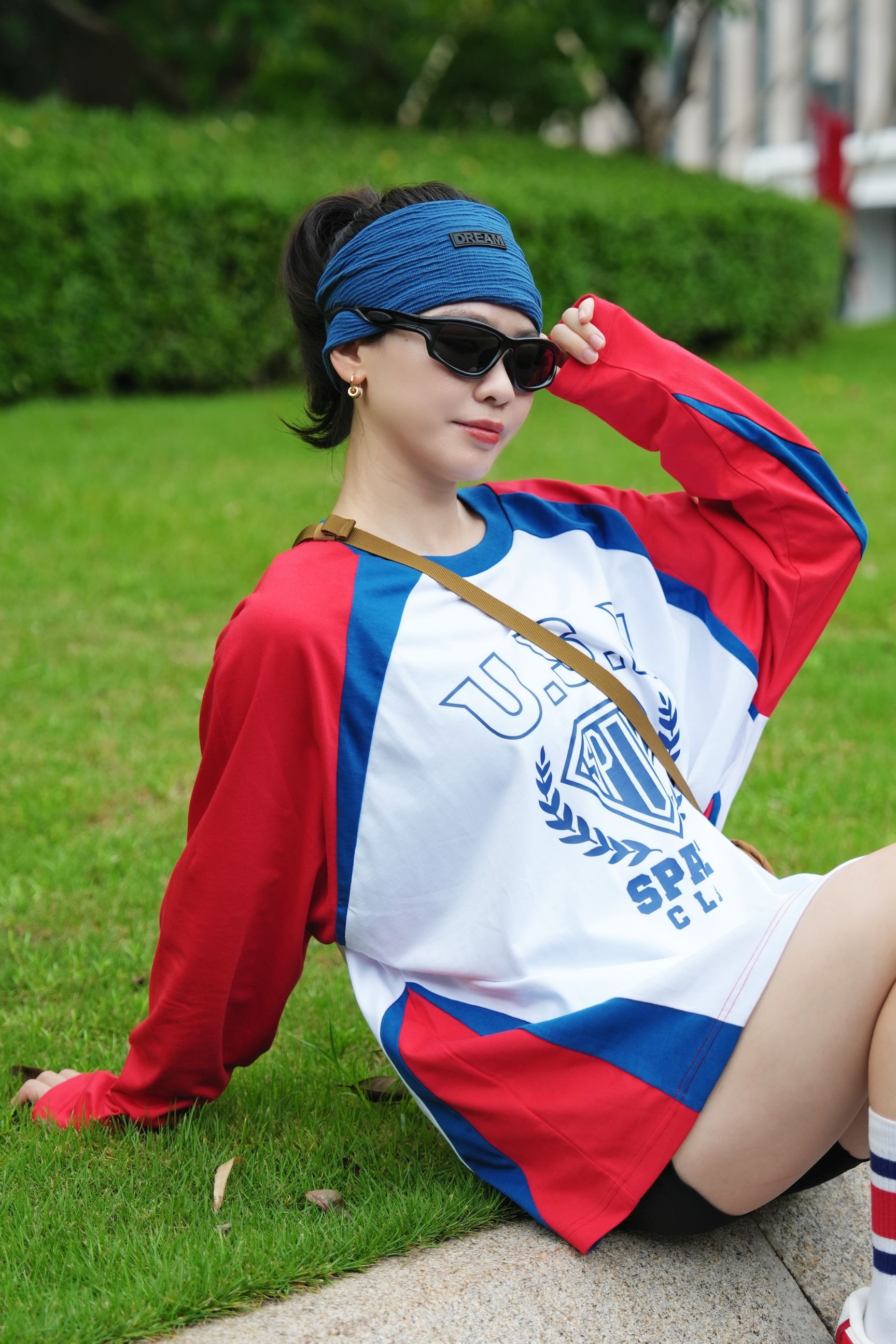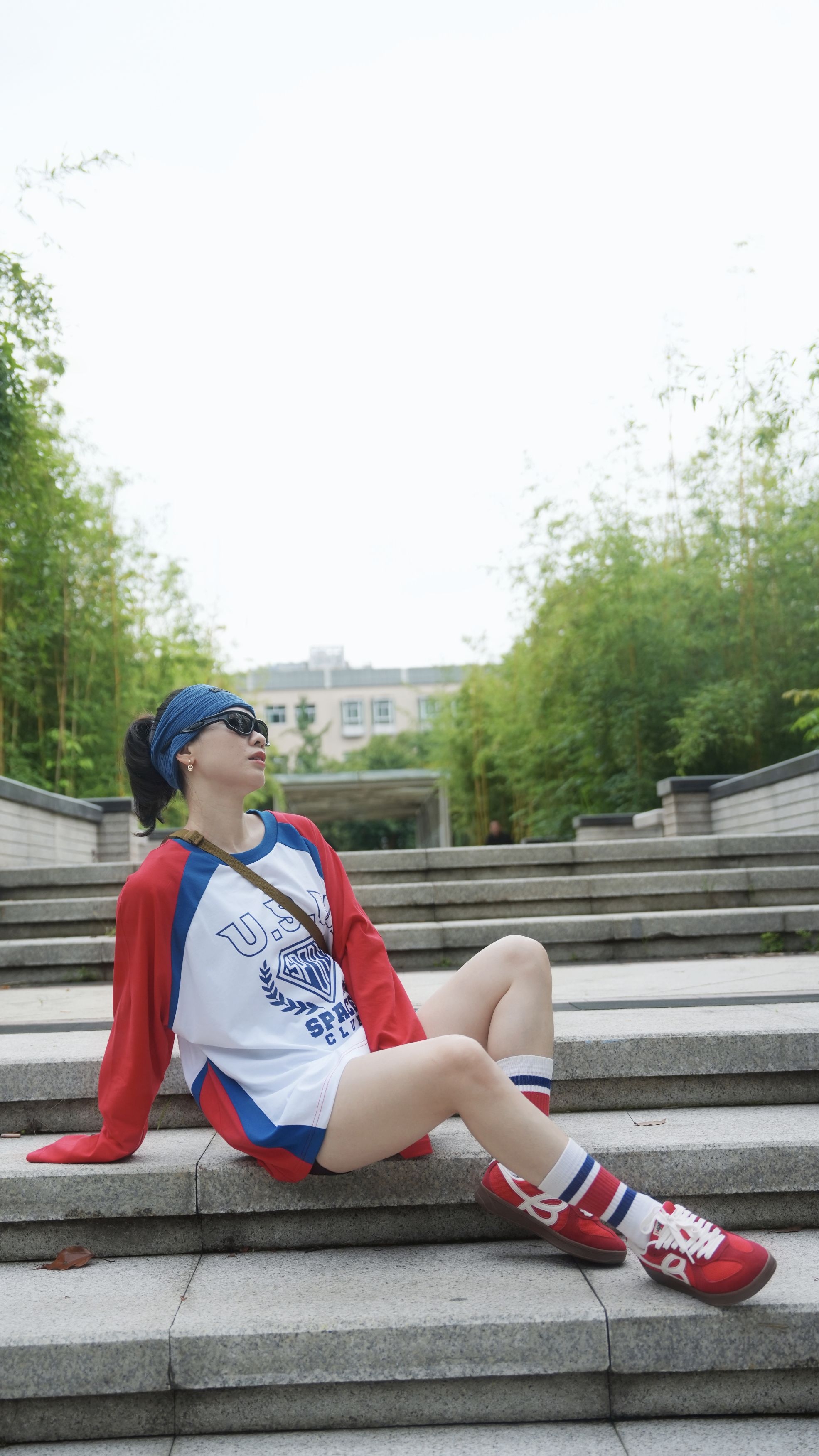 这一身也太适合户外滑板了! - 👚红白蓝拼接上衣,美式复古感拉满,宽松版型超藏肉,搭配一条黑色运动短裤,下半身消失术,辣妹风拿捏🤌 🧦条纹中筒袜+复古红板鞋,配色呼应绝绝子,滑板时也稳稳的 🎧蓝色发带+墨镜,街头酷盖氛围感满满 - 🛹 带着滑板出门遛弯儿啦!