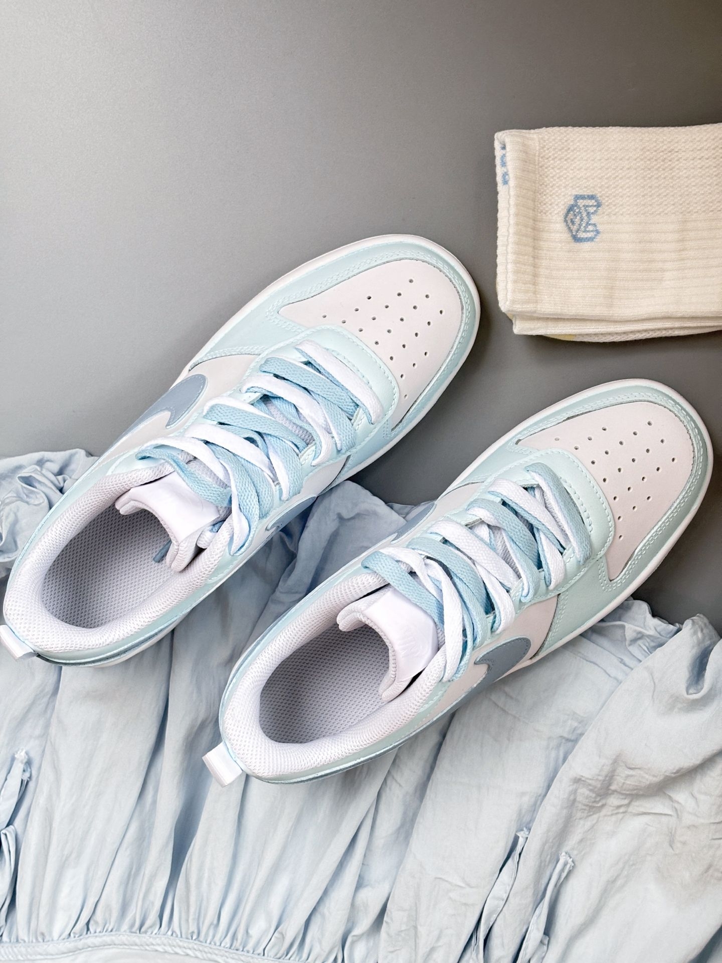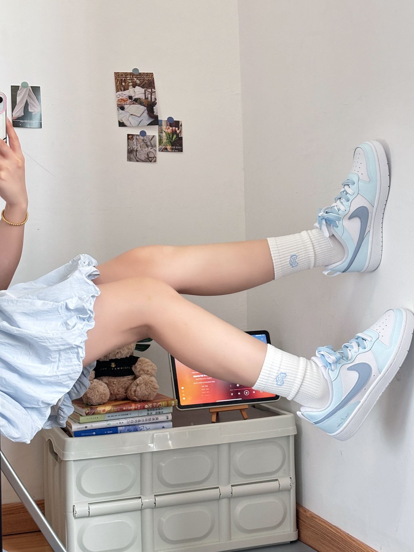 今天穿浅蓝色花苞裙👗配这双小板鞋~ 夏天就爱这种清爽配色~ 双鞋带设计就没那么单调🫧也可以自己分开哟 日常出街搭配牛仔裤👖小裙裙 泰美啦