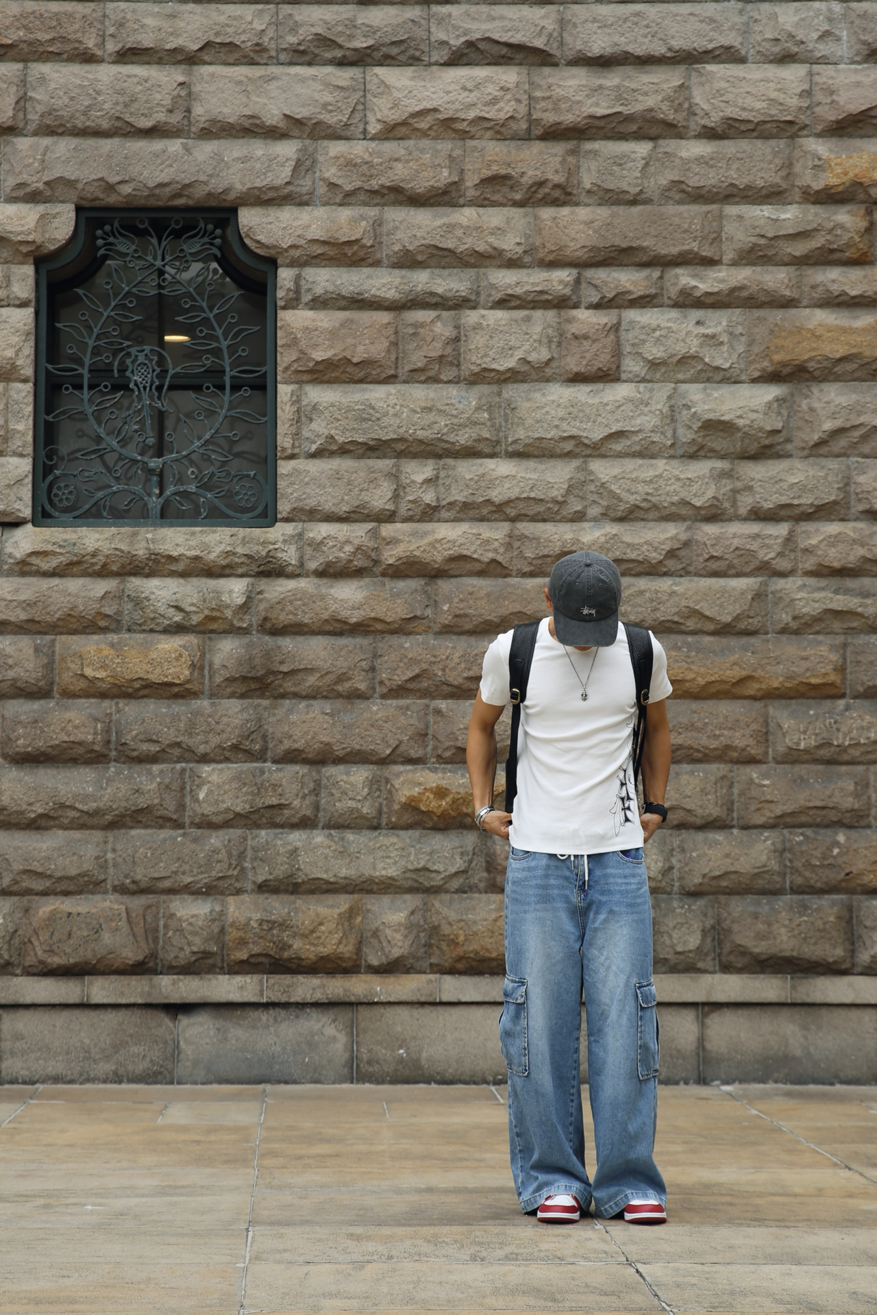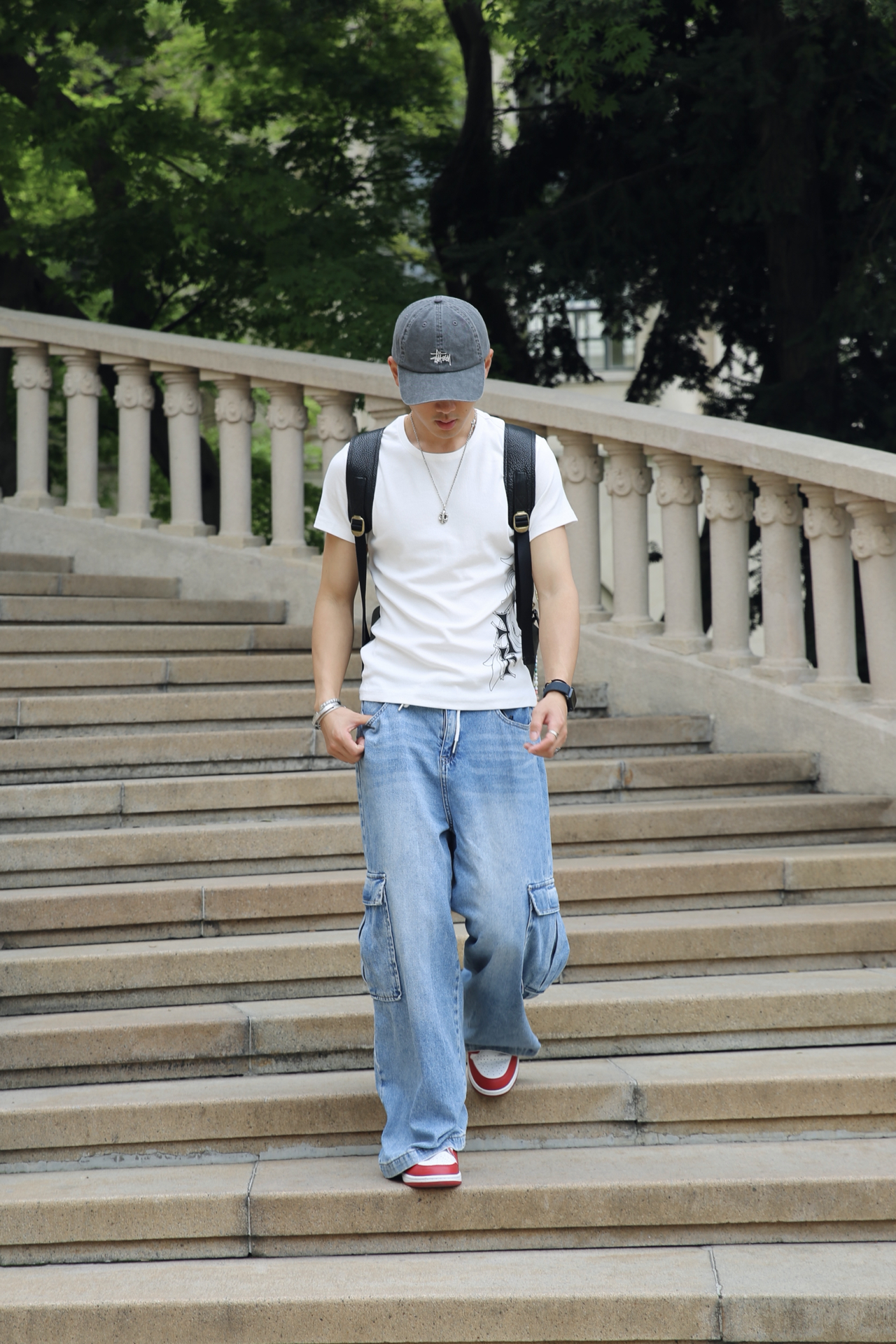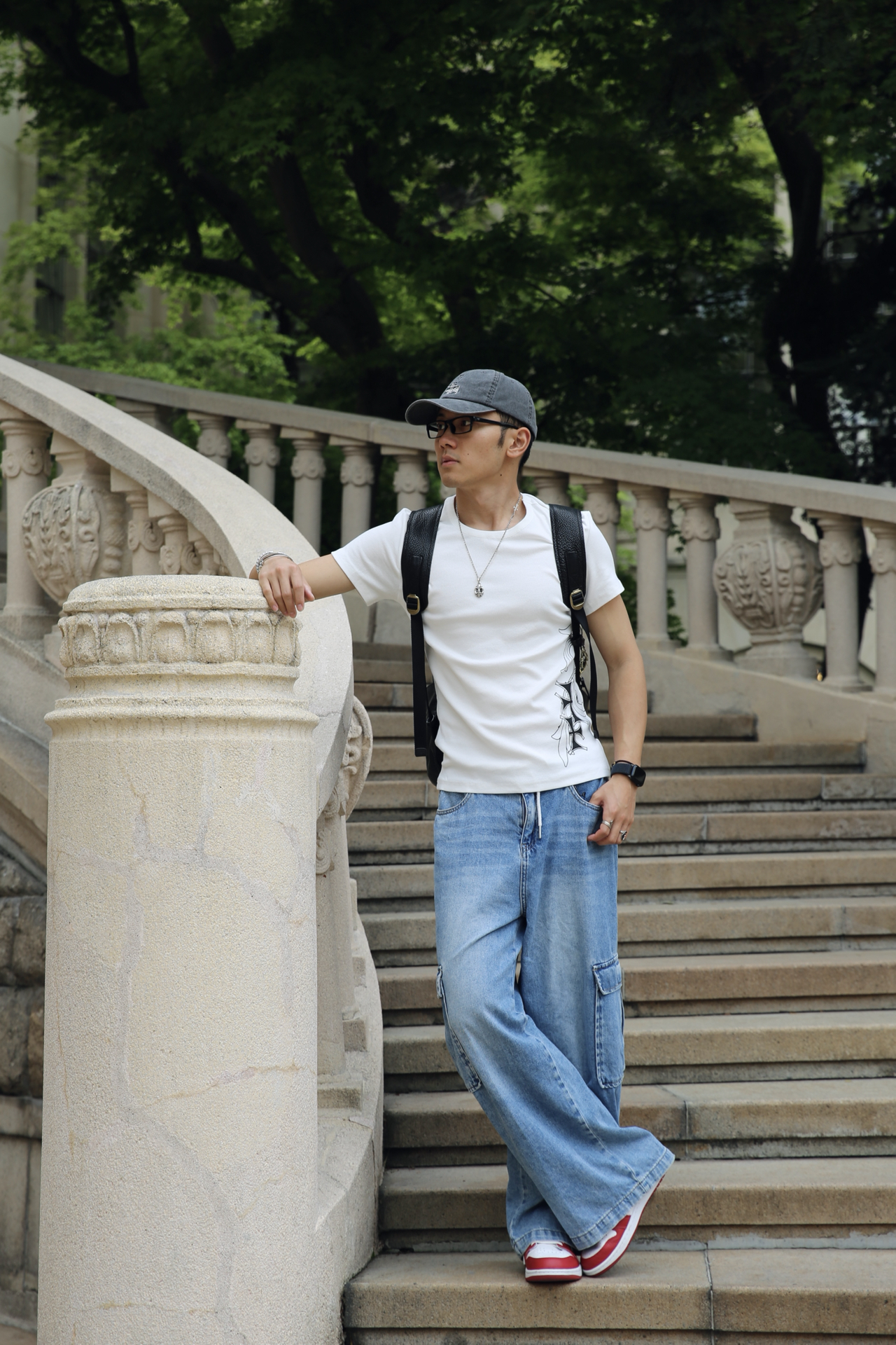 夏天当然得清爽舒服😌 今天给带来一套夏日的简单搭配 上身一件白色短袖修身显壮 加上潮流的印花不单调 下身搭配一条宽松牛仔裤 阳光下清清爽爽 妥妥的街头潮男既视感