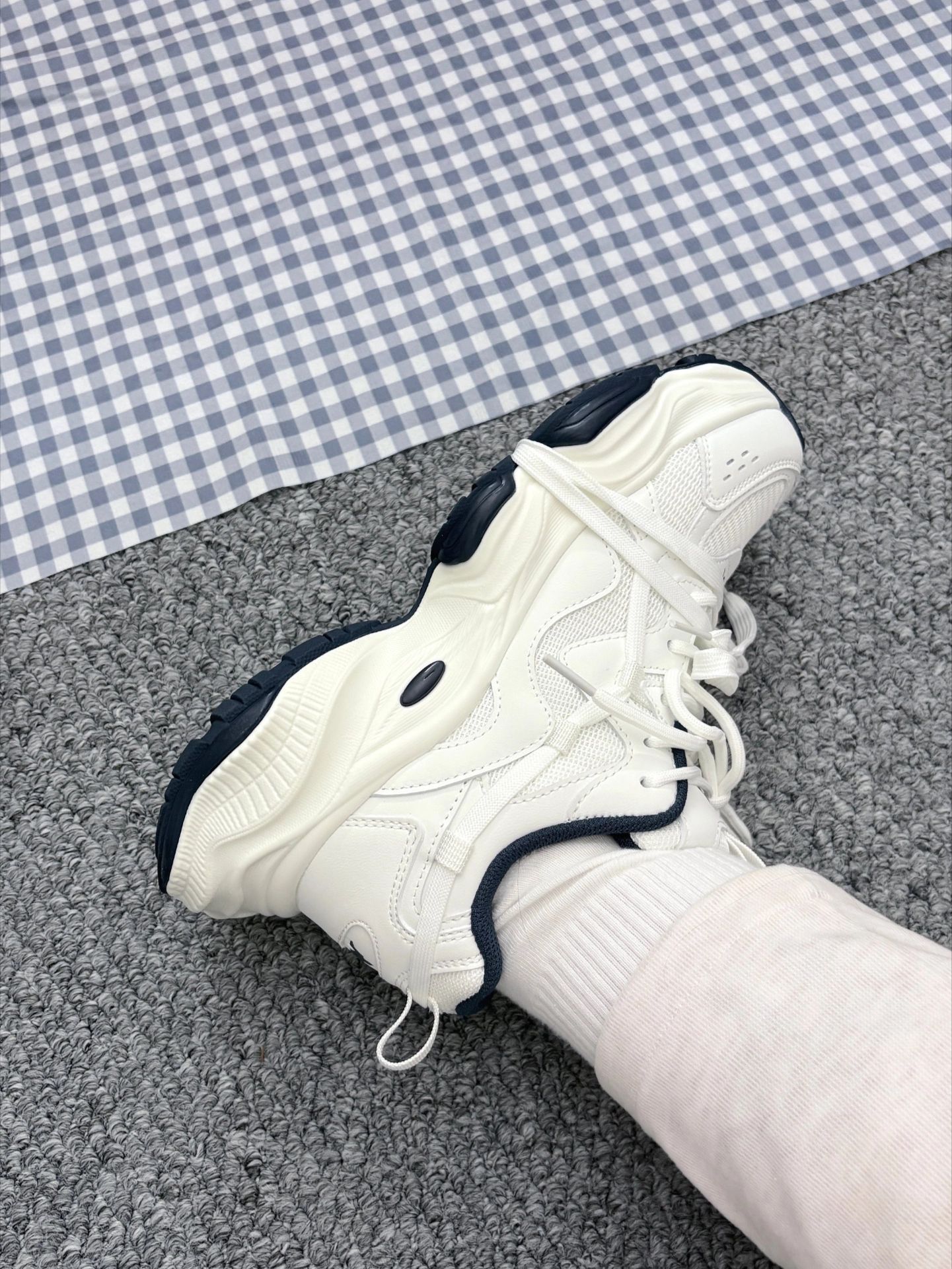 我新收到的老爹鞋好酷啊 生态蓝搭配白色居然hin有少年感。 双层蝴蝶结还蛮有少女心~ 老爹鞋也是有5cm的高度。 各自小个子女生真的还蛮友好。 我穿了一段时间,感觉鞋底软乎乎的。