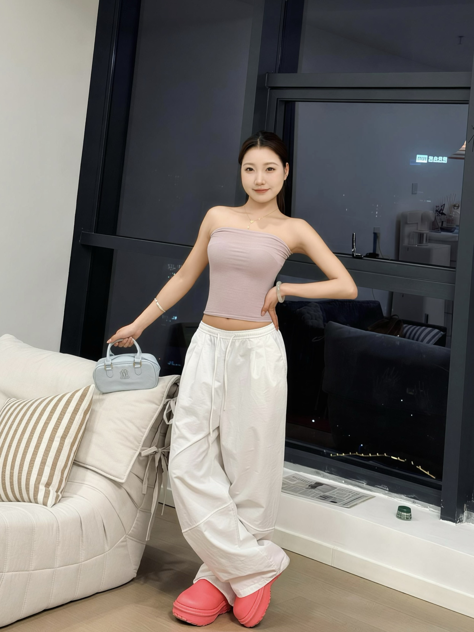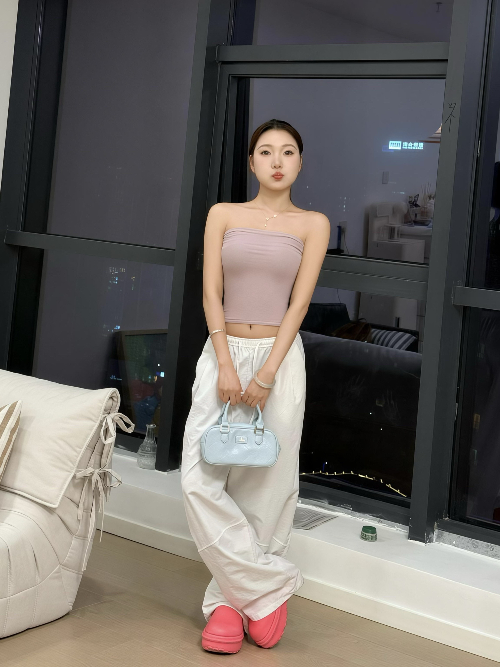 救命!这套真的是我近期最爱的穿搭了😭 低饱和的粉抹胸软乎乎的,像裹了层水蜜桃奶霜,刚好露出肩颈线条,纯欲感直接拉满! 搭配的白色阔腿裤也太懂藏肉了吧!垂坠感绝了,腰上的小肉肉、假胯宽全给你藏得严严实实,上紧下松的比例直接把腿拉成1米8! 踩着粉粉的拖鞋出门,又甜又松弛~