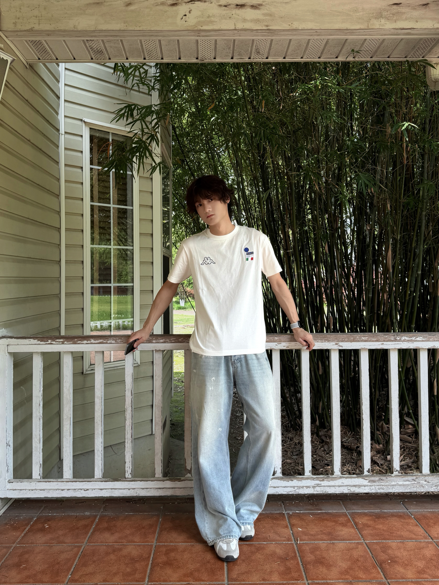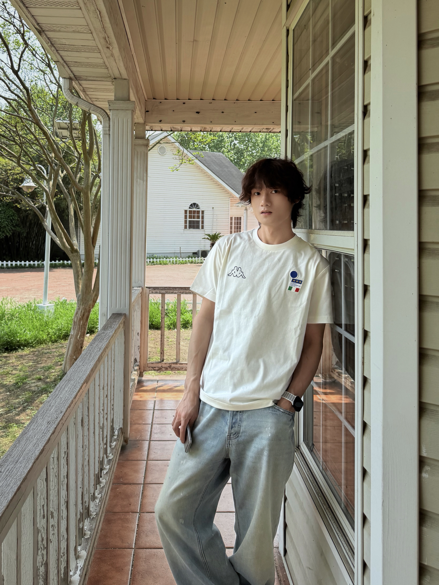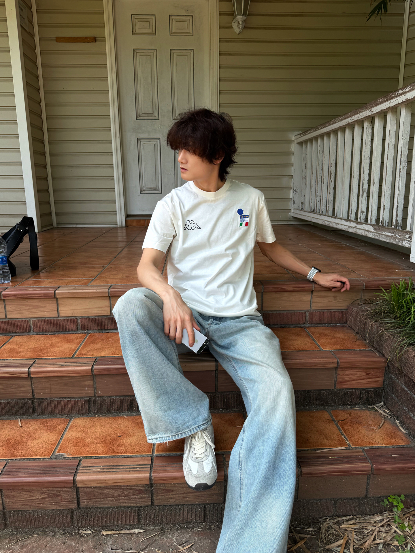 男生夏天的本命穿搭就是白T+牛仔裤😭 这件Kappa白T面料软乎乎的,贴身穿软糯舒服,透气不闷汗 搭配浅蓝阔腿牛仔裤,瞬间拉满少年感 日常出门、散步、通勤都超合适,懒人直接一套穿,舒服又帅气 基础款才是yyds,简单干净的穿搭永远不会过时! 短袖