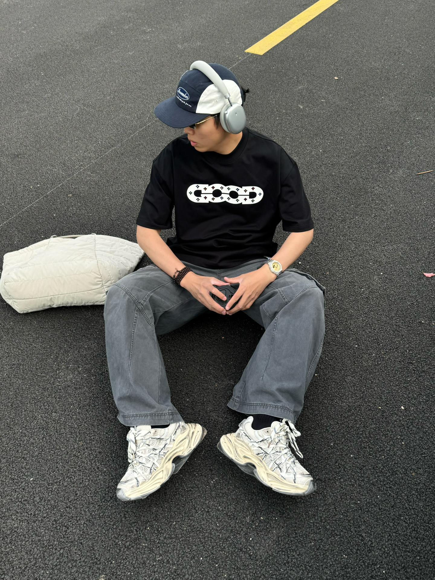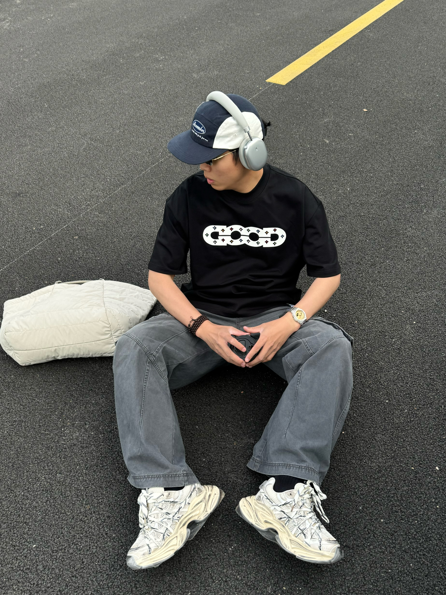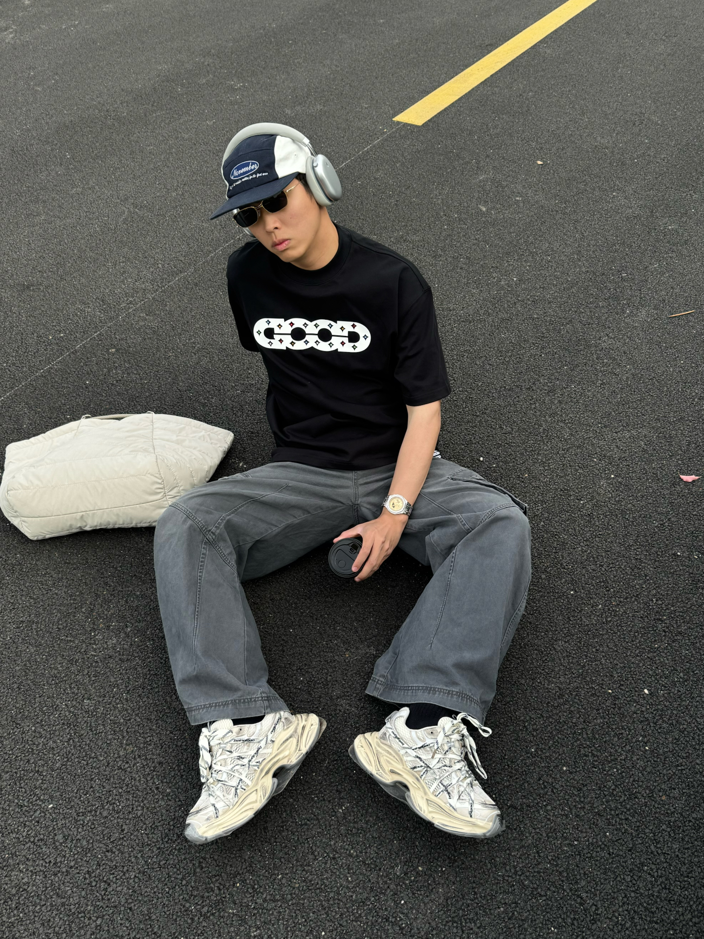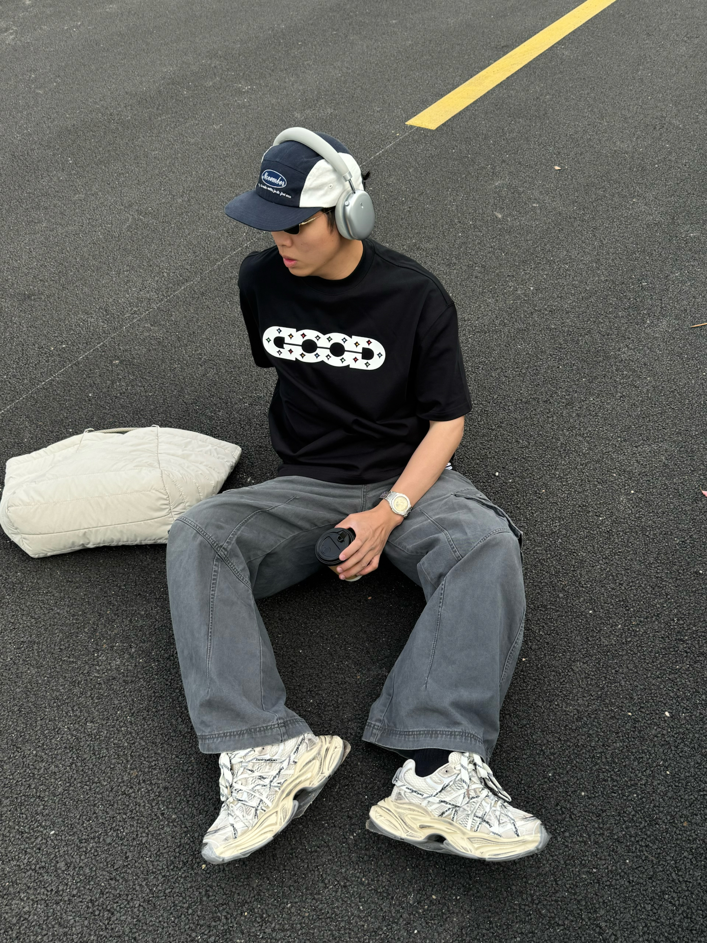 黑T+阔腿裤真的是男生夏日懒人福音 宽松版型舒服不勒肉黑灰配色低调又自带街头感 配上巴黎世家老爹鞋和棒球帽 不用费脑搭配也能穿出松弛帅气感 随便在路边坐着拍都很有感觉