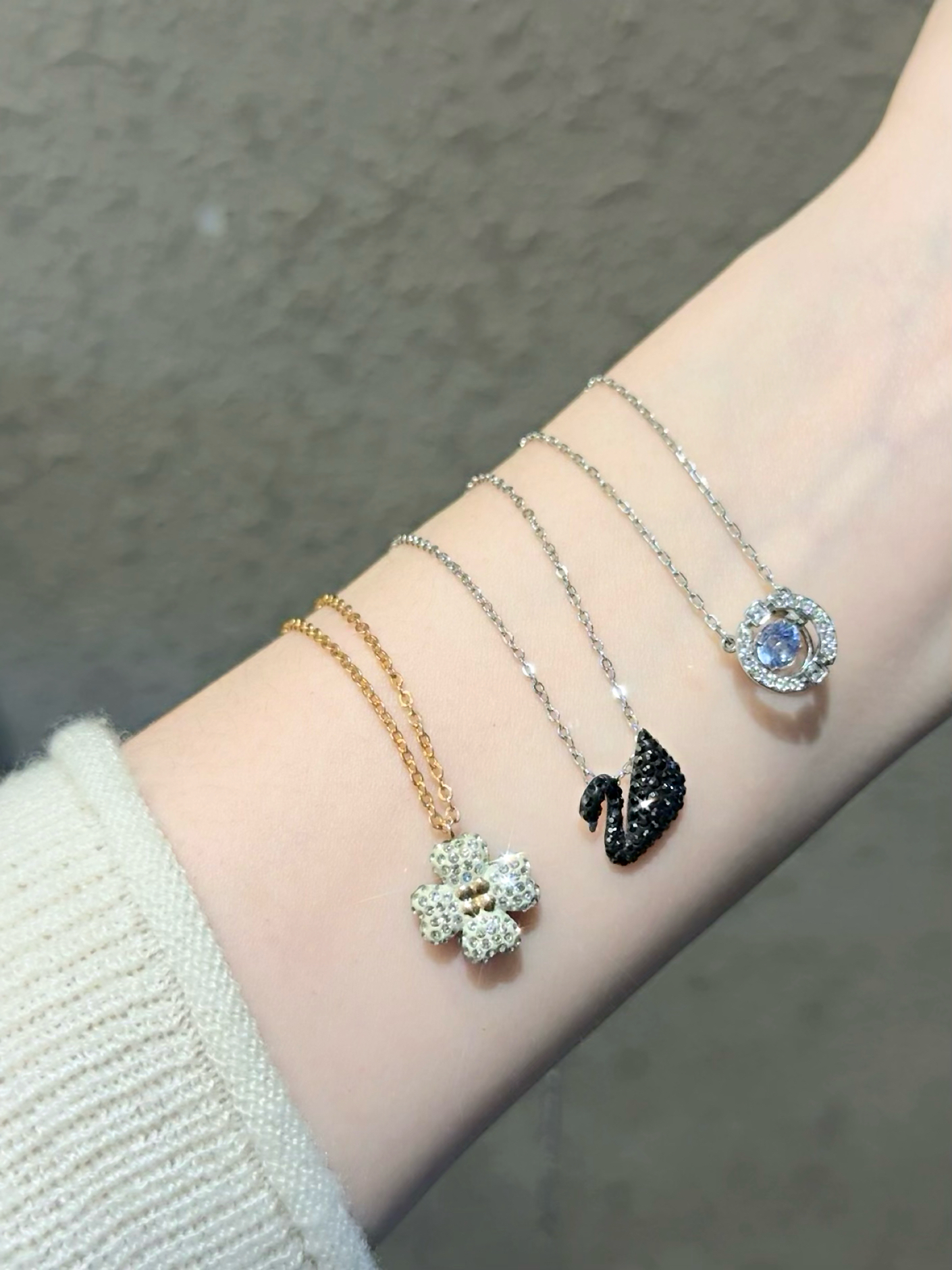 每次拿出来戴都会被惊艳到! 果然是经典永不过时… 黑天鹅🦢:是我入的第一条也是最百搭的一条,小号比较小巧精致,blingbling的小天鹅戴在脖子上有种清冷高贵感,搭什么衣服都好看。 跳动的心💙:又美又仙,蓝色超级显白挺适合夏天,中间的蓝钻是可以动的,很灵动。我一般穿裙子就戴它~ 四叶草🌟:黑白双面配色搭配玫瑰金链条,蛮显白的,有种千金贵气感。 买了几年也没有变黄掉钻,换着戴的快乐谁懂🥹 #超闪锁...