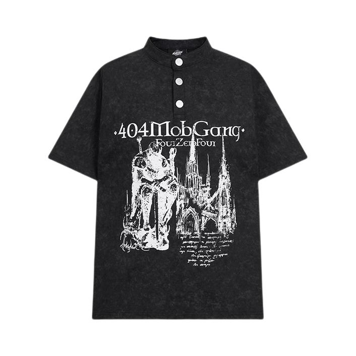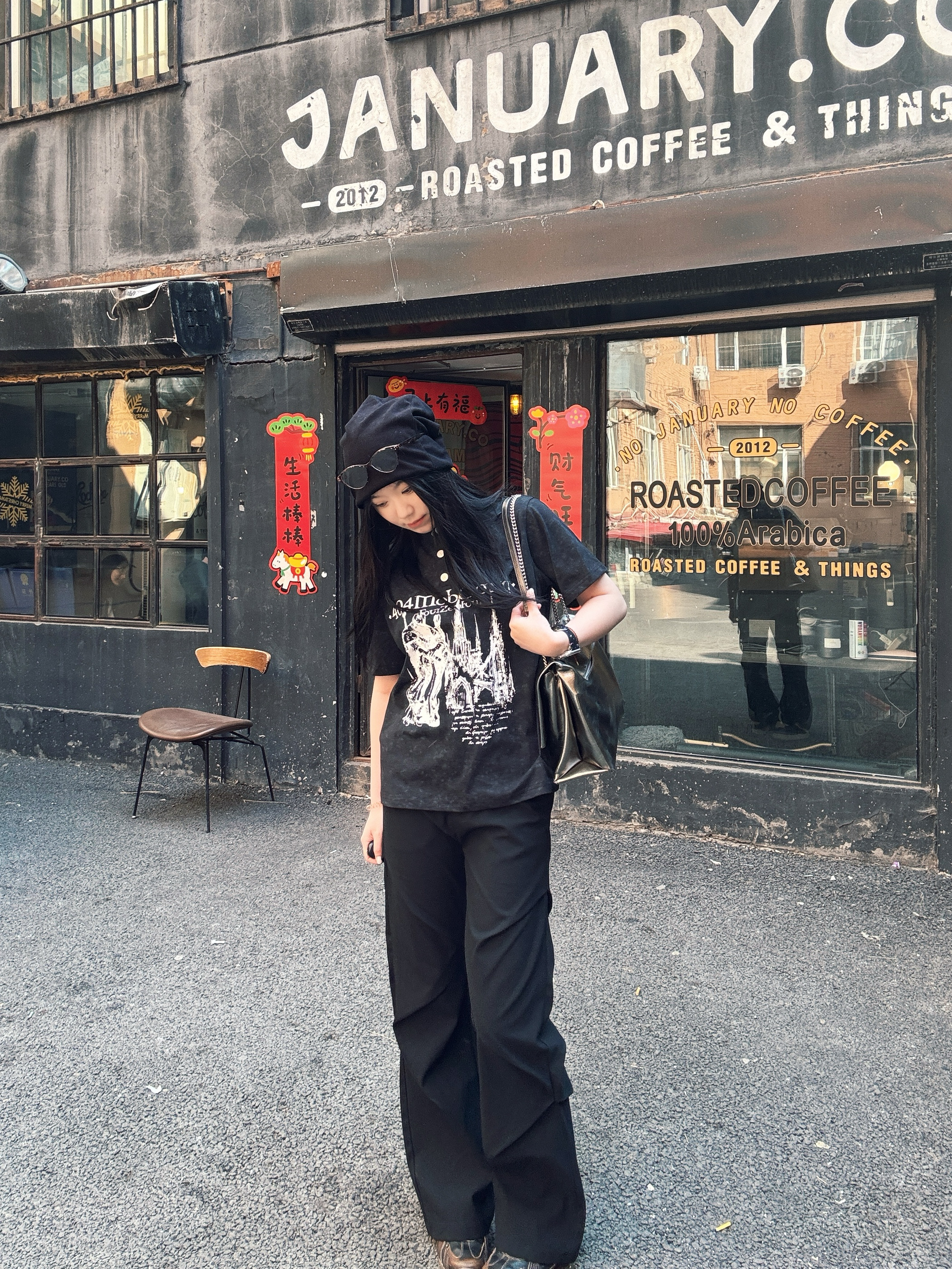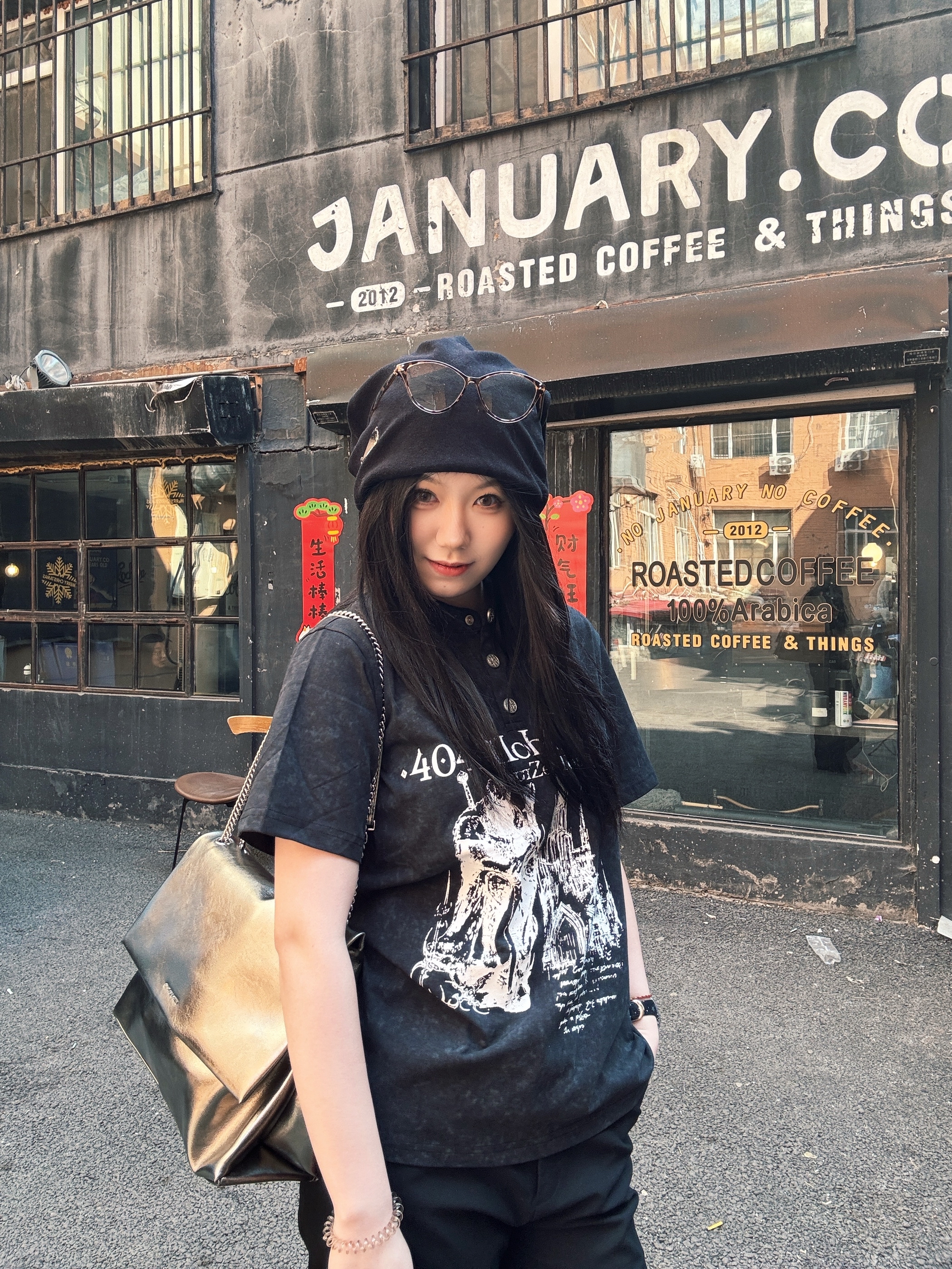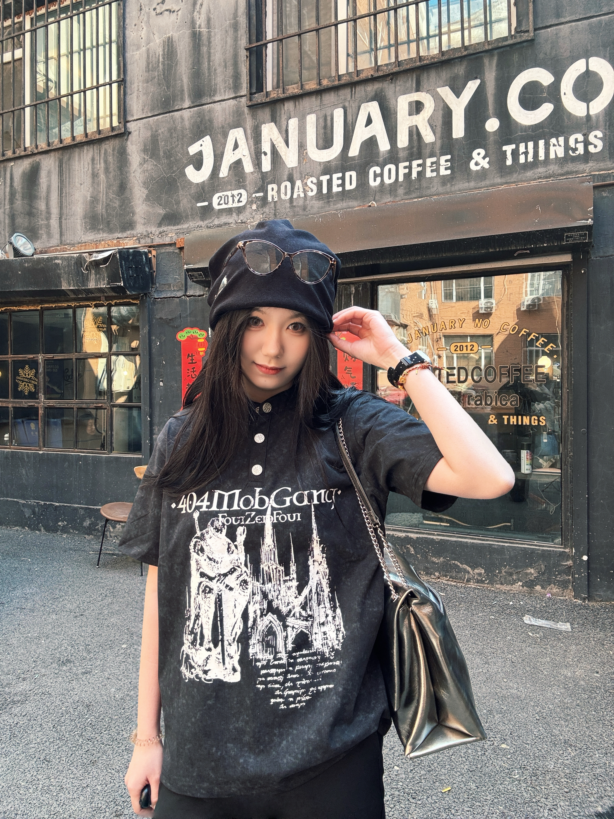 做旧黑调自带颓废氛围感⚫️ 哥特城堡与手写字体碰撞 宽松版型慵懒随性📷 搭配冷感配饰 拿捏街头亚文化甜酷感 防晒凉感面料夏季友好☀️