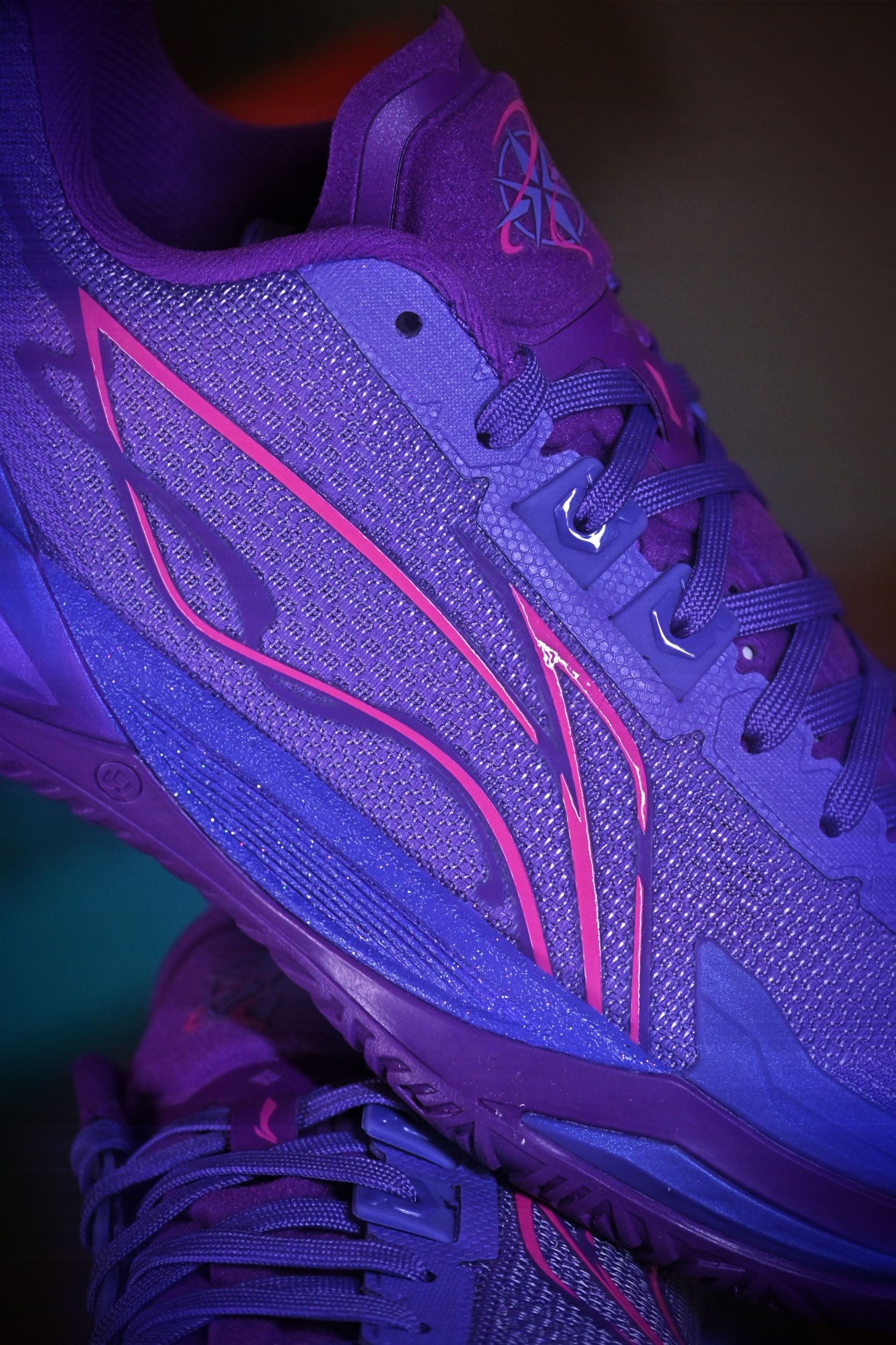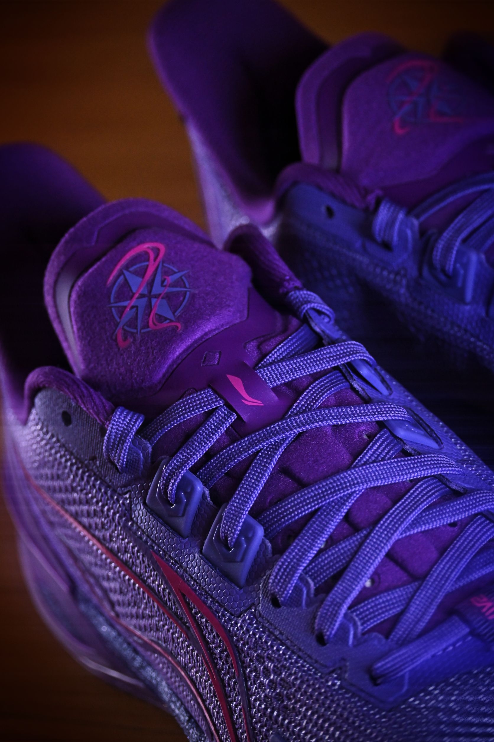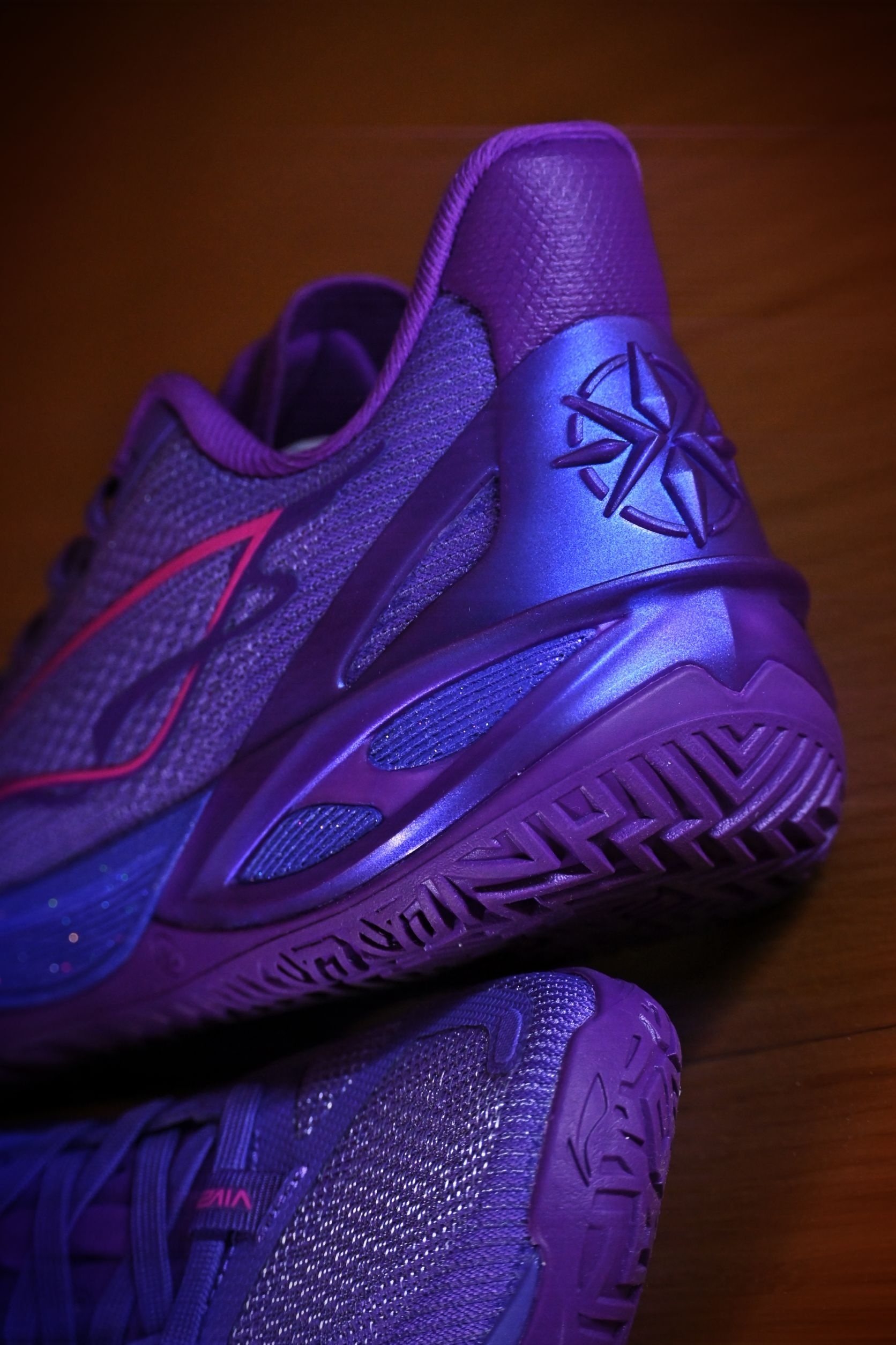 这双“望舒”真是我这个月的多巴胺来源。 利刃6V2把月色洒在鞋面上,深紫色的渐变像傍晚六点半的晚霞。 上脚第一感觉——轻,韧,贴。 跑动时滚动感很自然,变向不拖沓,打完球还忍不住低头看两眼。 不是那种张扬的实战鞋,但每次穿它,心情就像踩在月光里,舒服又带劲。