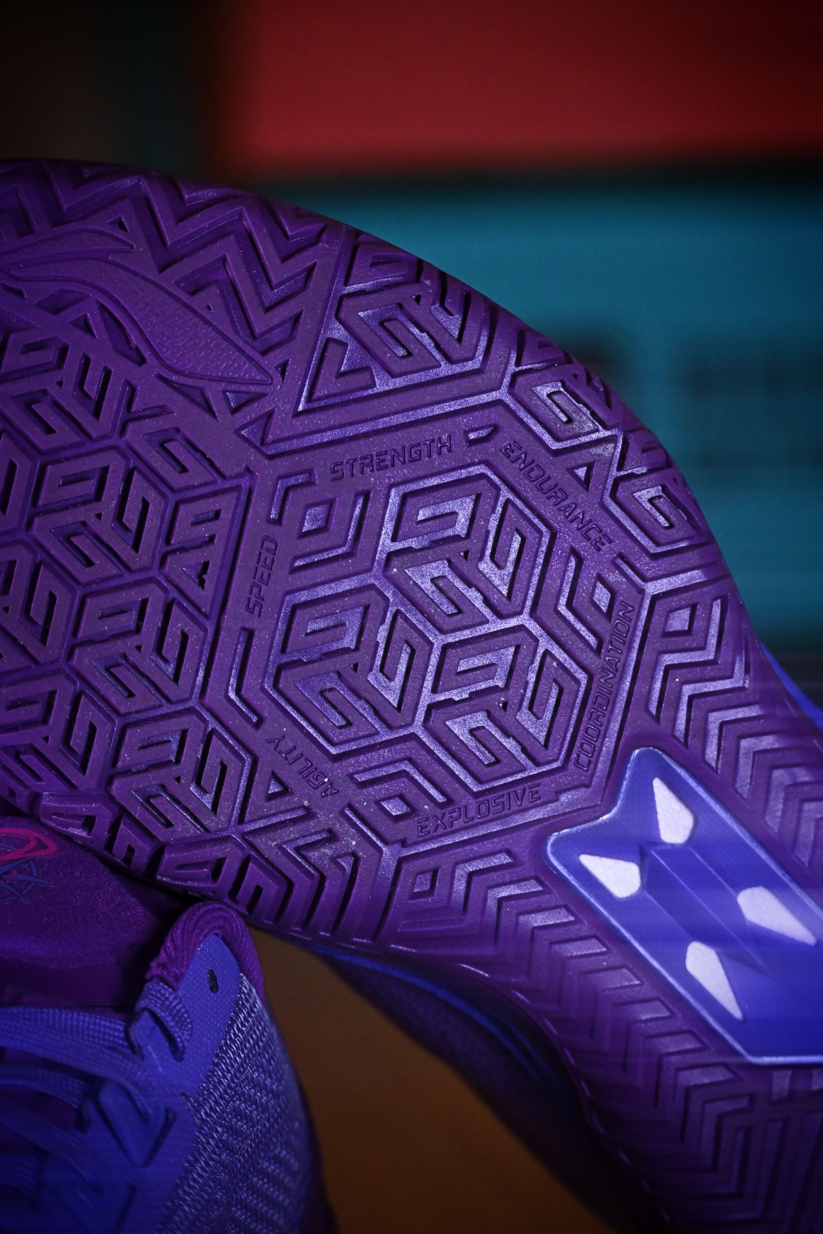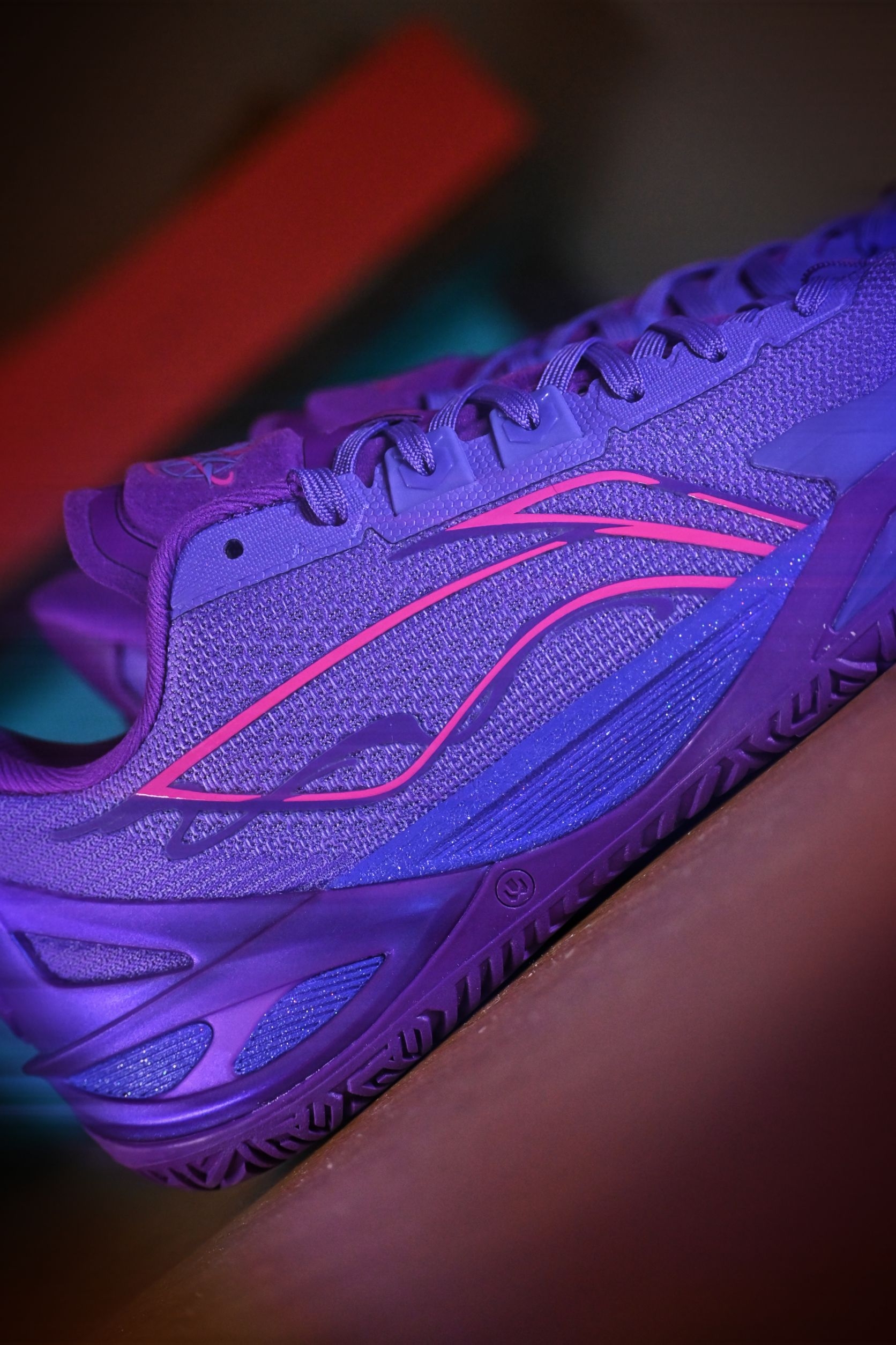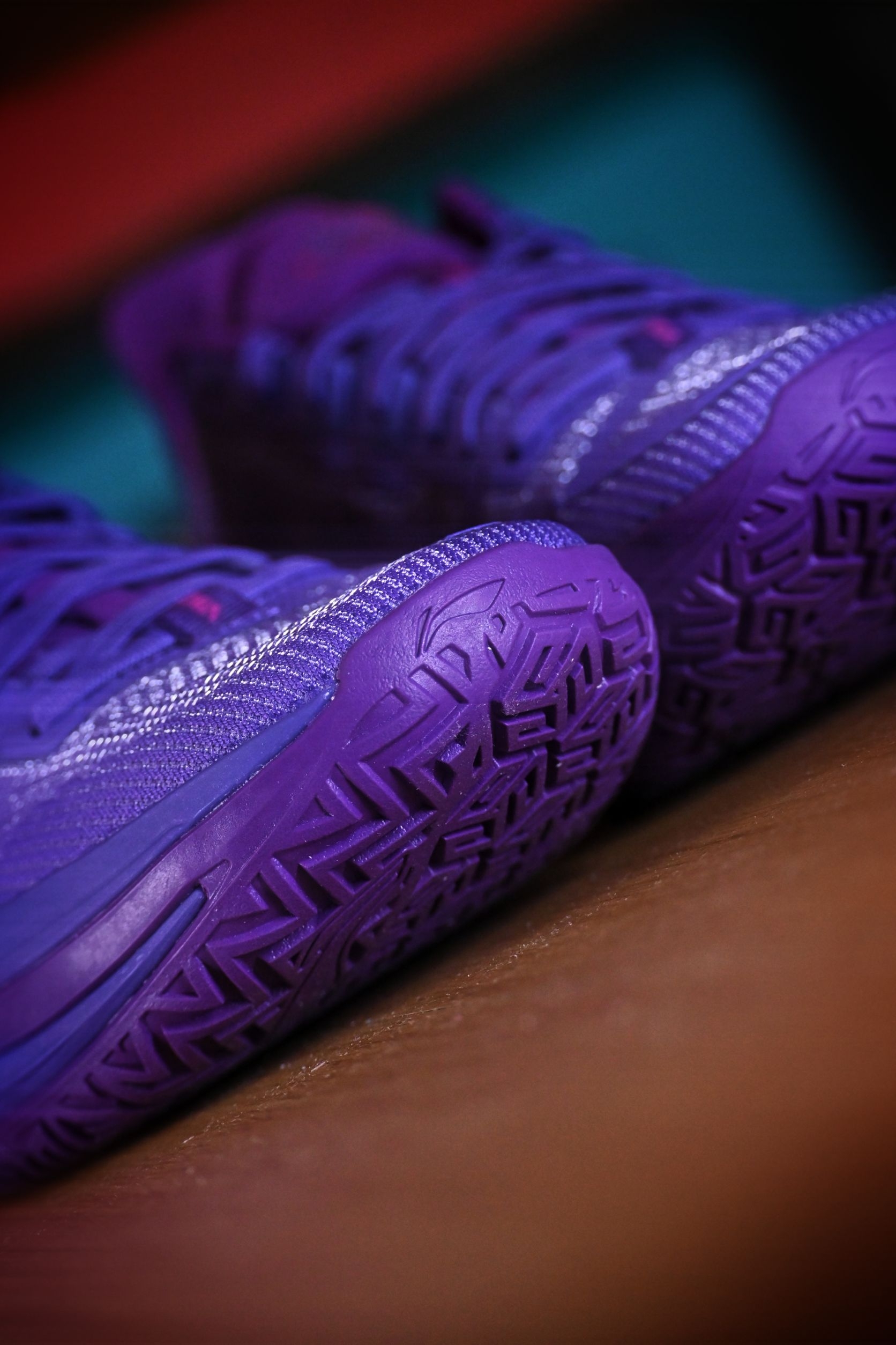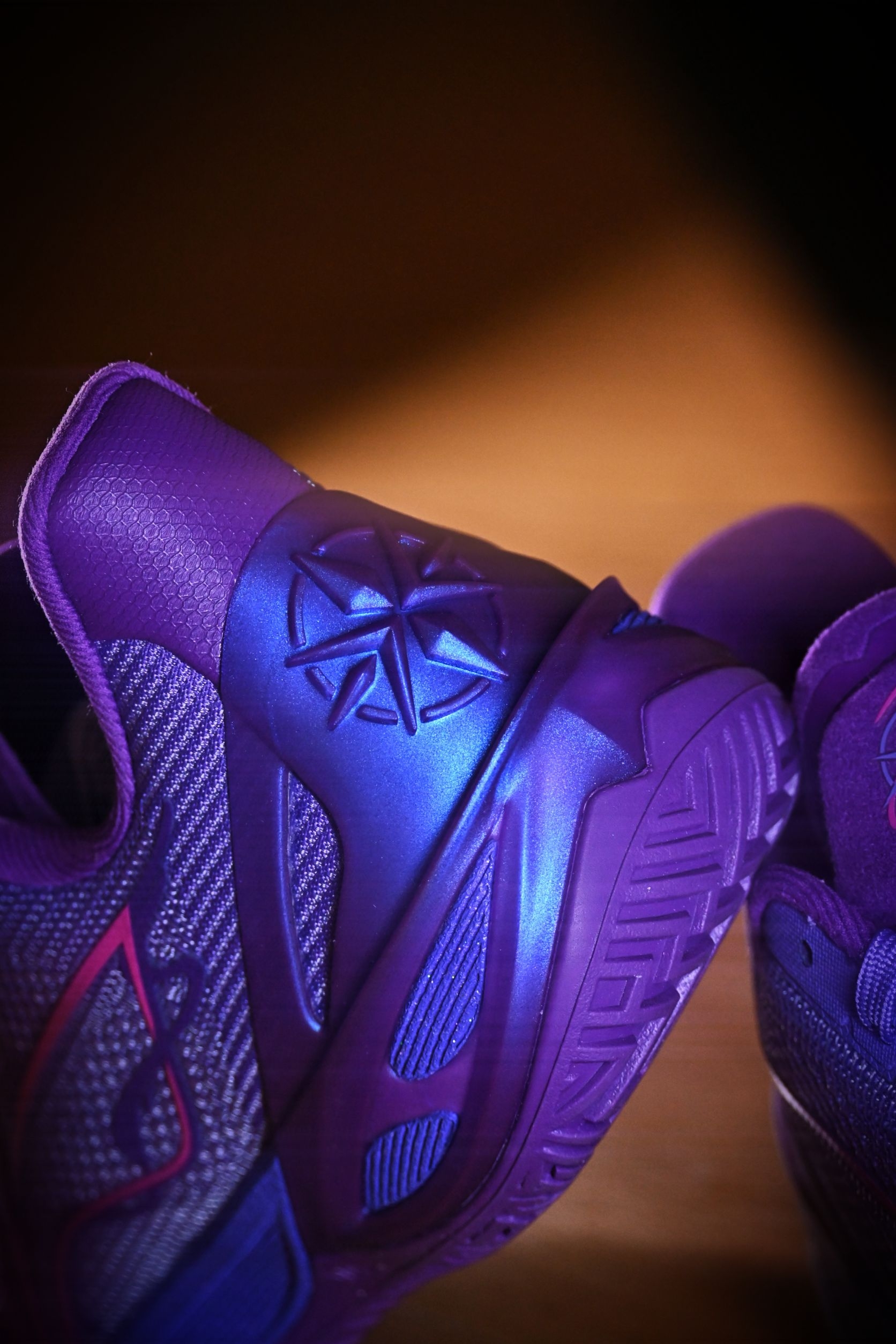 这双“望舒”真是我这个月的多巴胺来源。 利刃6V2把月色洒在鞋面上,深紫色的渐变像傍晚六点半的晚霞。 上脚第一感觉——轻,韧,贴。 跑动时滚动感很自然,变向不拖沓,打完球还忍不住低头看两眼。 不是那种张扬的实战鞋,但每次穿它,心情就像踩在月光里,舒服又带劲。